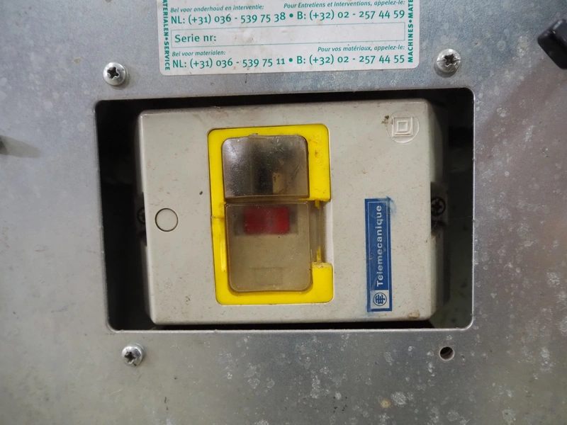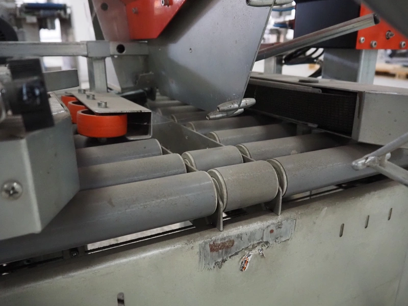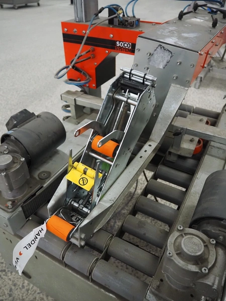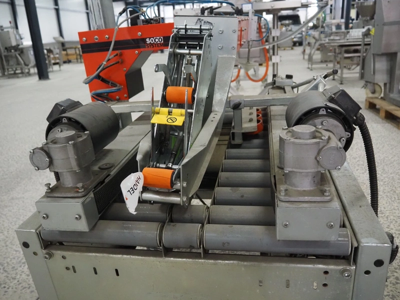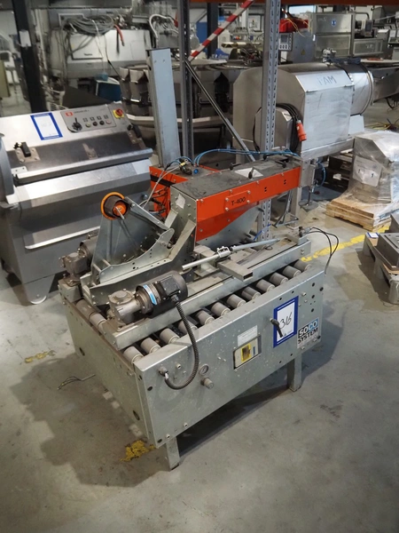 Soco System box closing machine, model: T-400, number: 06-98, year of construction: 1997, 400 V, 3 Ph, 10 A, 250 W, roller width: 400 mm, total dimensions: 1250 mm x 900 mm x 1540 mm. Damaged.