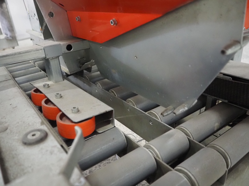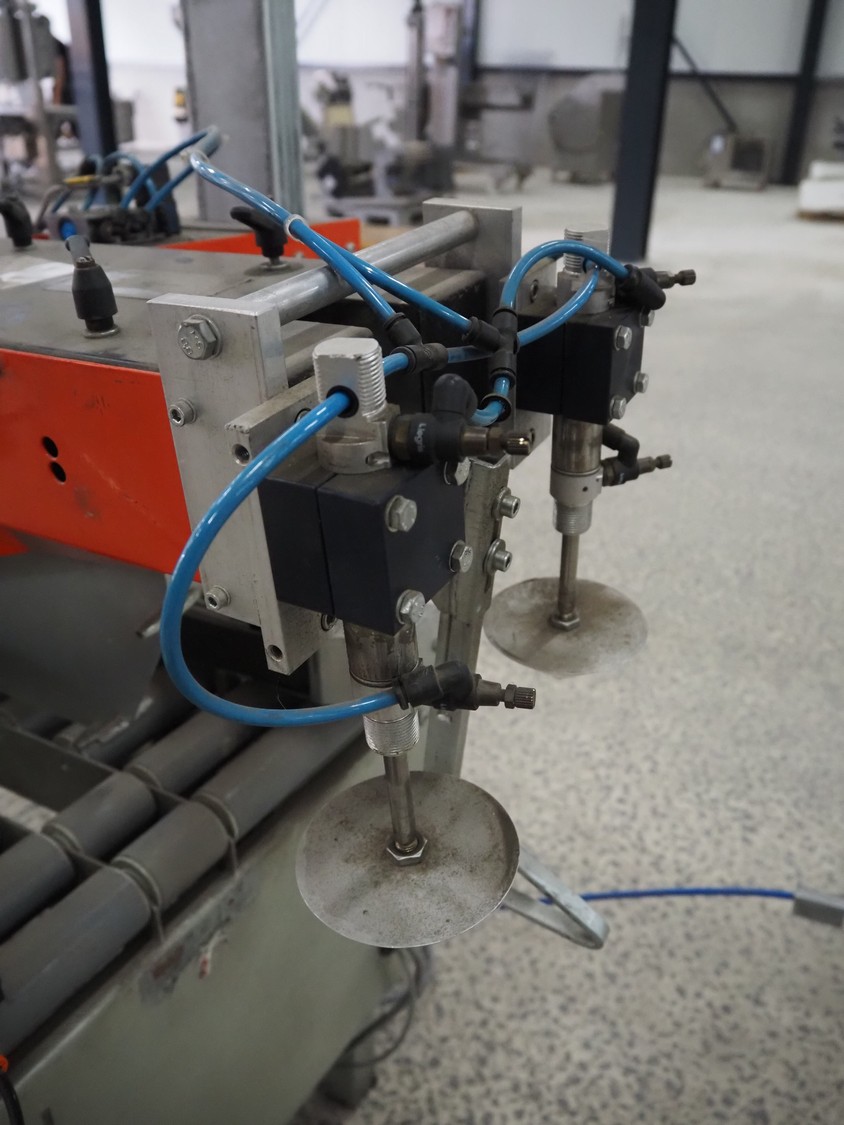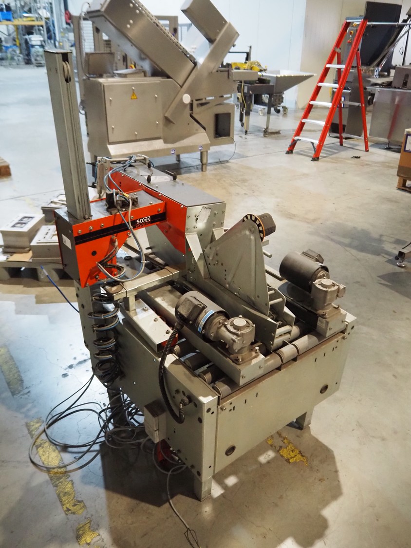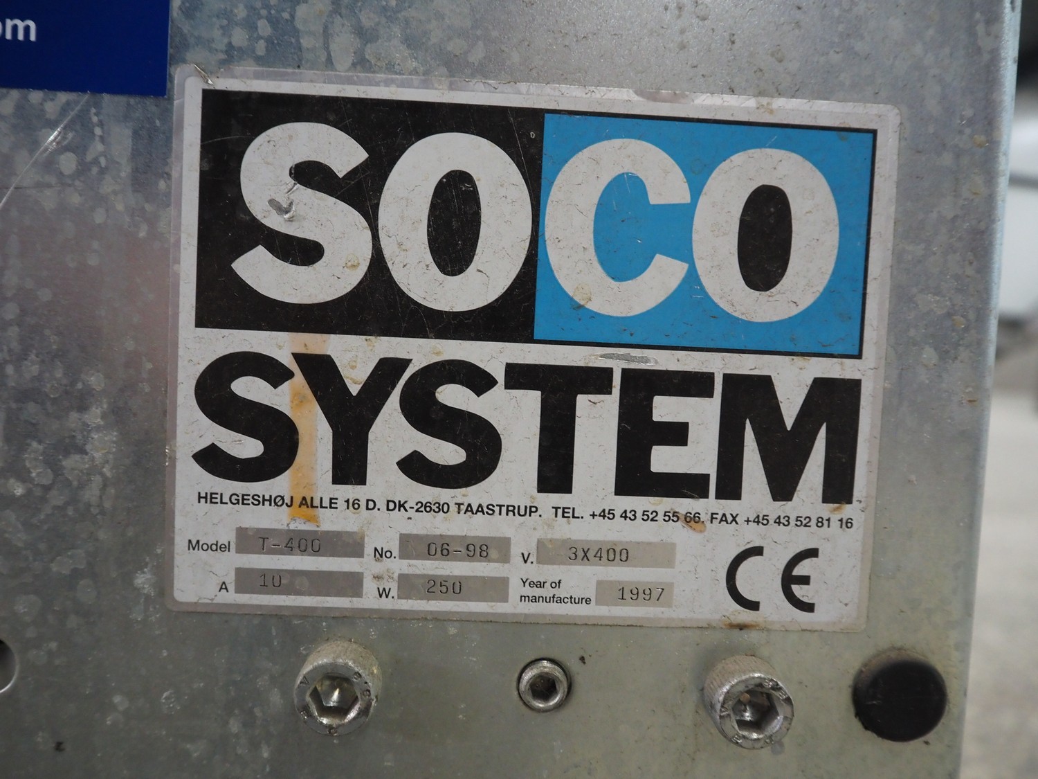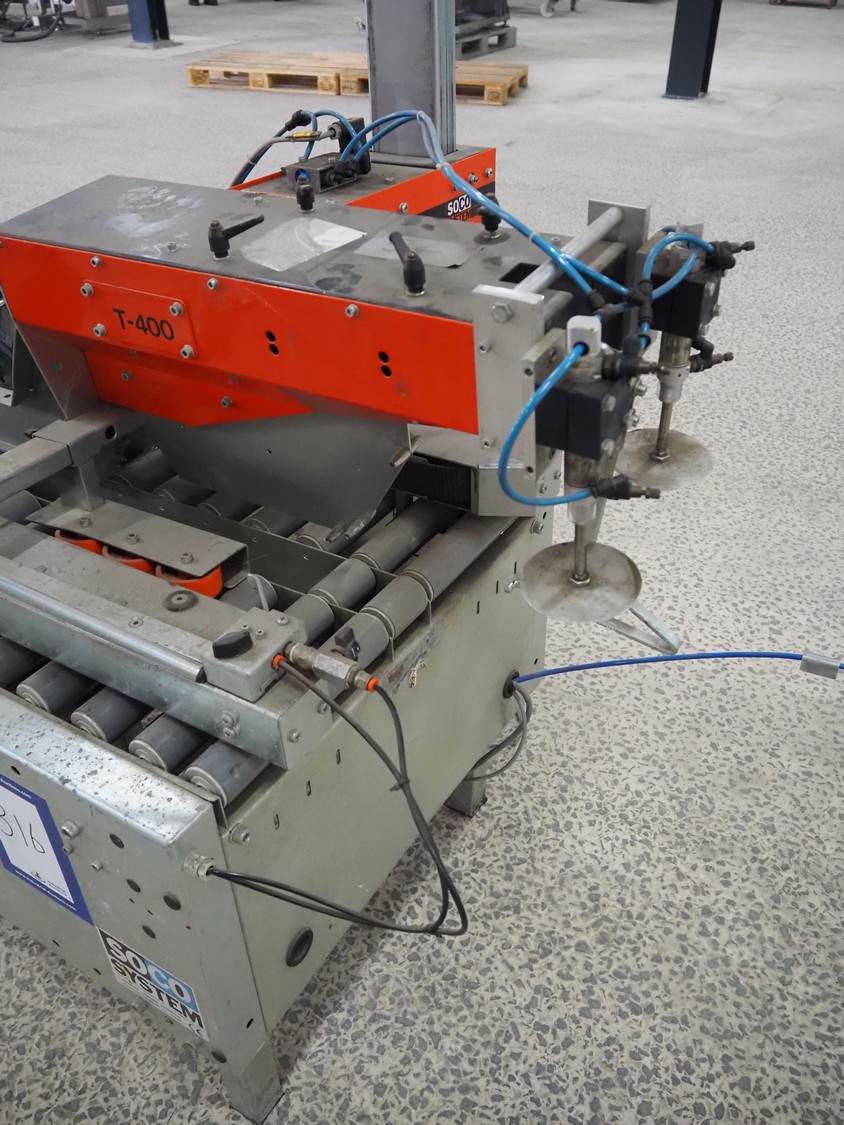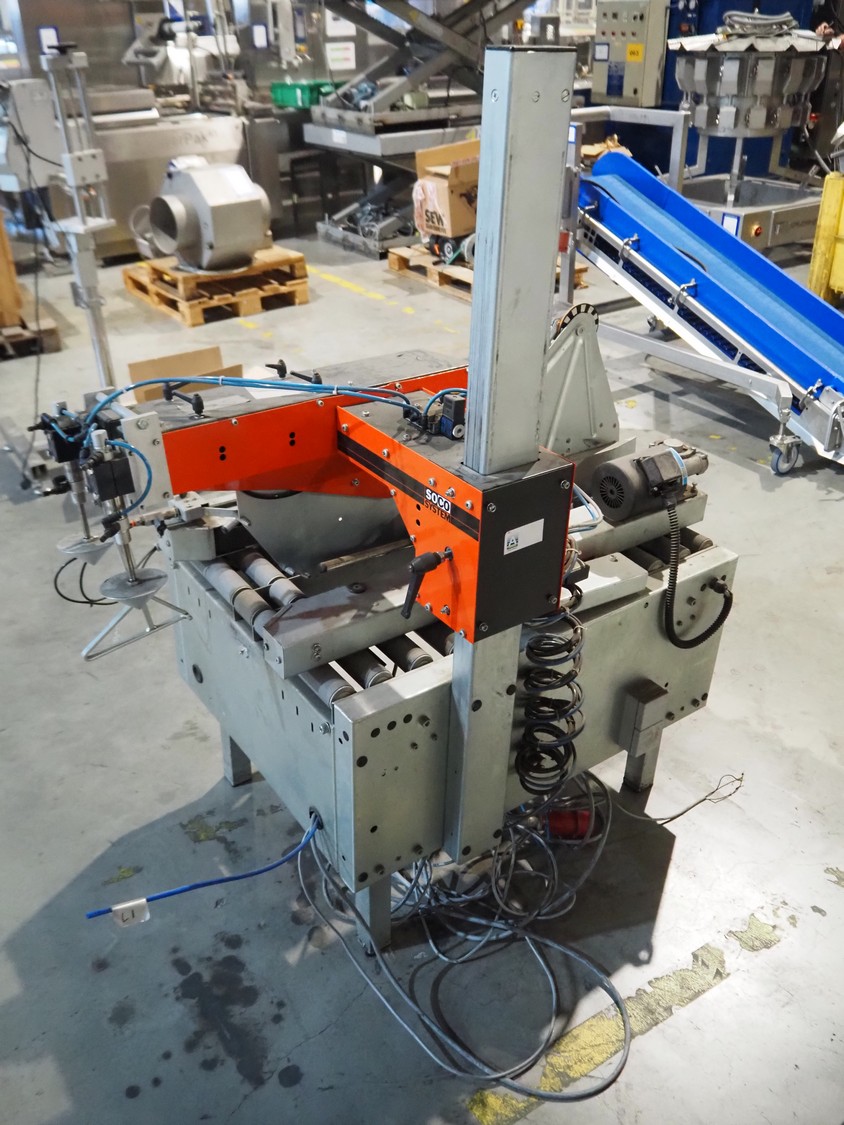 Soco System box closing machine, model: T-400, number: 06-98, year of construction: 1997, 400 V, 3 Ph, 10 A, 250 W, roller width: 400 mm, total dimensions: 1250 mm x 900 mm x 1540 mm. Damaged.