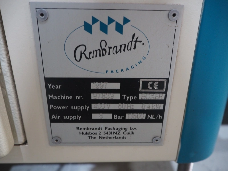 Rembrandt box folding and closing machine, type: BOXER, machine number: 97839, year of construction: 1997, 400 V, 50 Hz, 0.4 kW, 6 bar, dimensions: 2200 mm x 2200 mm x 1550 mm.