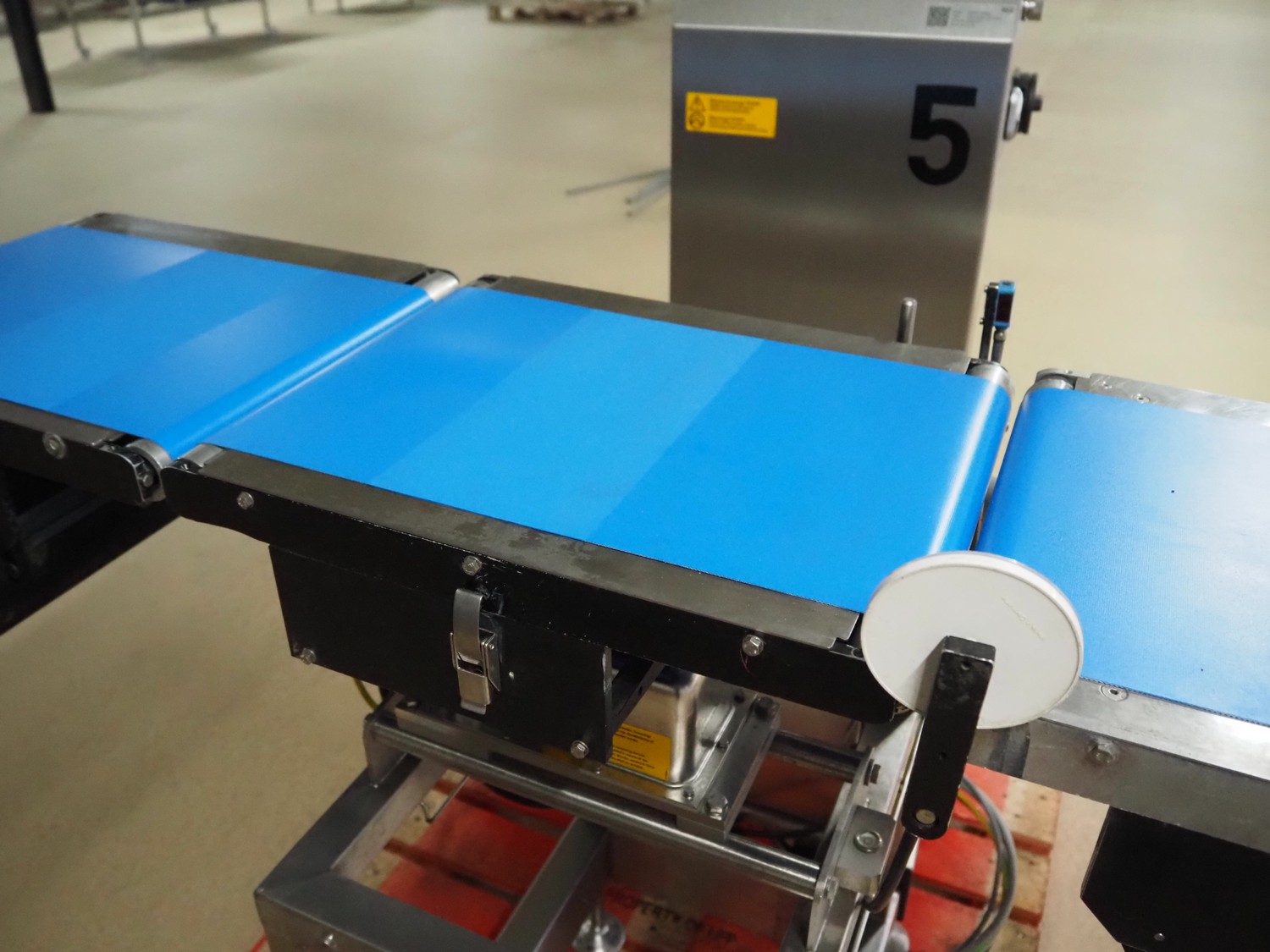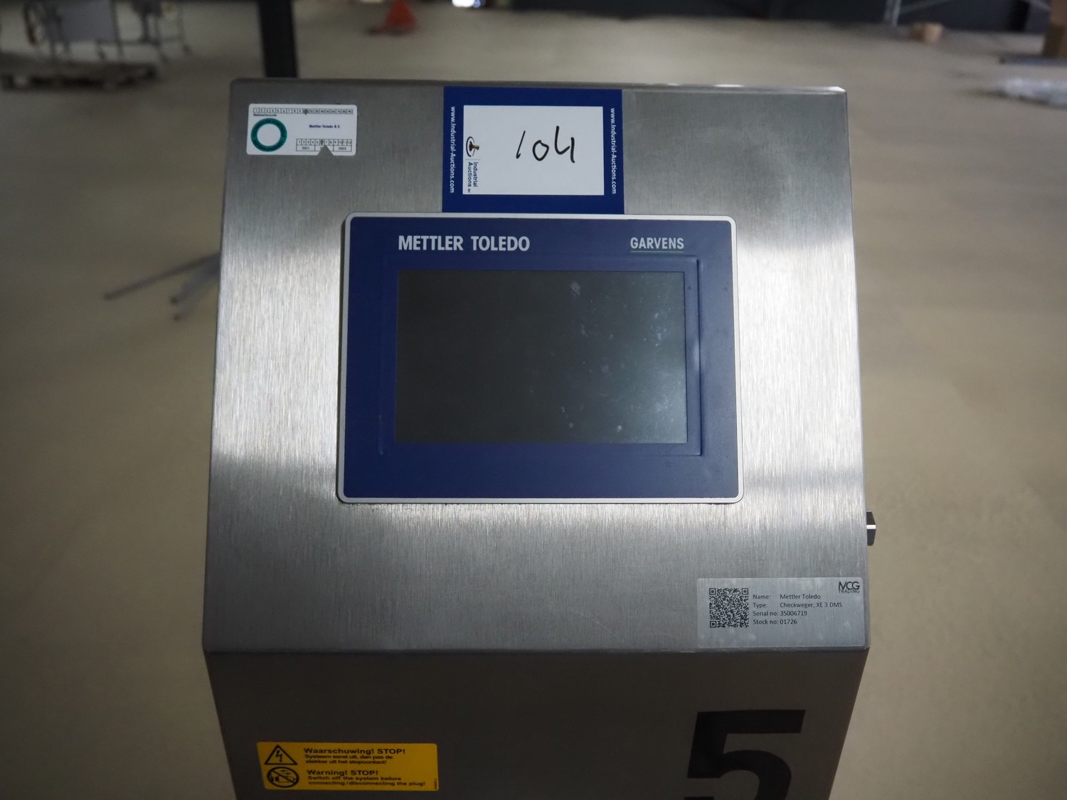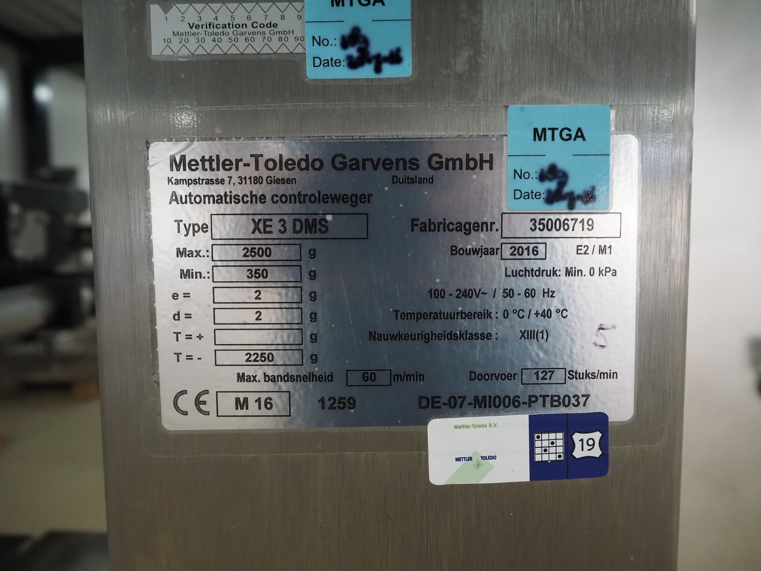 Mettler Toledo Garvens checkweigher, type: XE 3 DMS, fabrication number: 35006719, year of construction: 2016, 100-240 V, 50-60 Hz, maximum weight: 2500 gram, minimum weight: 350 gram, e=d=: 2 gram, T=- 2250 gram, plastic belt, belt width: 280 mm, total dimensions: 1350 mm x 1100 mm x 1700 mm.