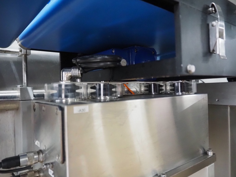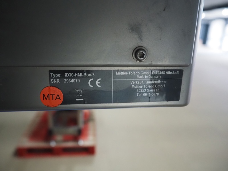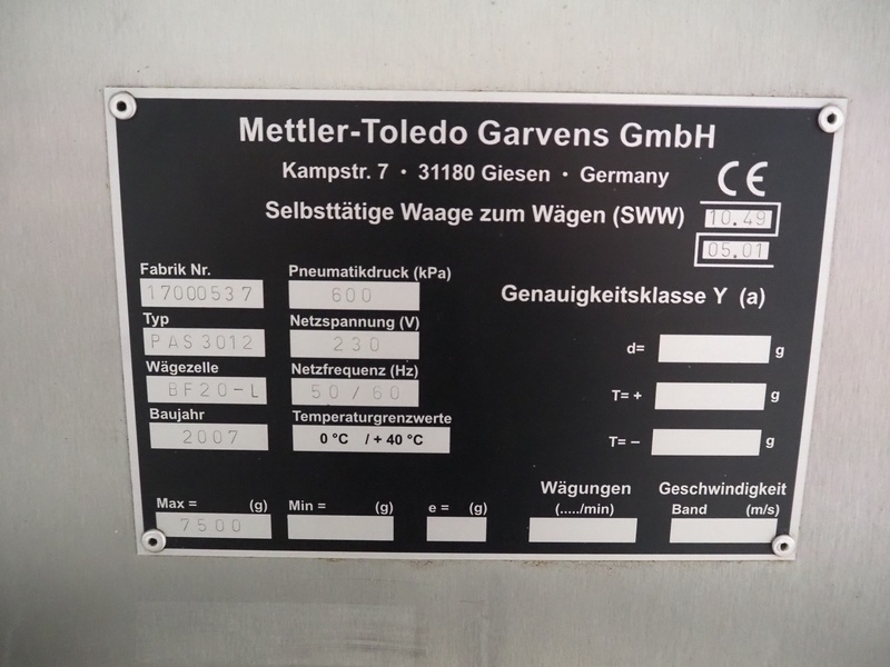 Mettler Toledo Garvens checkweigher with rejector, type: PAS3012, number: 17000537, year of construction: 2007, 230 V, 50/60 Hz, 600 kPa, maximum: 7500 gram, plastic belt, belt width: 300 mm, total dimensions: 1750 mm x 1000 mm x 1850 mm.