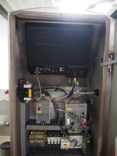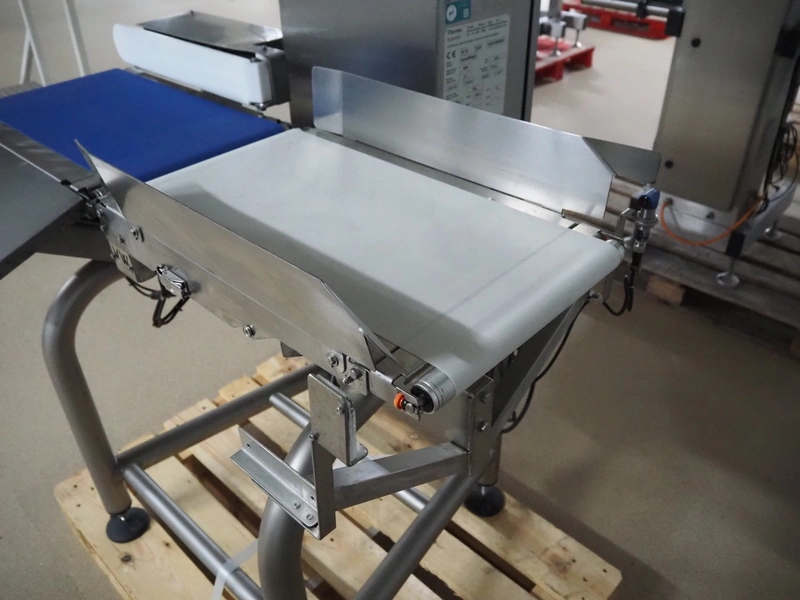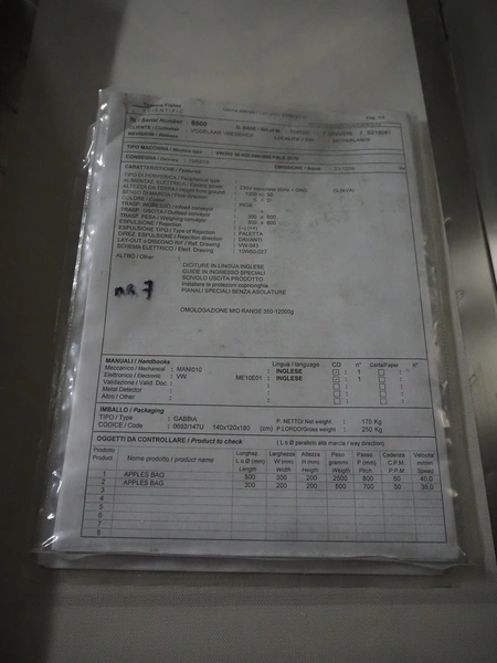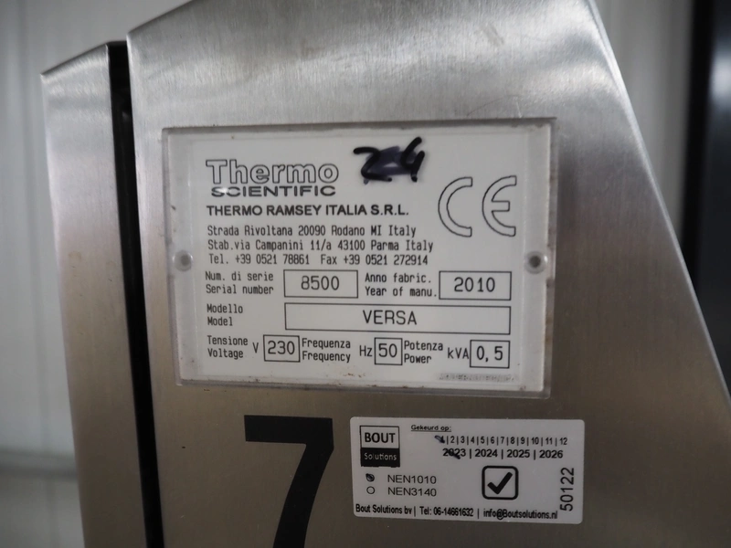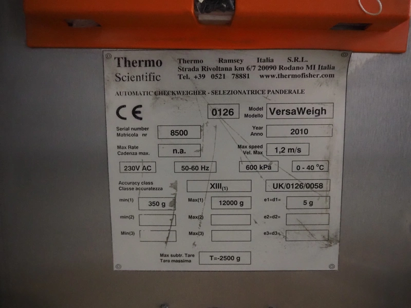 Thermo Scientific checkweigher with rejector, model: VersaWeigh, serial number: 8500, year of construction: 2010, 230 V, 50-60 Hz, minimum weight: 350 gram, maximum weight: 12000 gram, e=d= 5 gram, maximum speed: 1.2 m/s, plastic belt, belt width: 300 mm, total dimensions: 1250 mm x 1100 mm x 1550 mm.