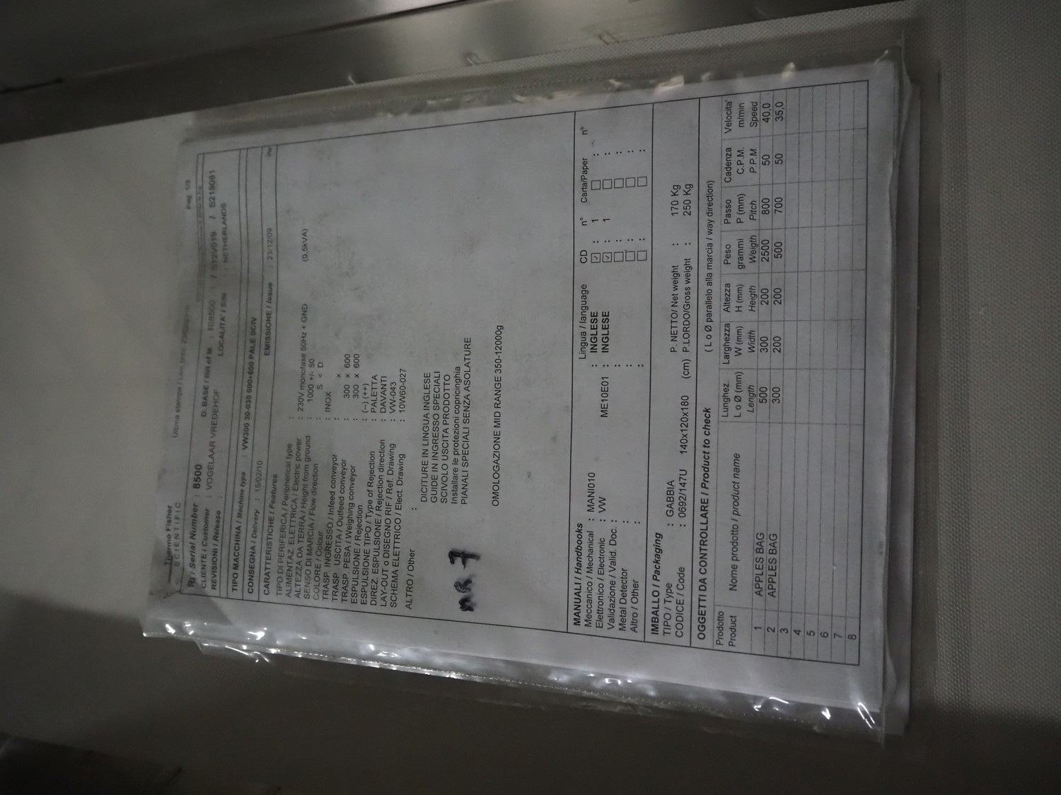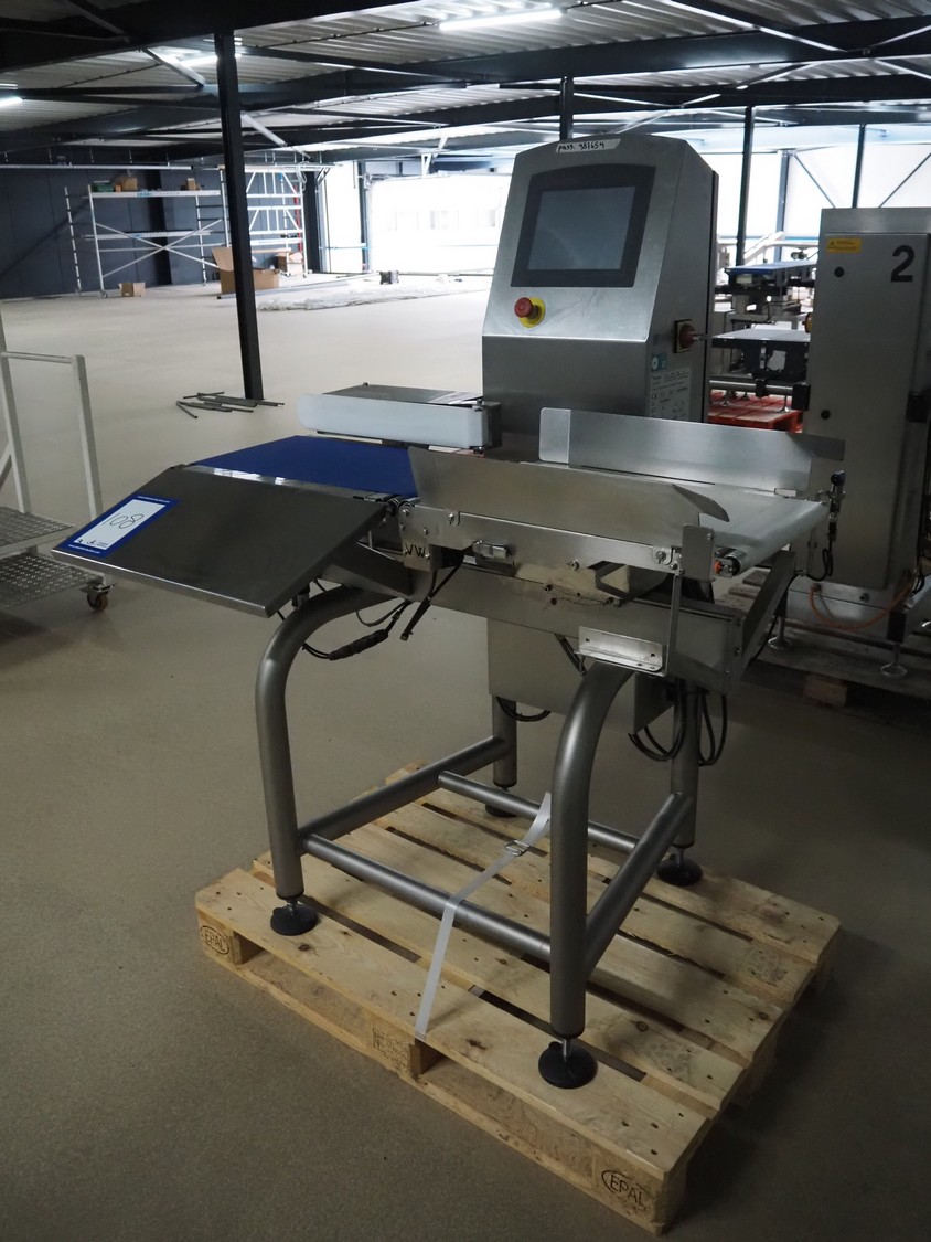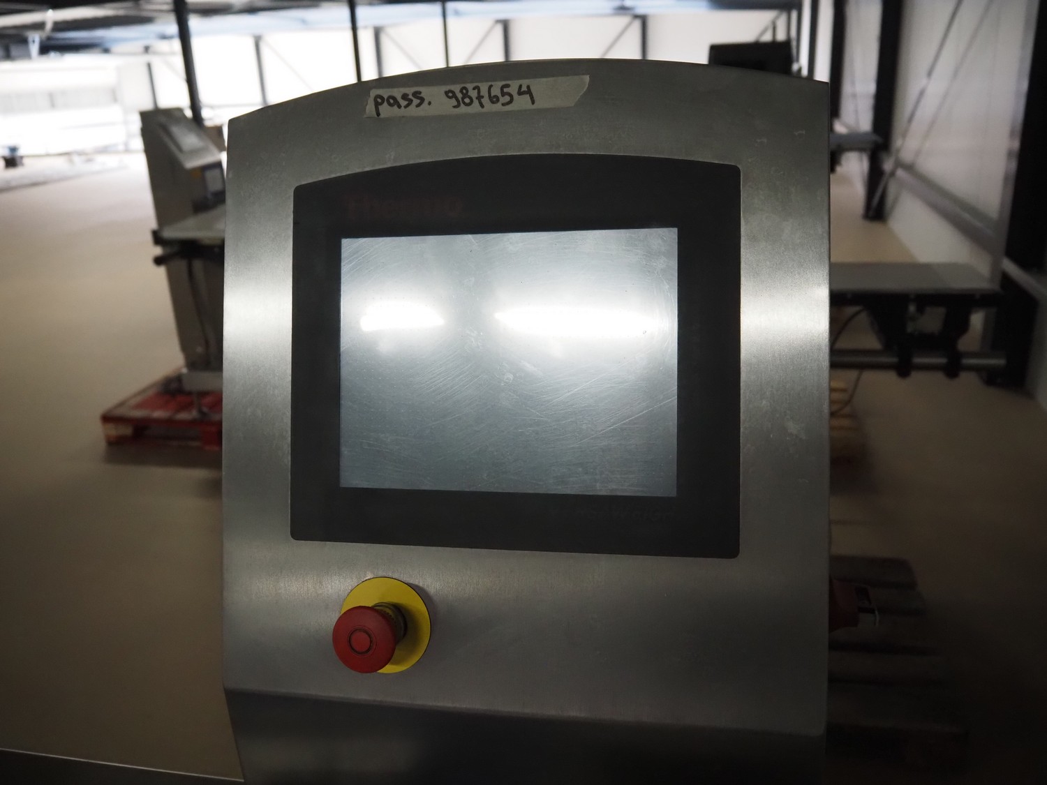 Thermo Scientific checkweigher with rejector, model: VersaWeigh, serial number: 8500, year of construction: 2010, 230 V, 50-60 Hz, minimum weight: 350 gram, maximum weight: 12000 gram, e=d= 5 gram, maximum speed: 1.2 m/s, plastic belt, belt width: 300 mm, total dimensions: 1250 mm x 1100 mm x 1550 mm.