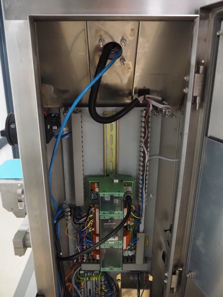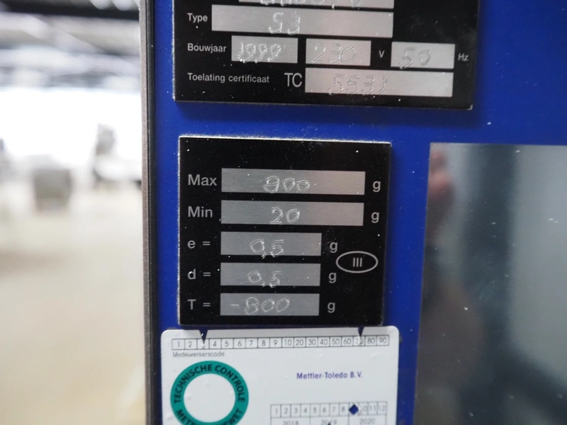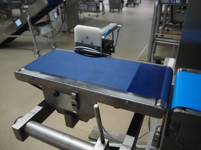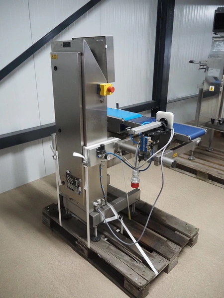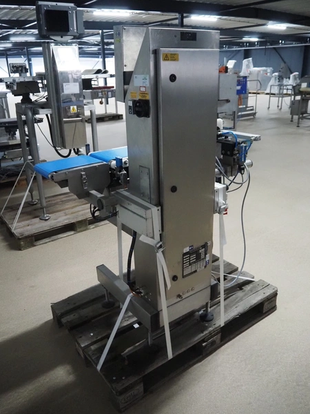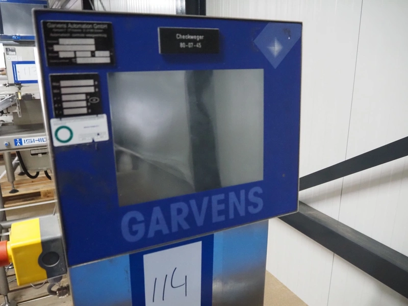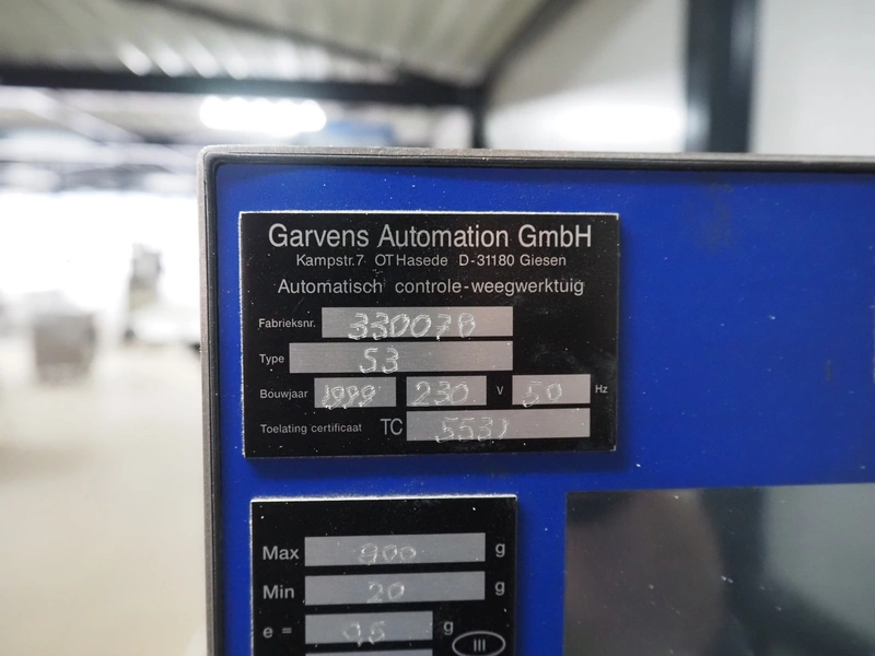 Garvens Automation GmbH checkweigher with rejector, type: S3, serial number: 330078, year of construction: 1999, 230 V, 50 Hz, maximum: 800 gram, minimum: 20 gram, e= 0.5 gram, plastic belt, belt width: 200 mm, total dimensions: 1200 mm x 750 mm x 1500 mm.