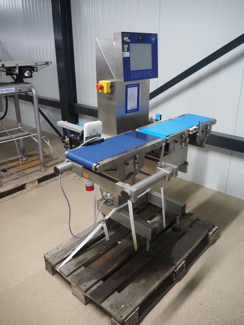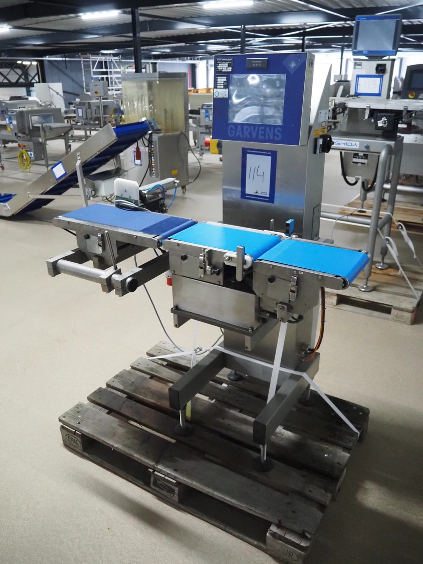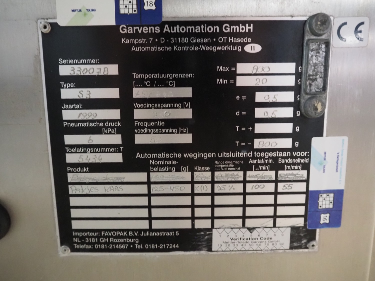 Garvens Automation GmbH checkweigher with rejector, type: S3, serial number: 330078, year of construction: 1999, 230 V, 50 Hz, maximum: 800 gram, minimum: 20 gram, e= 0.5 gram, plastic belt, belt width: 200 mm, total dimensions: 1200 mm x 750 mm x 1500 mm.