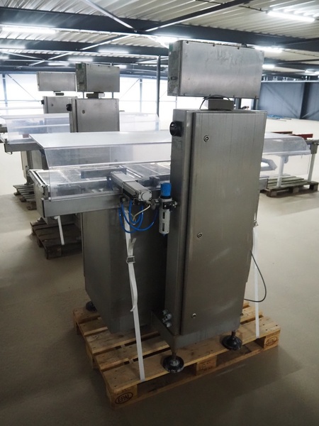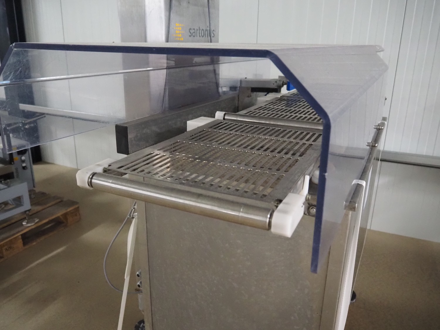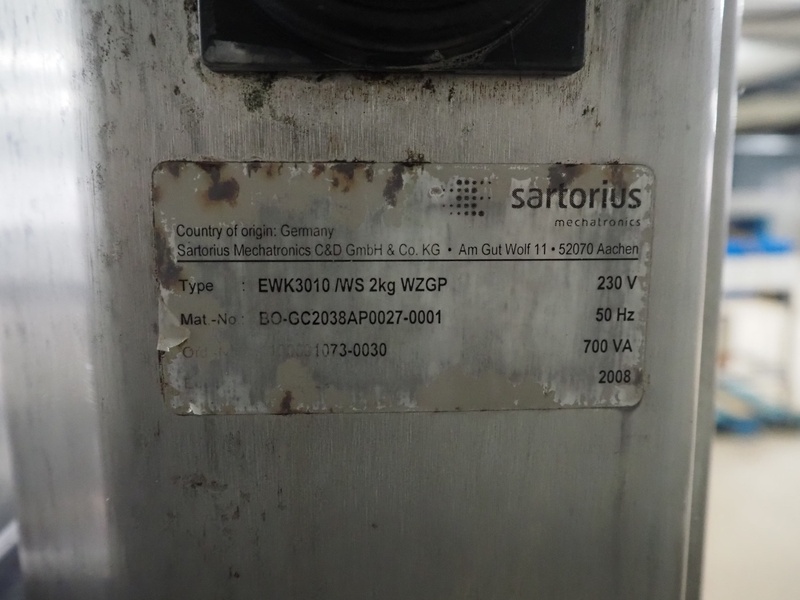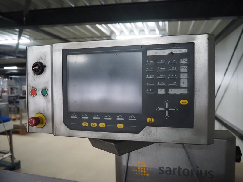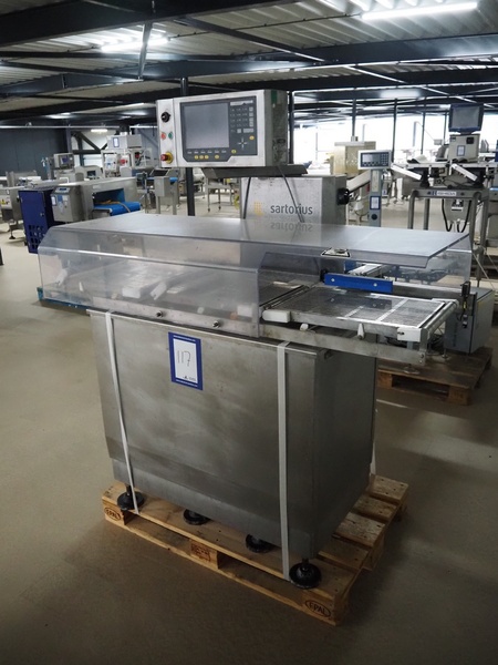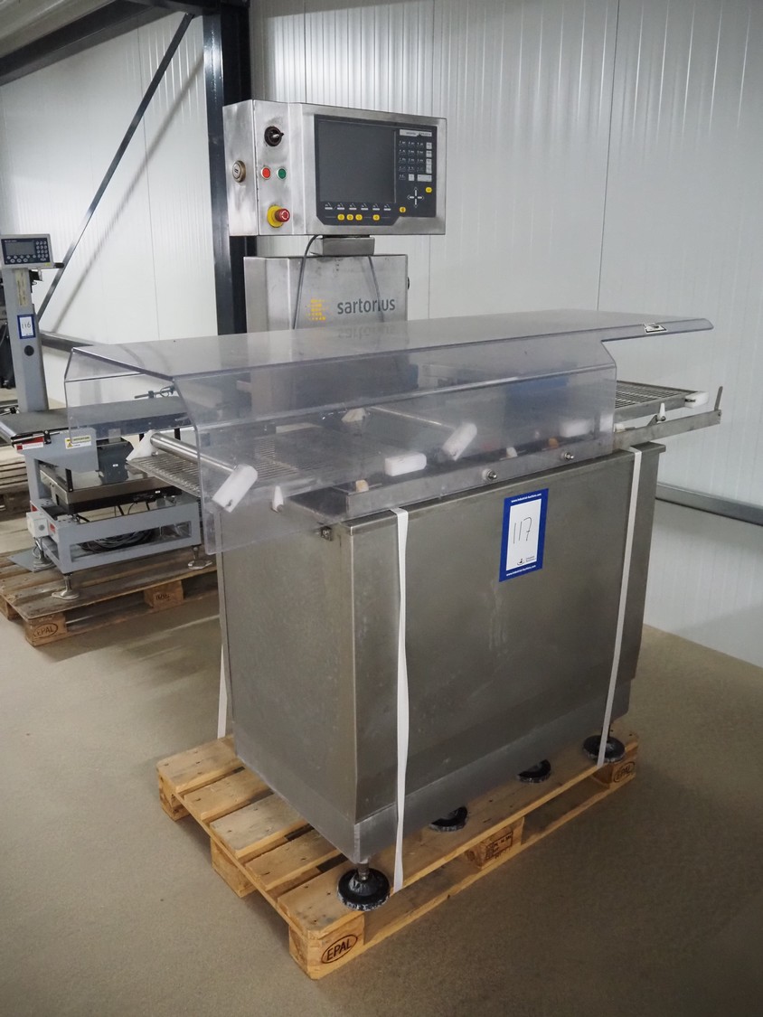 Sartorius checkweigher with rejector, type: EWK3010, number: BO-GC2038AP0027-001, year of construction: 2008, 230 V, 50 Hz, 700 vA, e=d= 0.2 gram, belt width: 300 mm, total dimensions: 1600 mm x 900 mm x 1700 mm. Missing belt.
