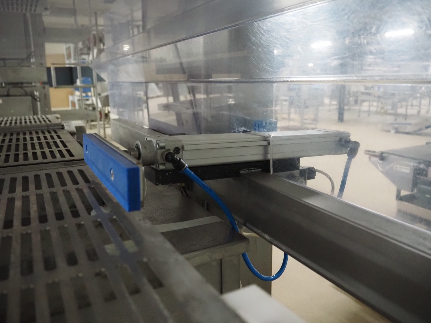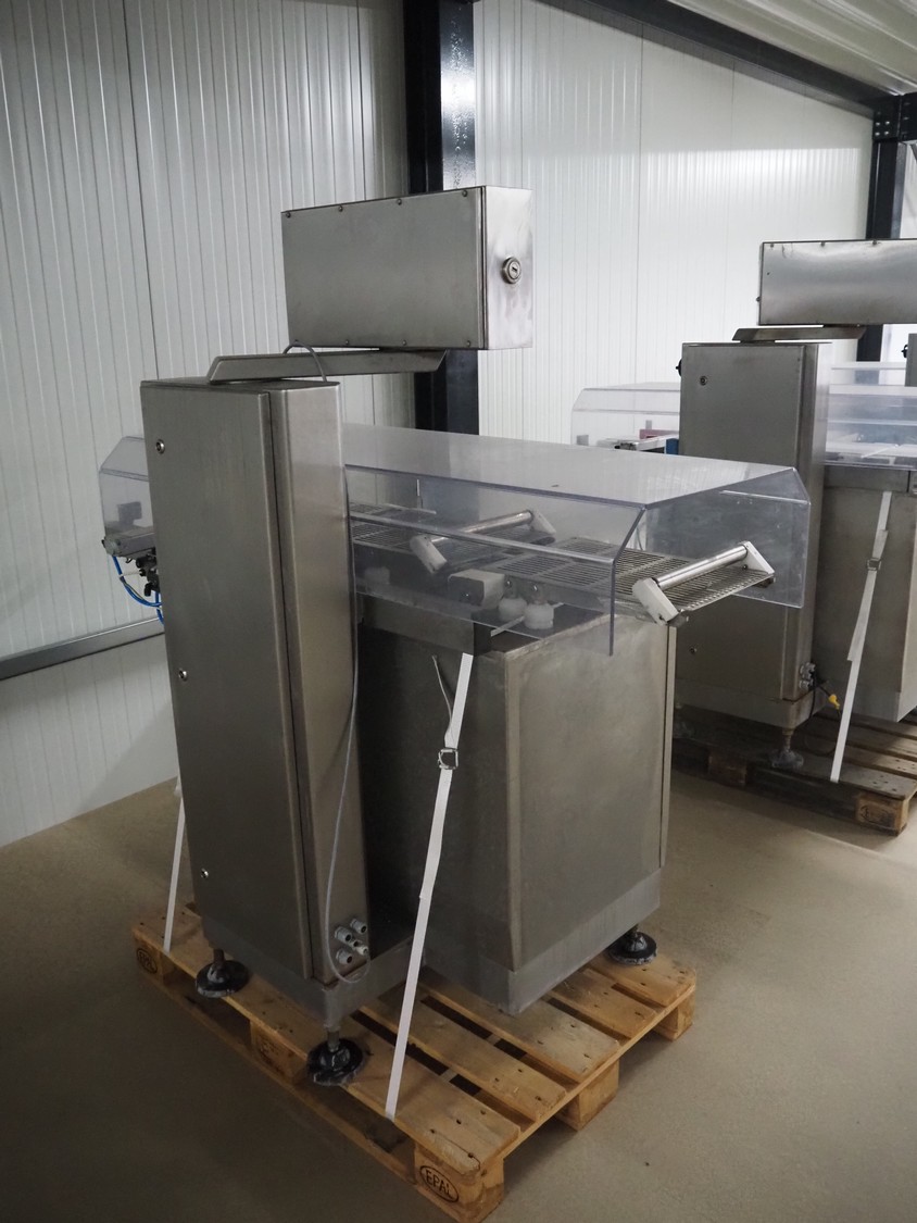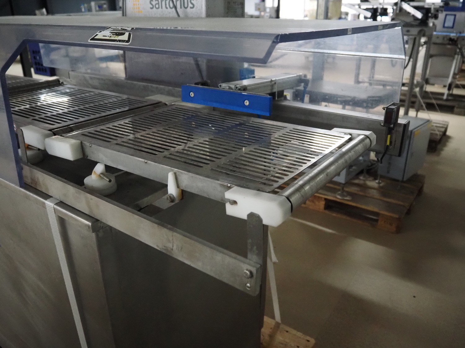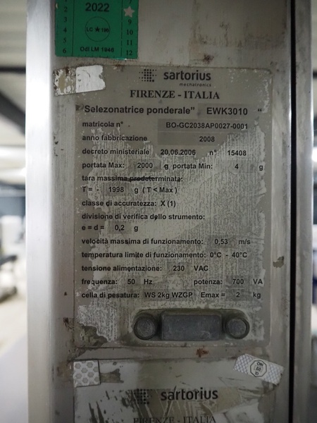 Sartorius checkweigher with rejector, type: EWK3010, number: BO-GC2038AP0027-001, year of construction: 2008, 230 V, 50 Hz, 700 vA, e=d= 0.2 gram, belt width: 300 mm, total dimensions: 1600 mm x 900 mm x 1700 mm. Missing belt.
