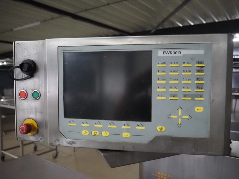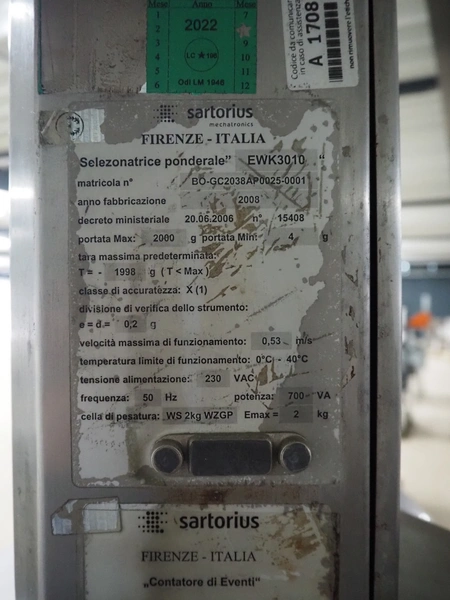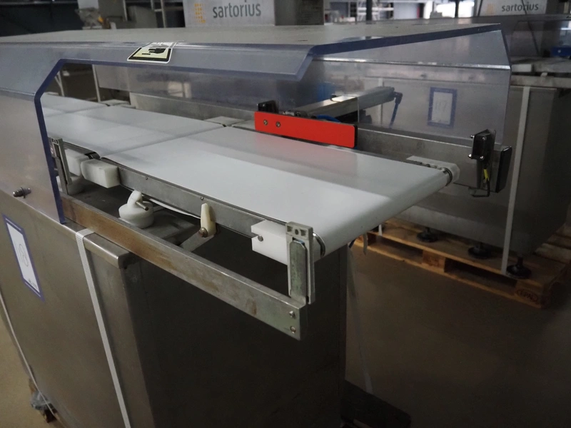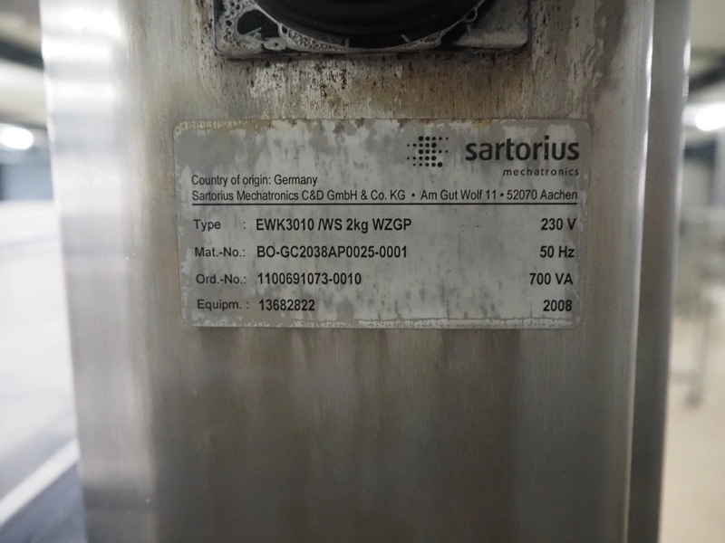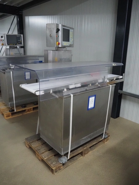 Sartorius checkweigher with rejector, type: EWK3010, number: BO-GC2038AP0025-001, year of construction: 2008, 230 V, 50 Hz, 700 vA, e=d= 0.2 gram, plastic belt, belt width: 300 mm, total dimensions: 1600 mm x 900 mm x 1700 mm.