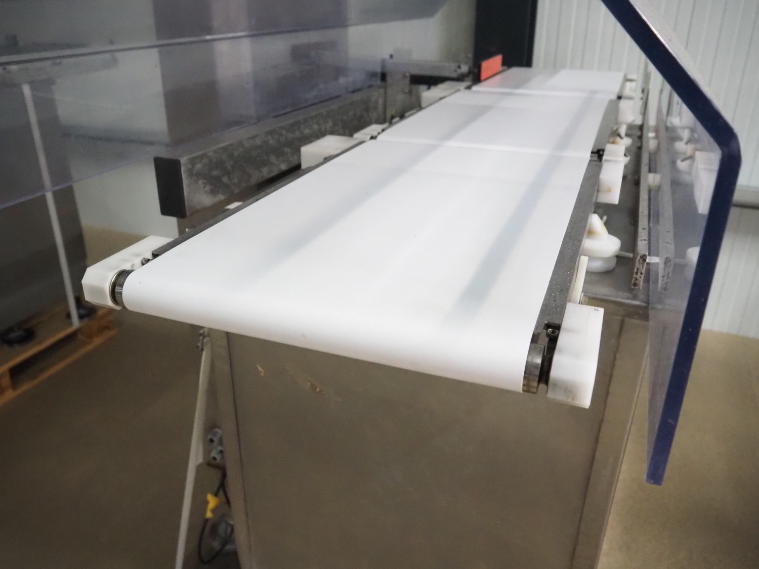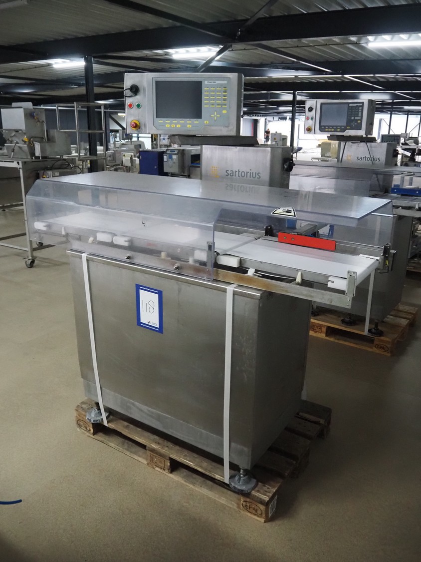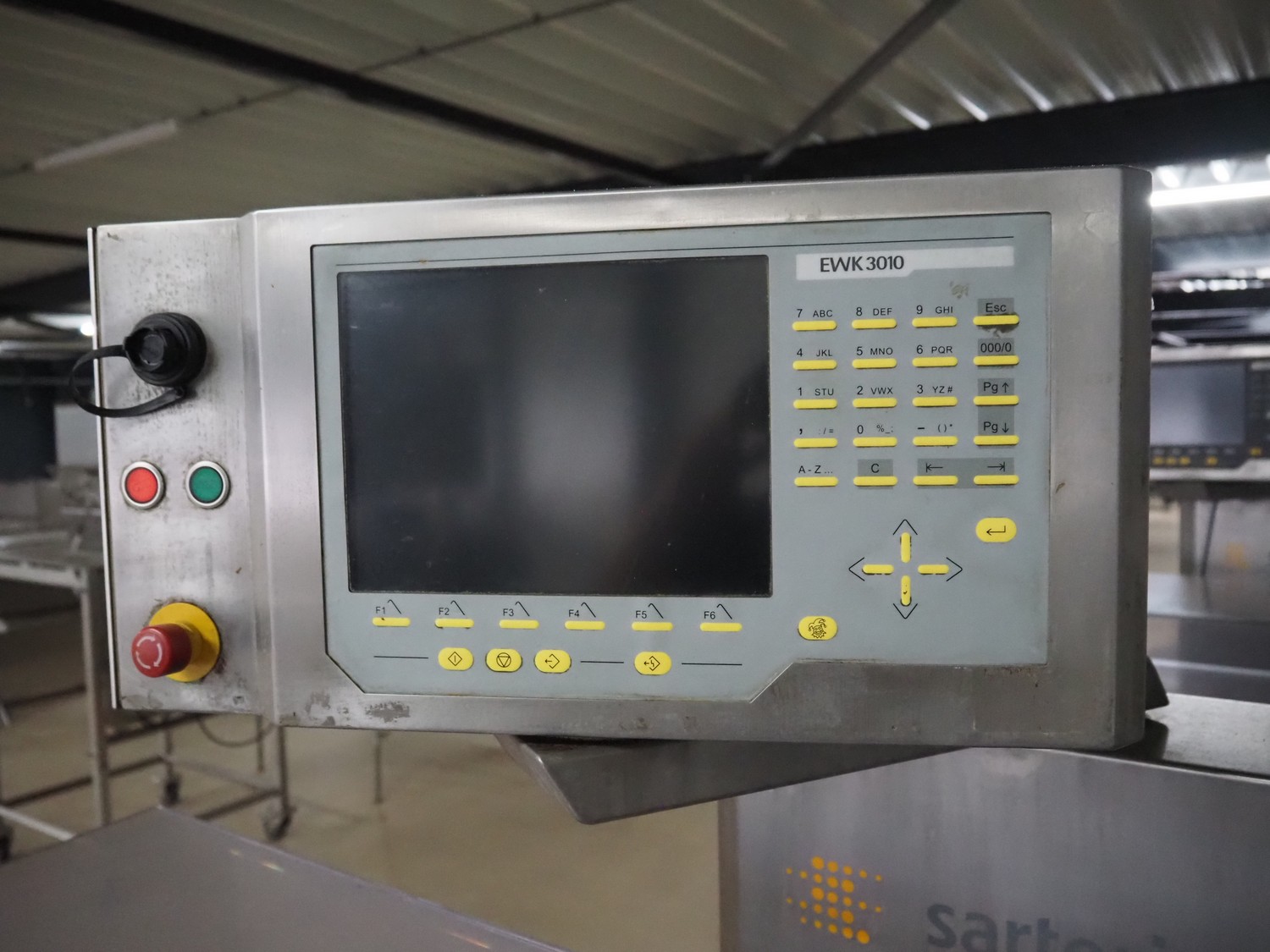 Sartorius checkweigher with rejector, type: EWK3010, number: BO-GC2038AP0025-001, year of construction: 2008, 230 V, 50 Hz, 700 vA, e=d= 0.2 gram, plastic belt, belt width: 300 mm, total dimensions: 1600 mm x 900 mm x 1700 mm.