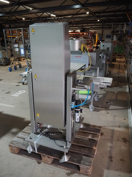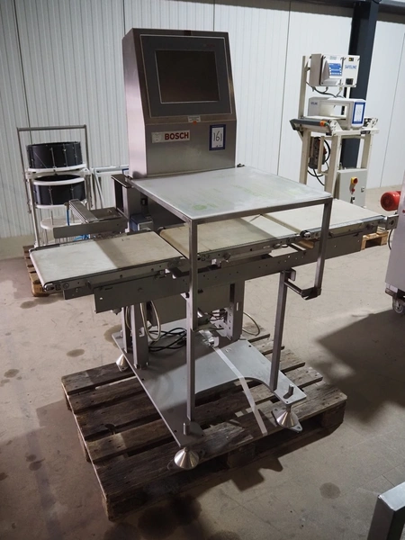 Bosch checkweigher, type: KWE 6000 A, year of construction: 2014, serial number: 721586, 230 V, 50 Hz, 24 VDC, max: 800 gram, min: 80 gram, e= 0.5 gram, plastic belt, belt width: 250 mm, total dimensions: 1200 mm x 800 mm x 1700 mm.