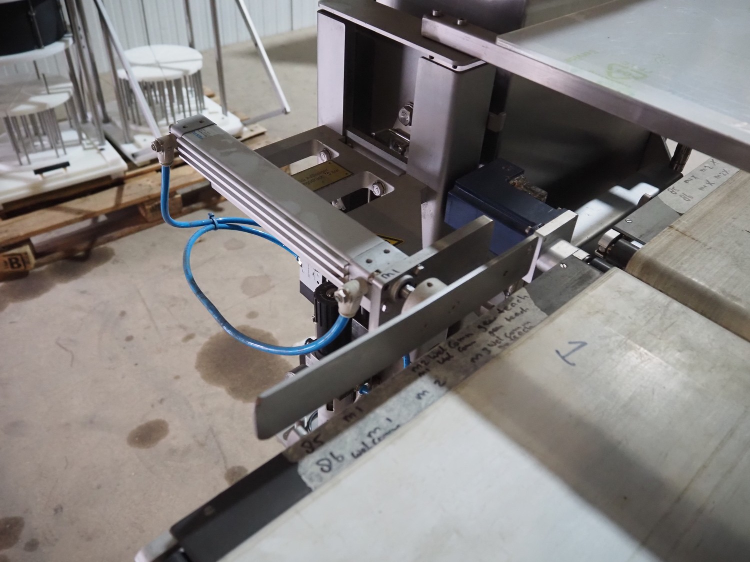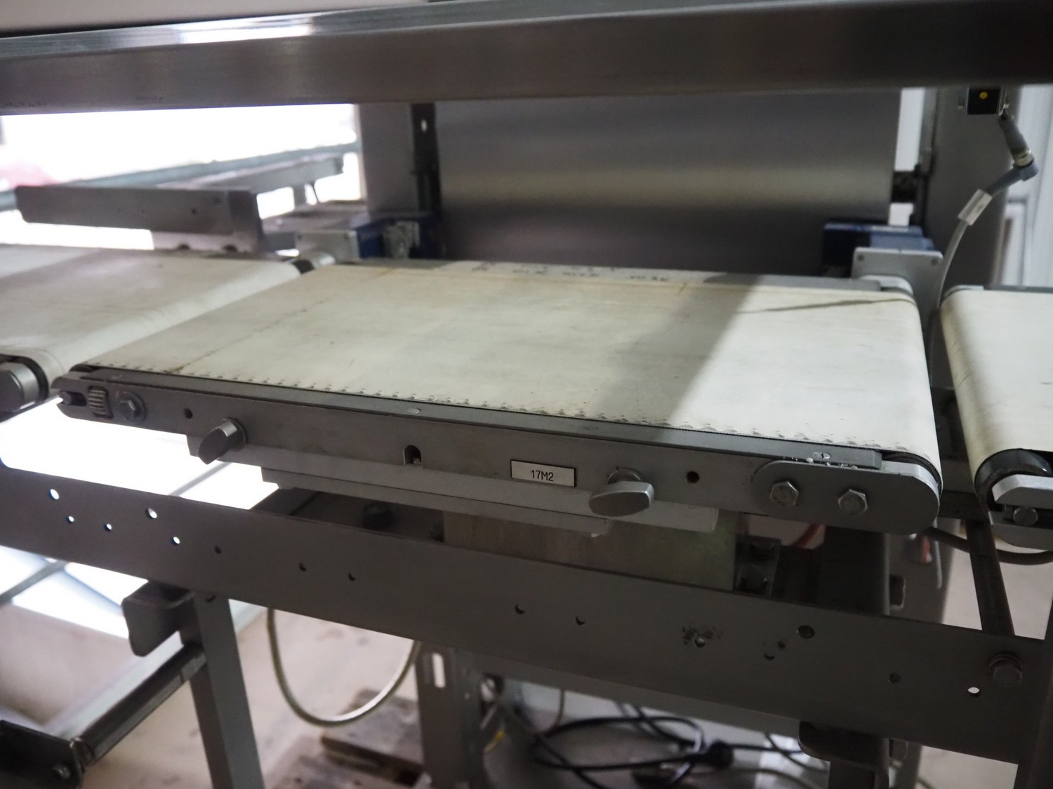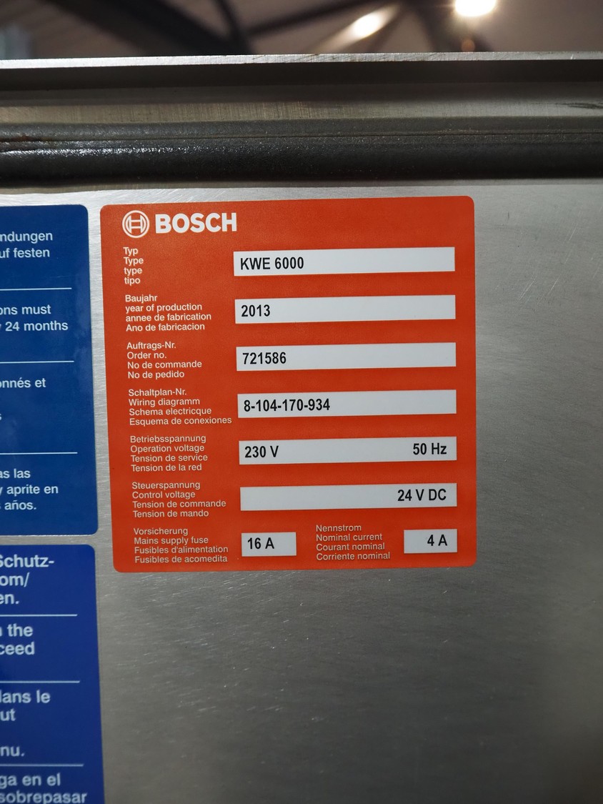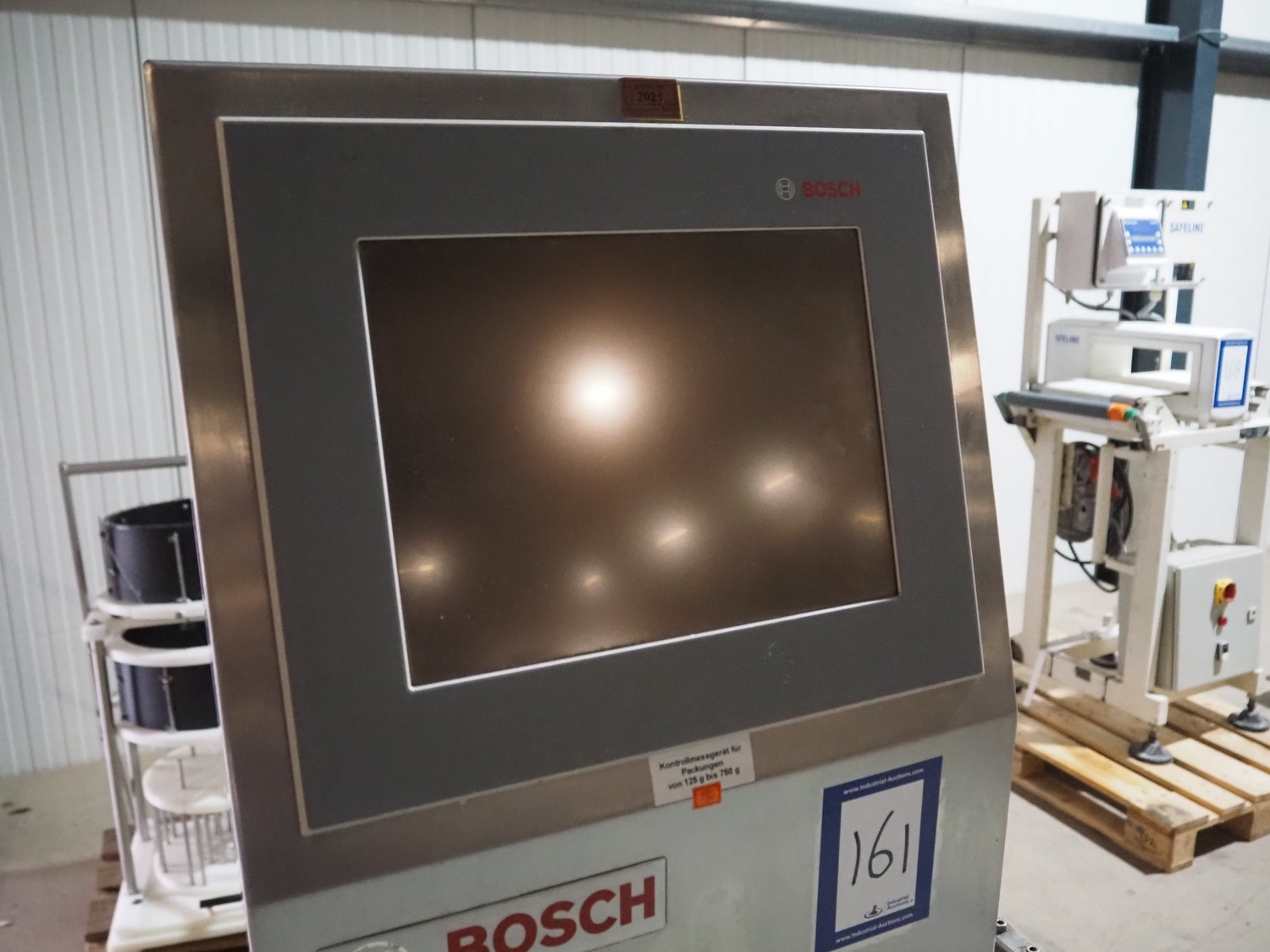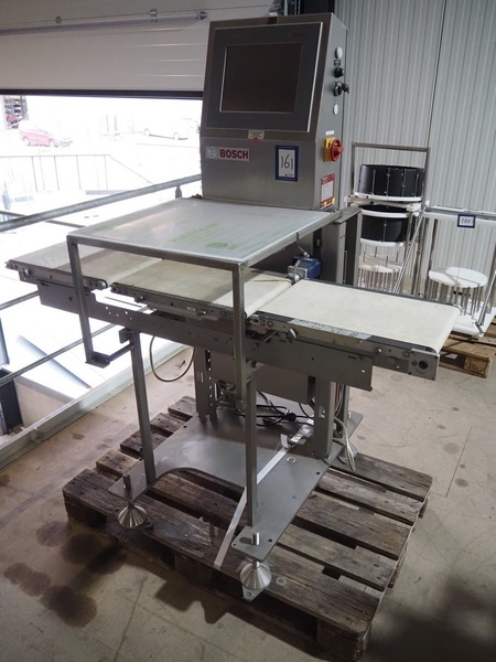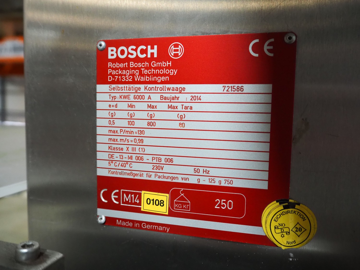 Bosch checkweigher, type: KWE 6000 A, year of construction: 2014, serial number: 721586, 230 V, 50 Hz, 24 VDC, max: 800 gram, min: 80 gram, e= 0.5 gram, plastic belt, belt width: 250 mm, total dimensions: 1200 mm x 800 mm x 1700 mm.
