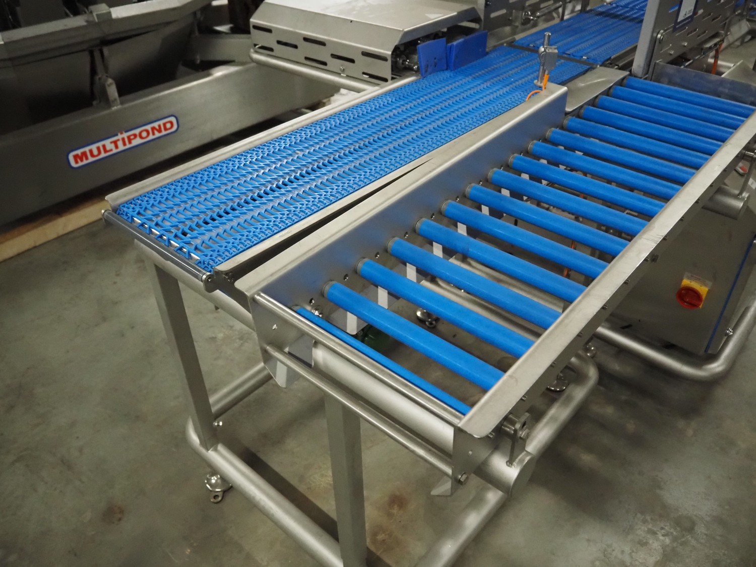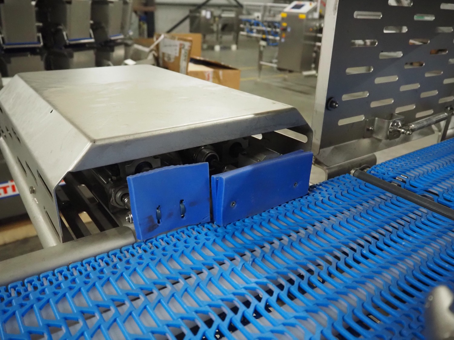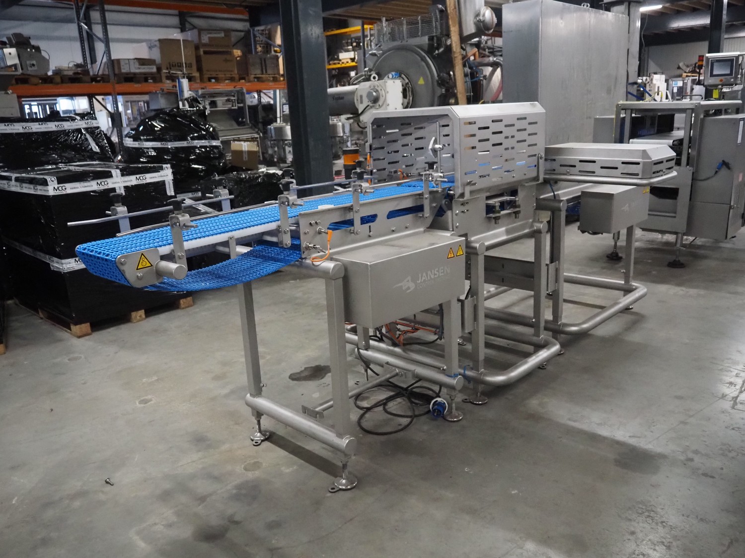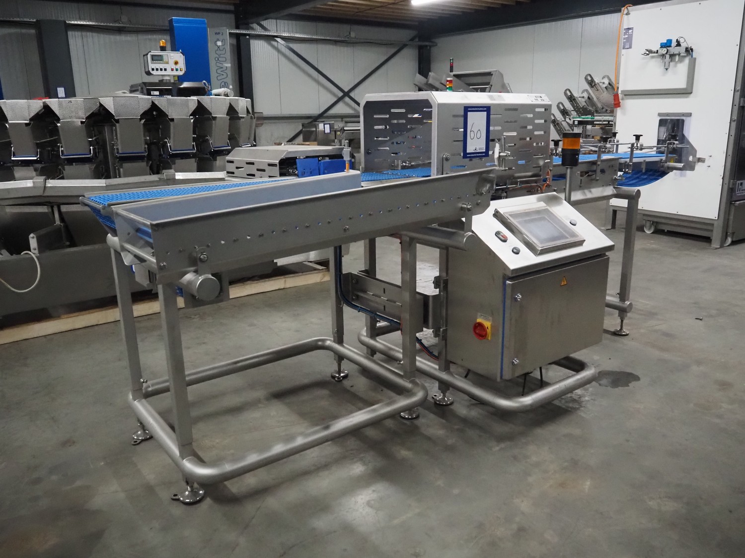Jansen Techniek checkweigher with rejector, model: checkweigher, type: reject, year of construction: 2018, plastic mesh belt, belt width: 250 mm, clearance: 260 mm x 285 mm, plastic rollers, roller width: 315 mm, total dimensions: 1300 mm x 2550 mm x 1500 mm.