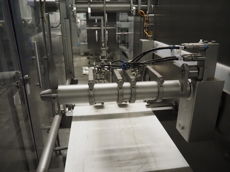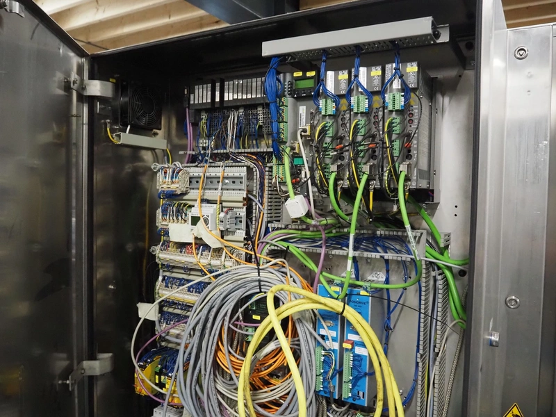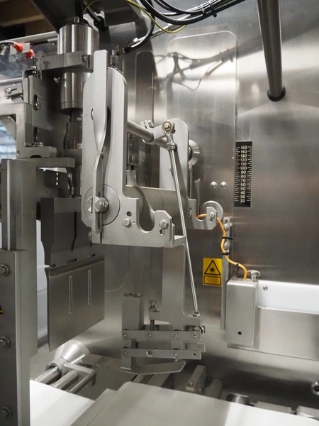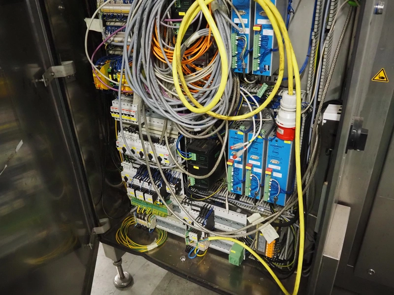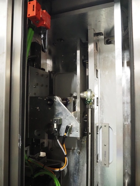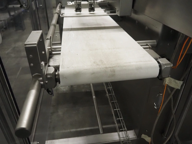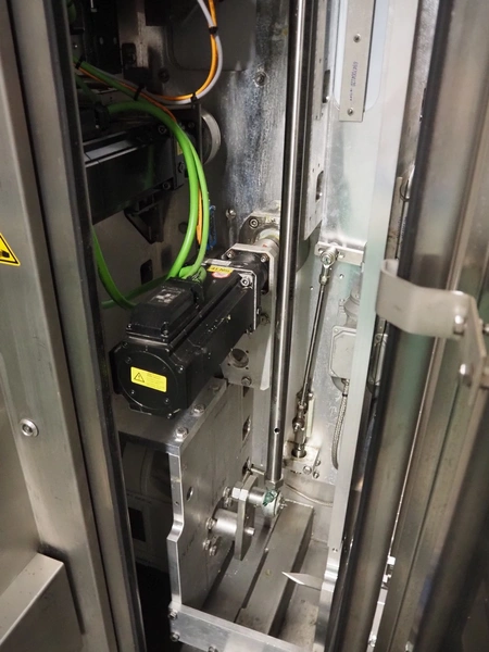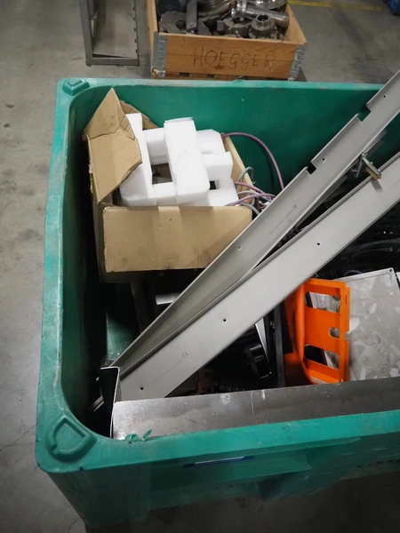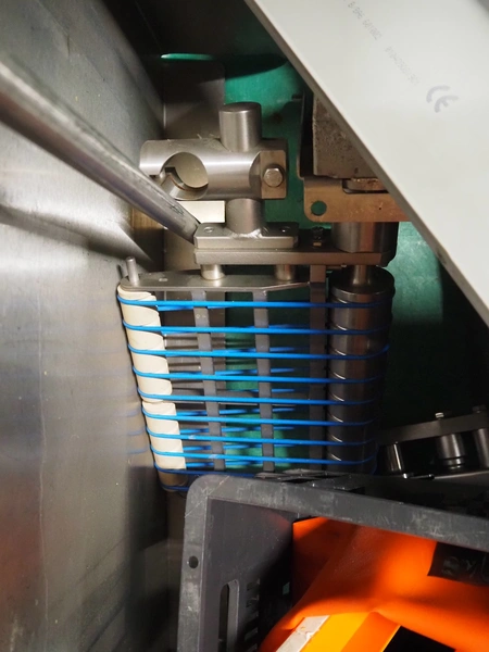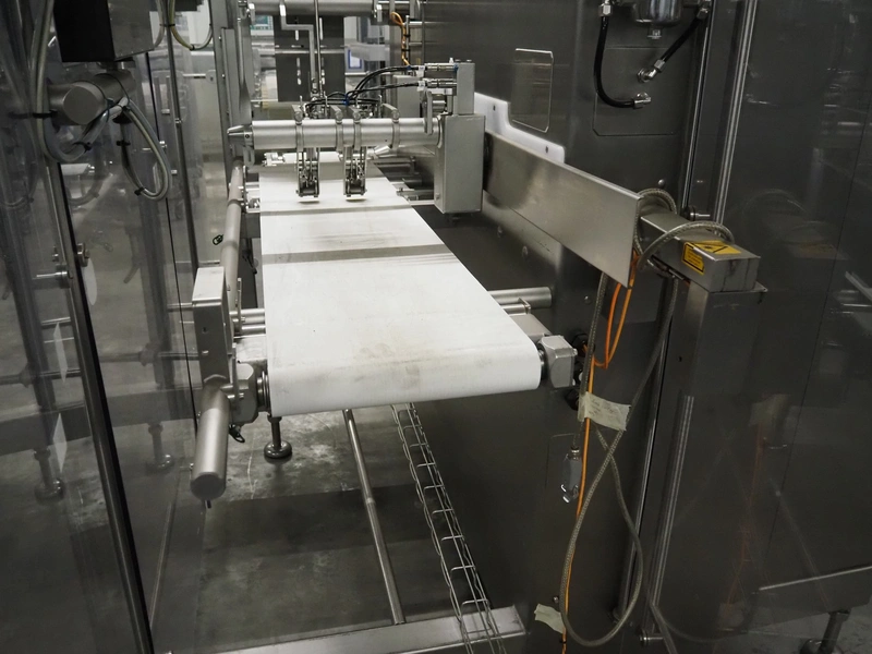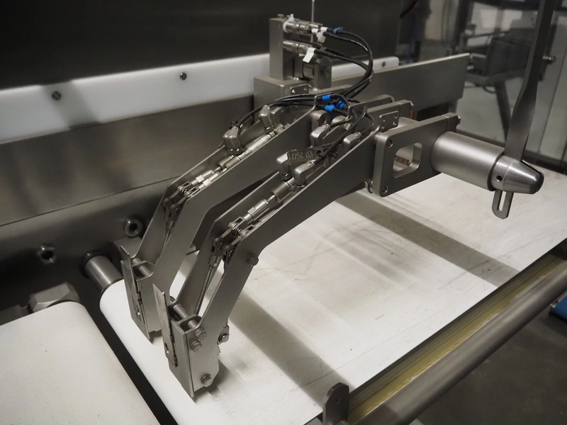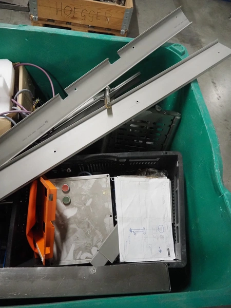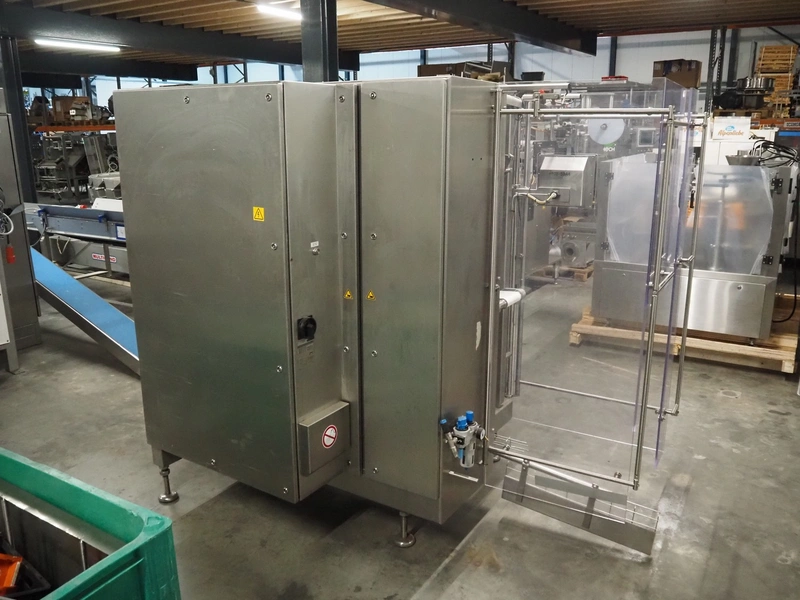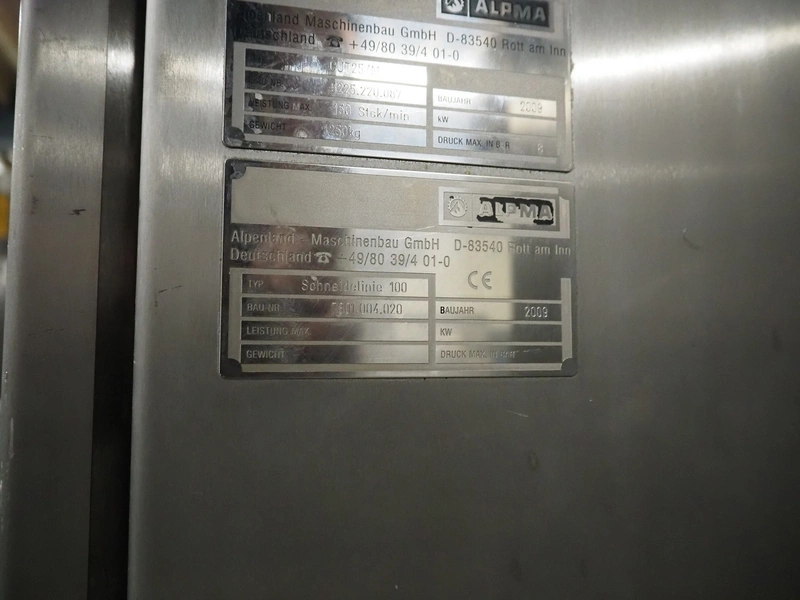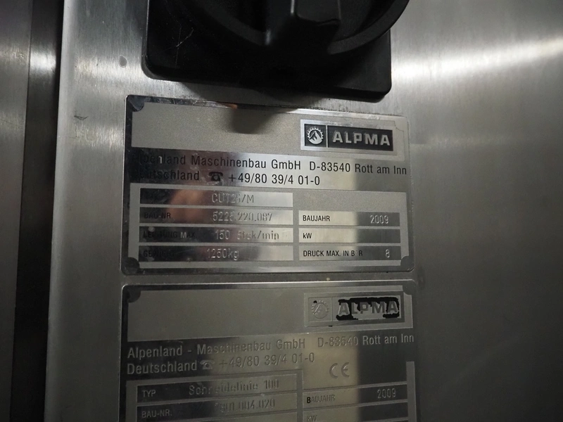 Alpma high speed portioning machine, type: CUT25/M, number: 5225.220.08, year of construction: 2009, weight: 1250 kg, capacity: 150 pieces per minute, plastic belt, belt width: 340 mm, knife width: 200 mm, total dimensions: 3100 mm x 1550 mm x 2050 mm. Including pallet box with parts.
