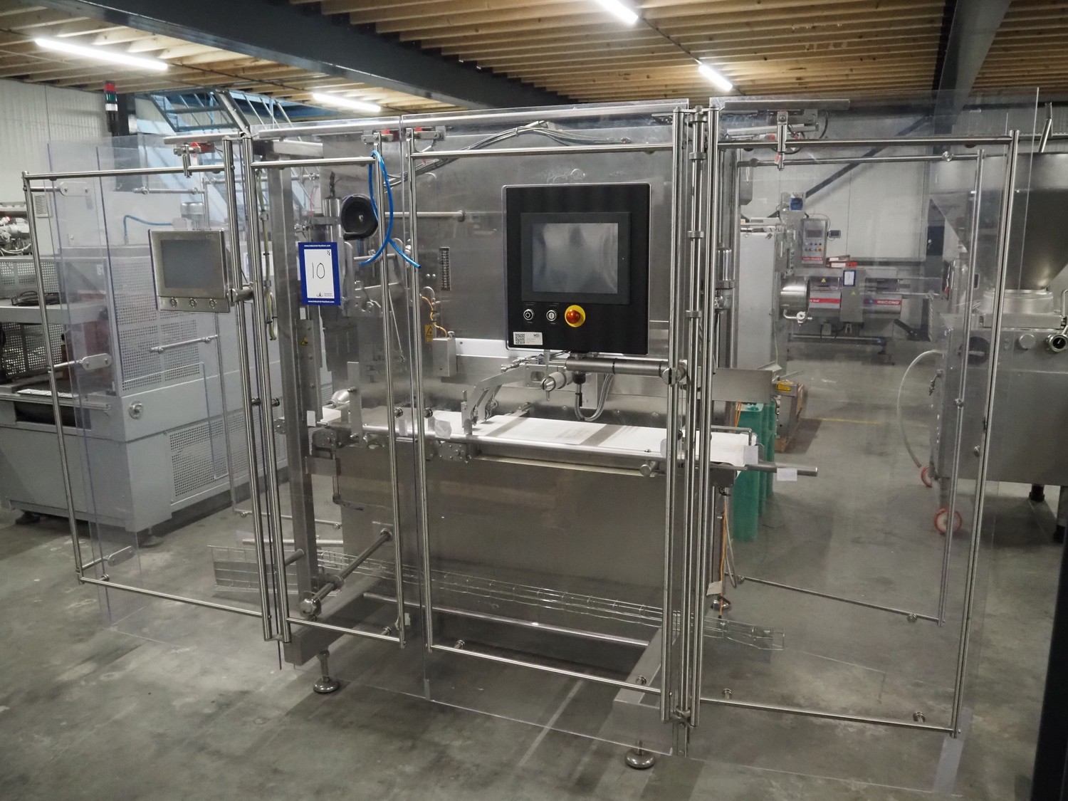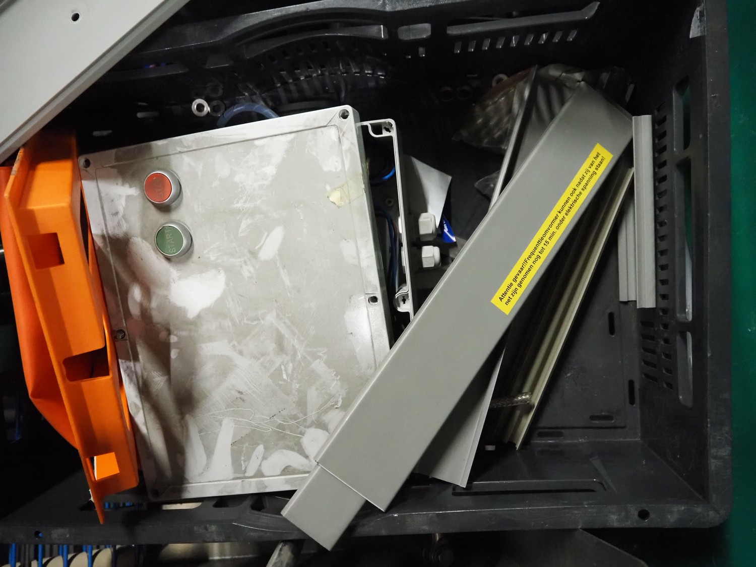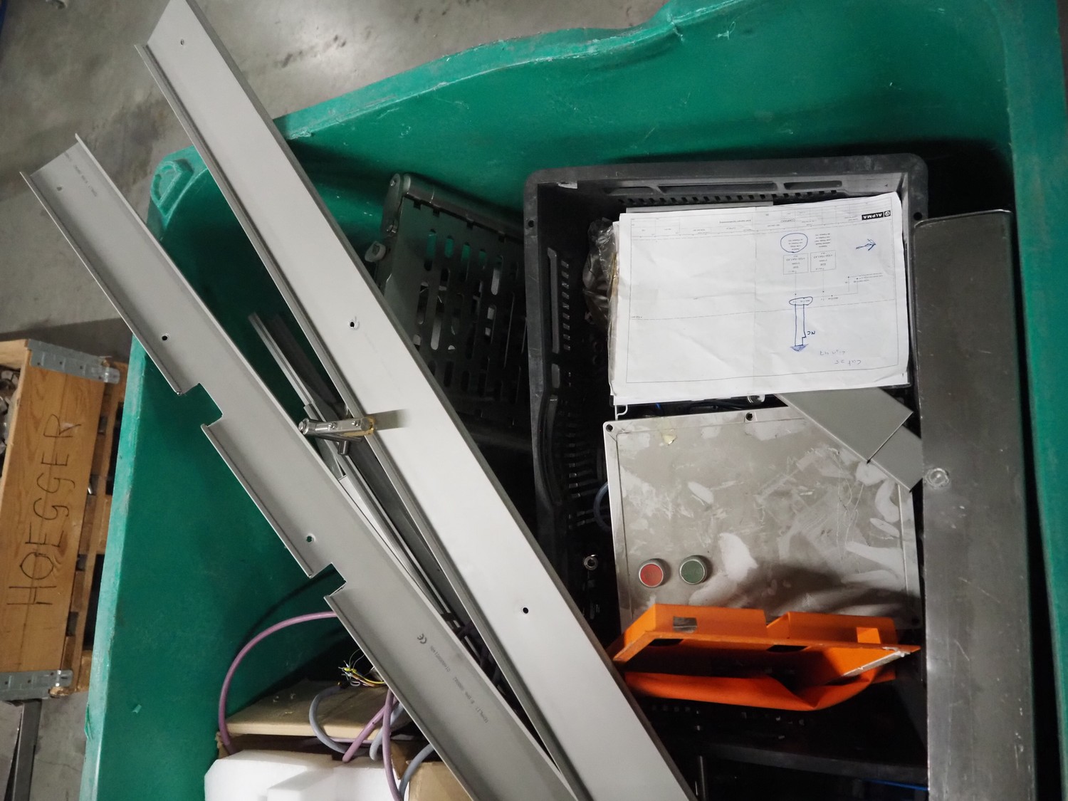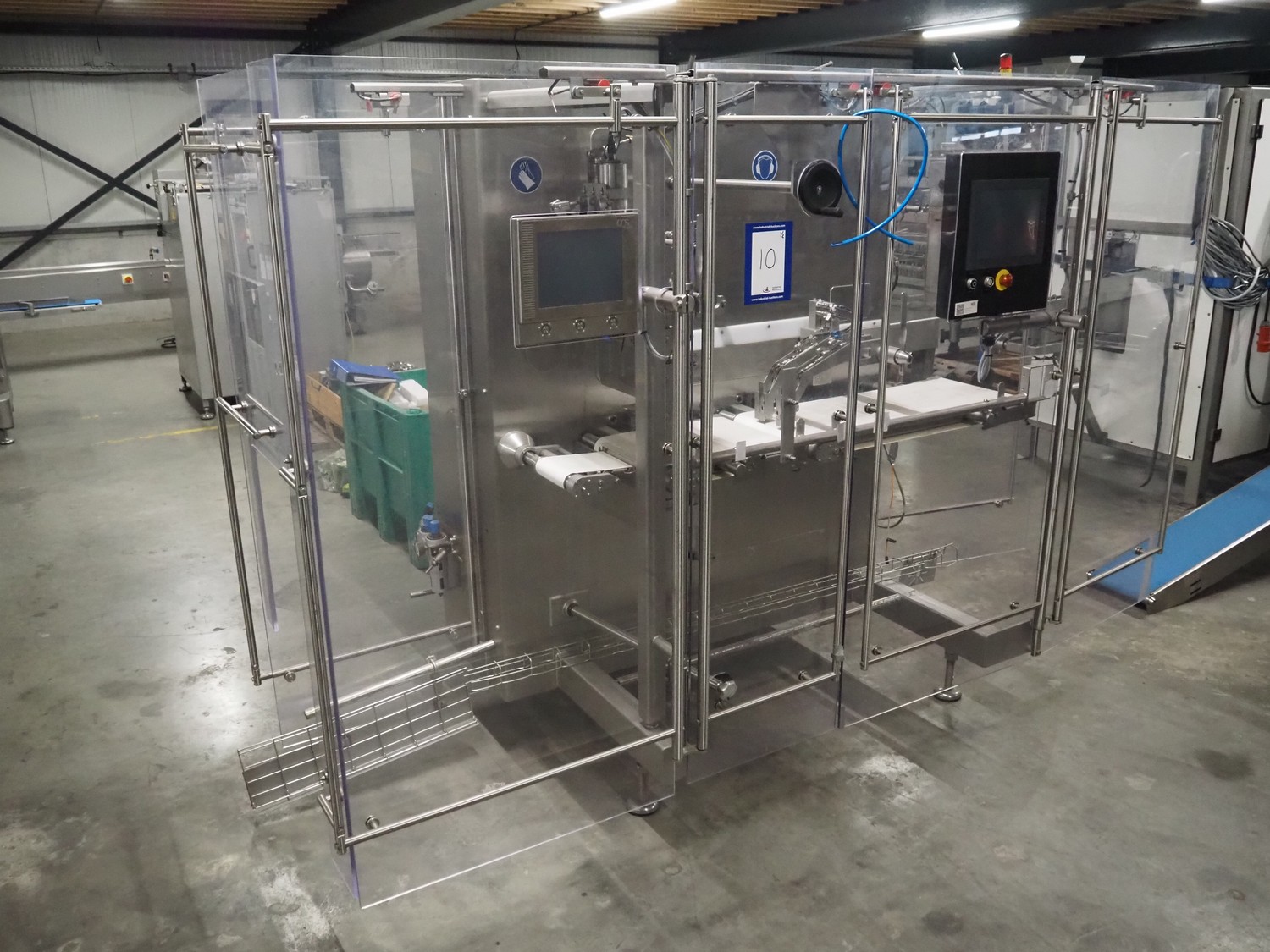 Alpma high speed portioning machine, type: CUT25/M, number: 5225.220.08, year of construction: 2009, weight: 1250 kg, capacity: 150 pieces per minute, plastic belt, belt width: 340 mm, knife width: 200 mm, total dimensions: 3100 mm x 1550 mm x 2050 mm. Including pallet box with parts.