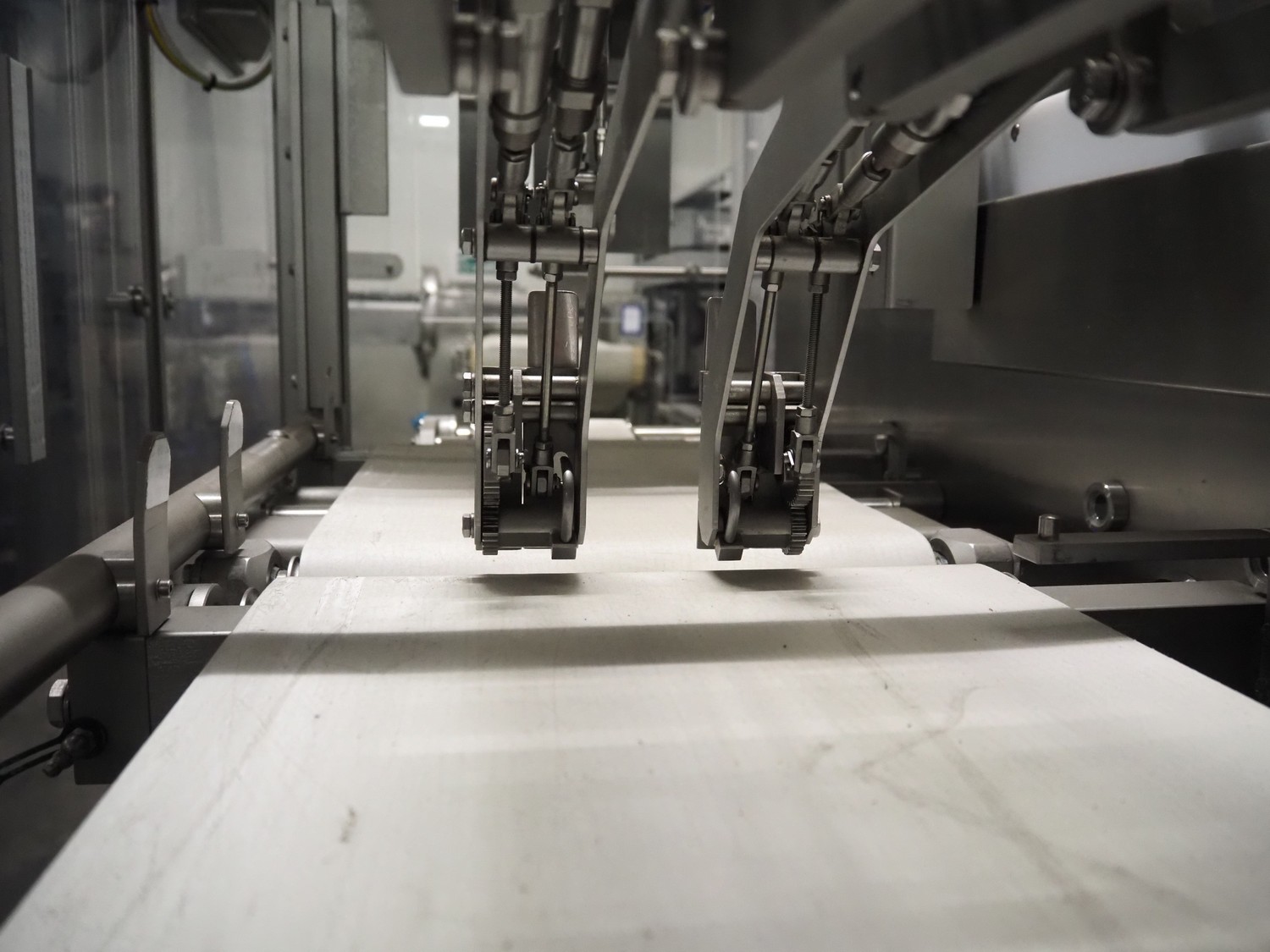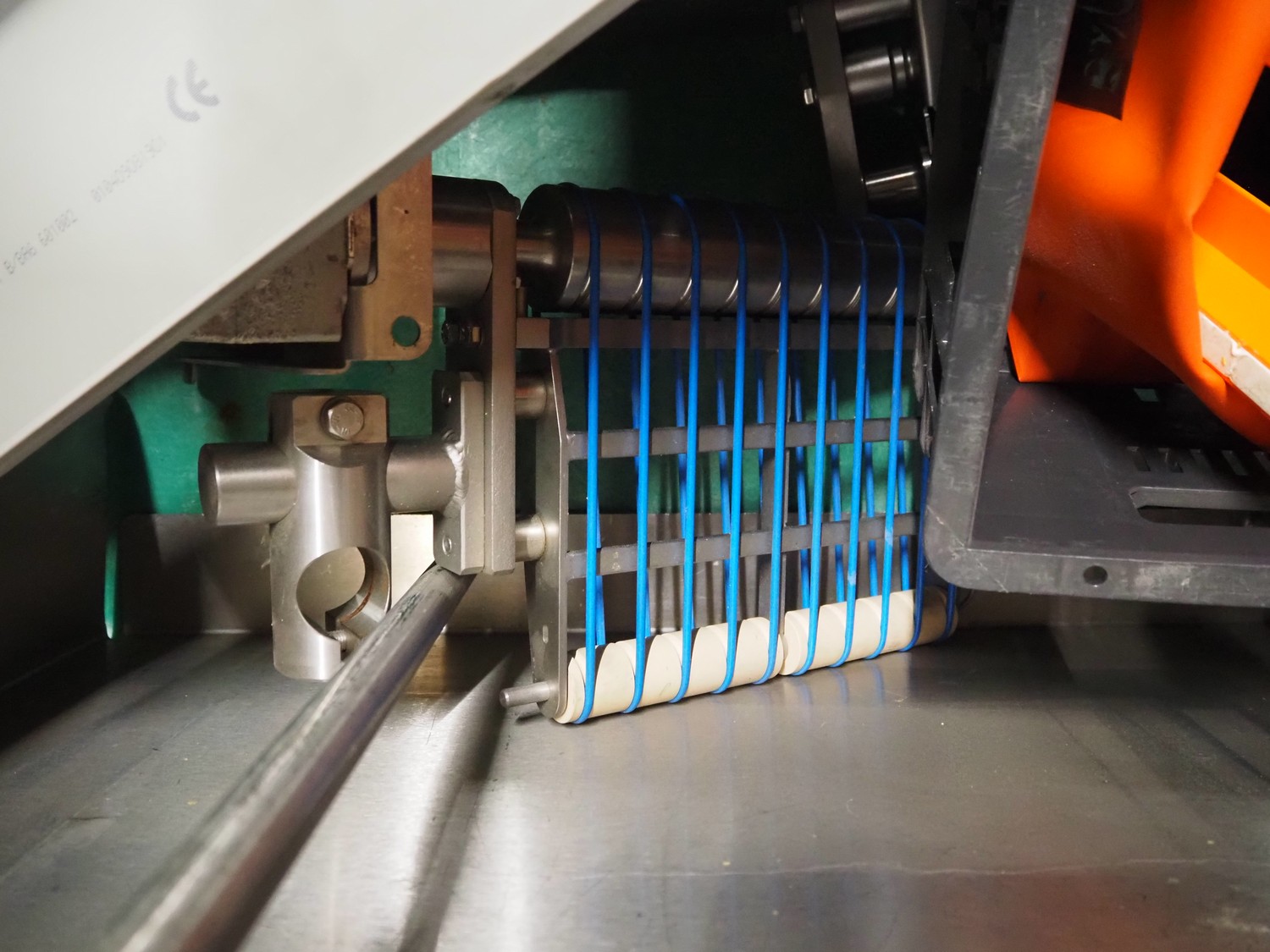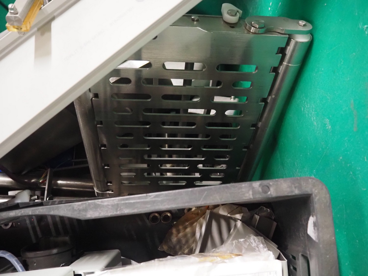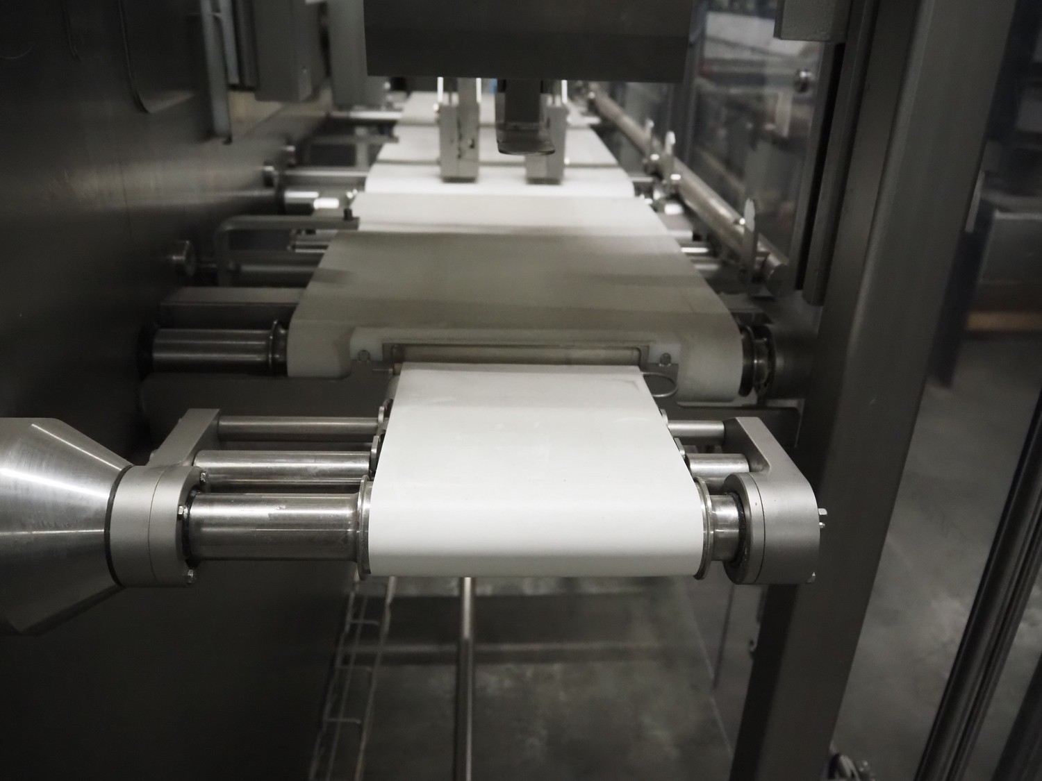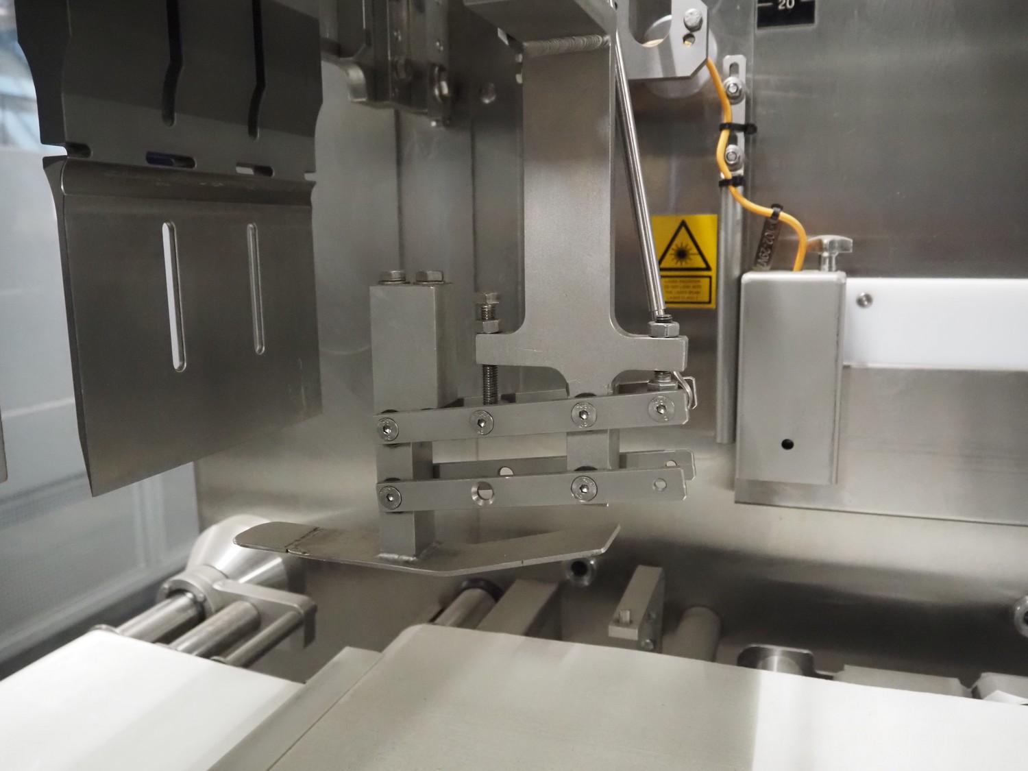 Alpma high speed portioning machine, type: CUT25/M, number: 5225.220.08, year of construction: 2009, weight: 1250 kg, capacity: 150 pieces per minute, plastic belt, belt width: 340 mm, knife width: 200 mm, total dimensions: 3100 mm x 1550 mm x 2050 mm. Including pallet box with parts.