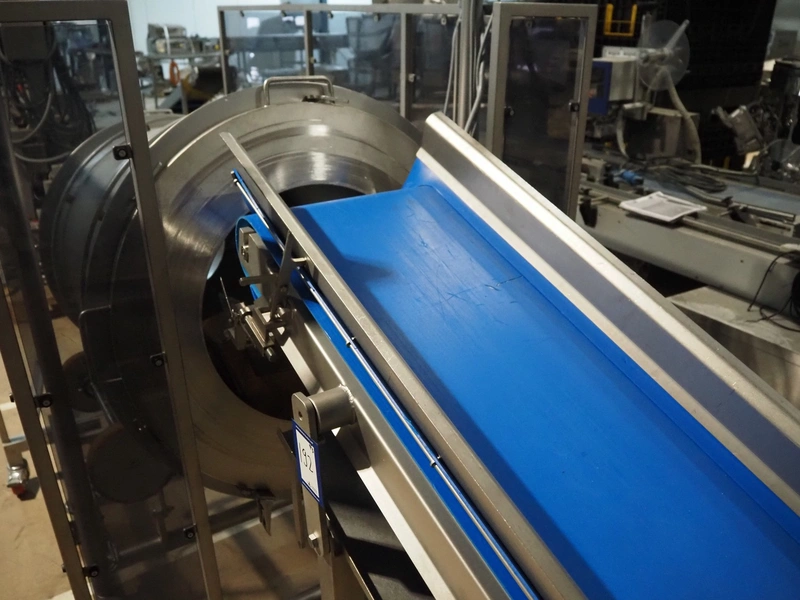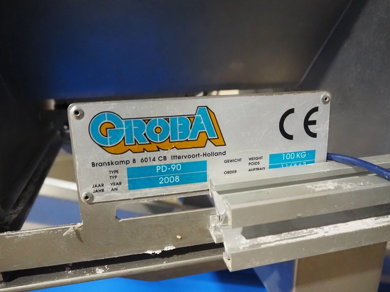 Groba cheese dosing and mixing line consisting of: Groba grated cheese dosing machine with elevating belt, type: PD-90, year of construction: 2008, plastic belt, belt width: 400 mm, elevating height: 1330 mm, total dimensions: 3100 mm x 800 mm x 2350 mm, Groba mobile mixer, type: PM-800, year of construction: 2008, dimensions: 2240 mm x 1340 mm x 2200 mm, Groba mobile elevating belt, type: TB-404 L=3000, year of construction: 2008, plastic belt with dividers, belt width: 400 mm, divider height: 30 mm, distance between dividers: 290 mm, elevating height: 1000 mm, total dimensions: 3000 mm x 680 mm x 1100 mm.