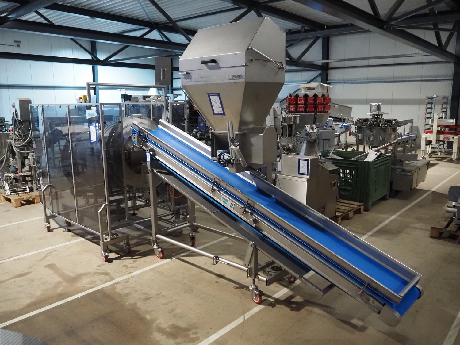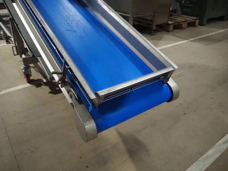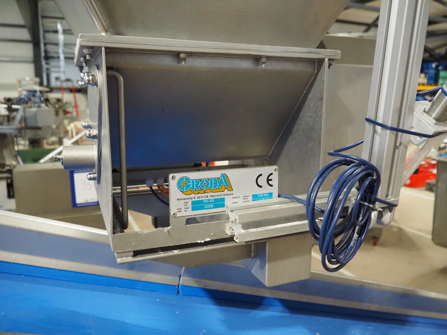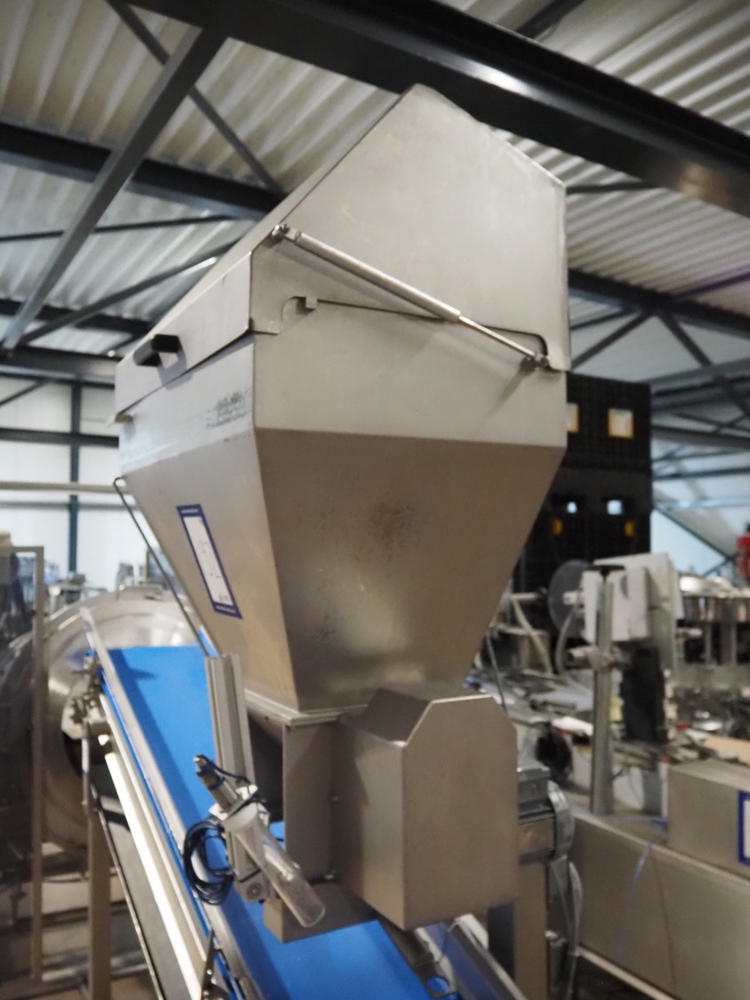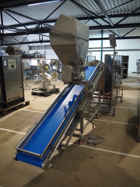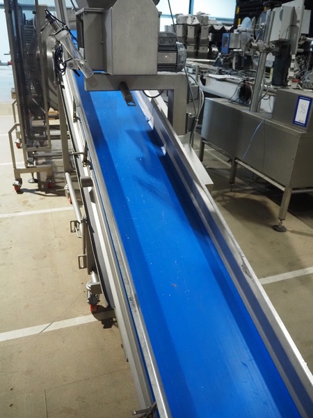 Groba cheese dosing and mixing line consisting of: Groba grated cheese dosing machine with elevating belt, type: PD-90, year of construction: 2008, plastic belt, belt width: 400 mm, elevating height: 1330 mm, total dimensions: 3100 mm x 800 mm x 2350 mm, Groba mobile mixer, type: PM-800, year of construction: 2008, dimensions: 2240 mm x 1340 mm x 2200 mm, Groba mobile elevating belt, type: TB-404 L=3000, year of construction: 2008, plastic belt with dividers, belt width: 400 mm, divider height: 30 mm, distance between dividers: 290 mm, elevating height: 1000 mm, total dimensions: 3000 mm x 680 mm x 1100 mm.