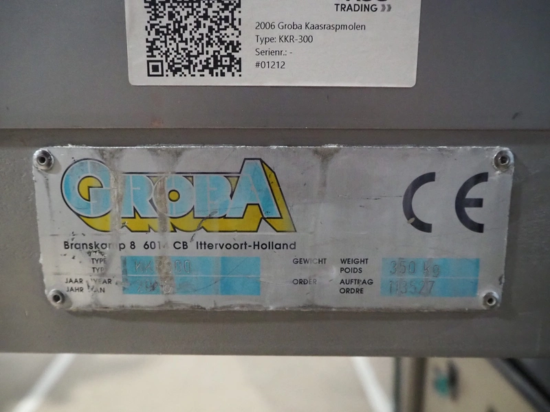 Groba mobile cheese grater mill, type: KKR300, number: 113527, year of construction: 2006, machine weight: 350 kg, total dimensions: 1400 mm x 650 mm x 1790 mm. Including extra grater.