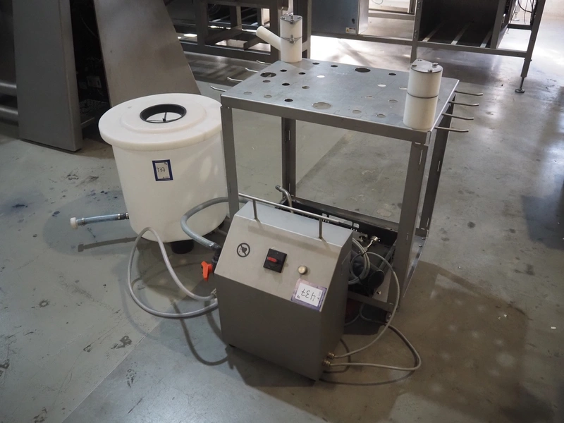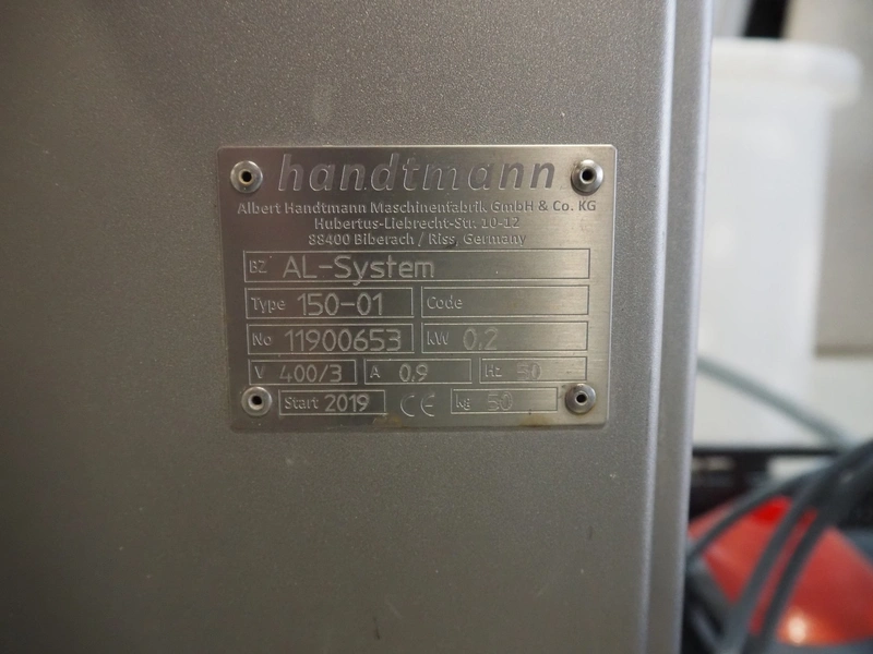 Handtmann coextrusion machine on s/s trolley, type: 150-01, number: 11900653, year of construction: 2019, 400 V, 3 Ph, 50 Hz, 0.9 A, 0.2 kW, dimensions: 950 mm x 700 mm x 1180 mm. With plastic tub, dimensions: Ø 570 mm x 630 mm.