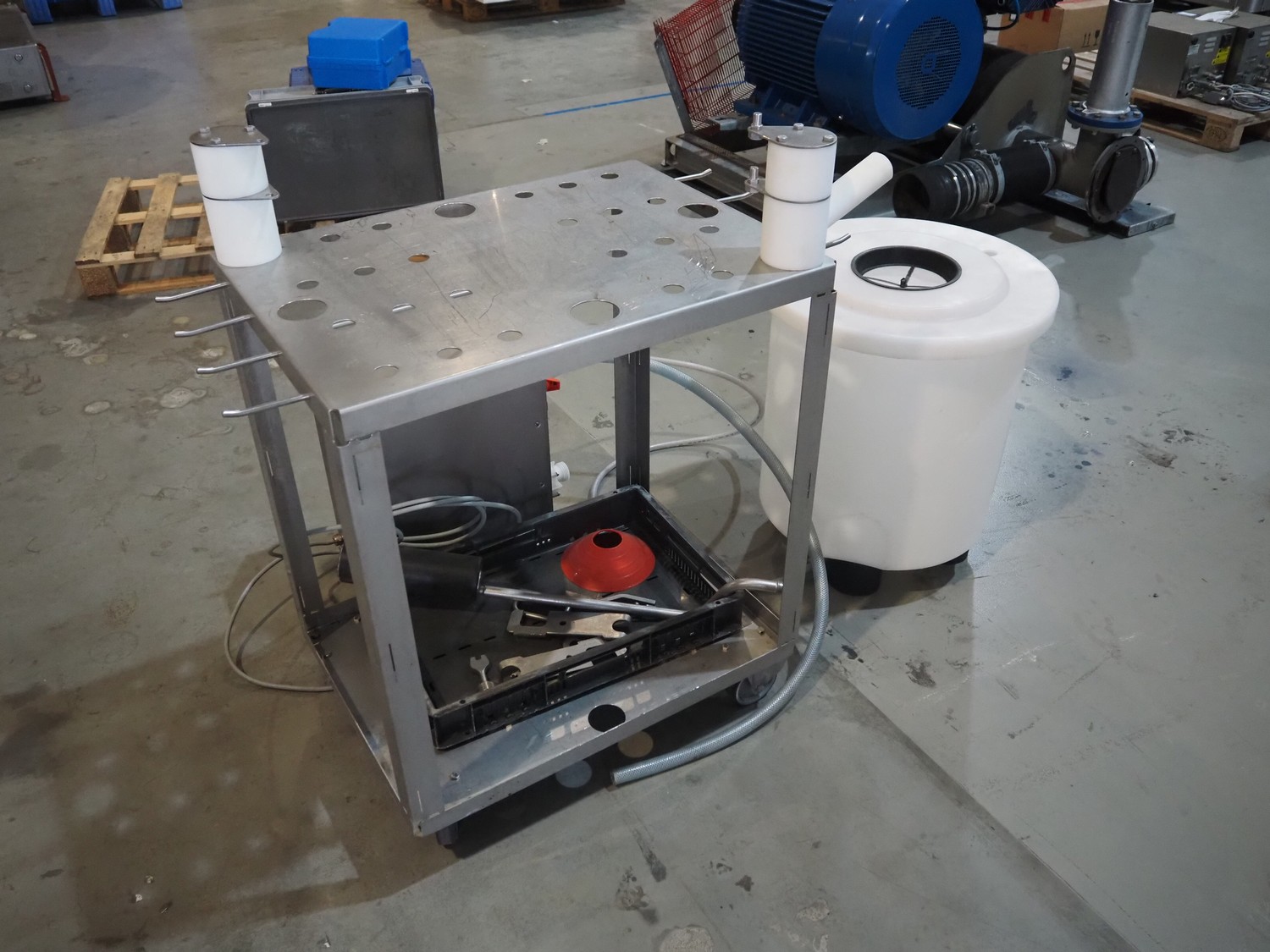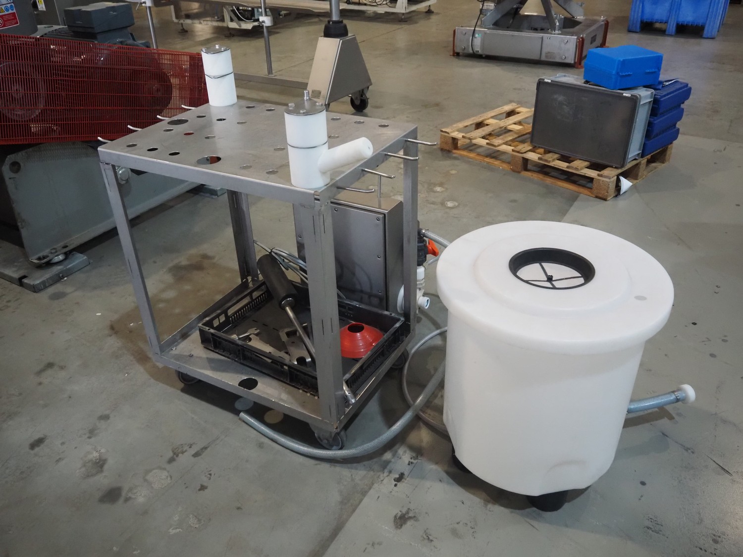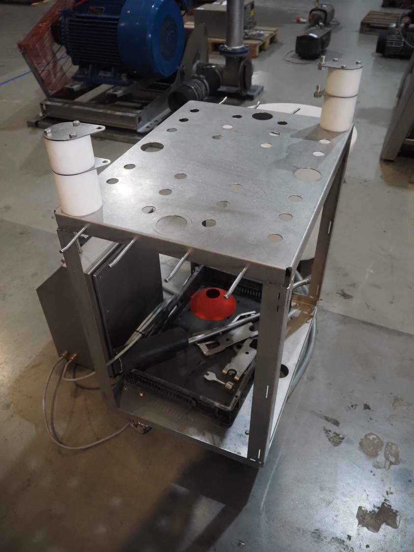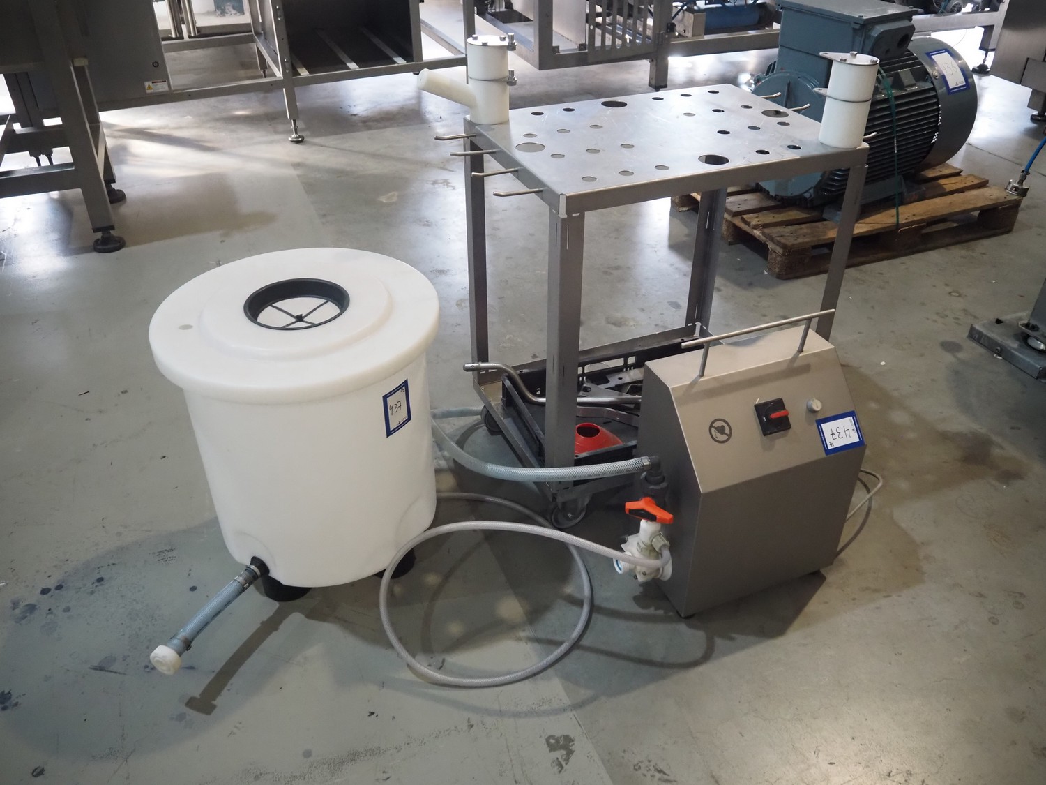 Handtmann coextrusion machine on s/s trolley, type: 150-01, number: 11900653, year of construction: 2019, 400 V, 3 Ph, 50 Hz, 0.9 A, 0.2 kW, dimensions: 950 mm x 700 mm x 1180 mm. With plastic tub, dimensions: Ø 570 mm x 630 mm.