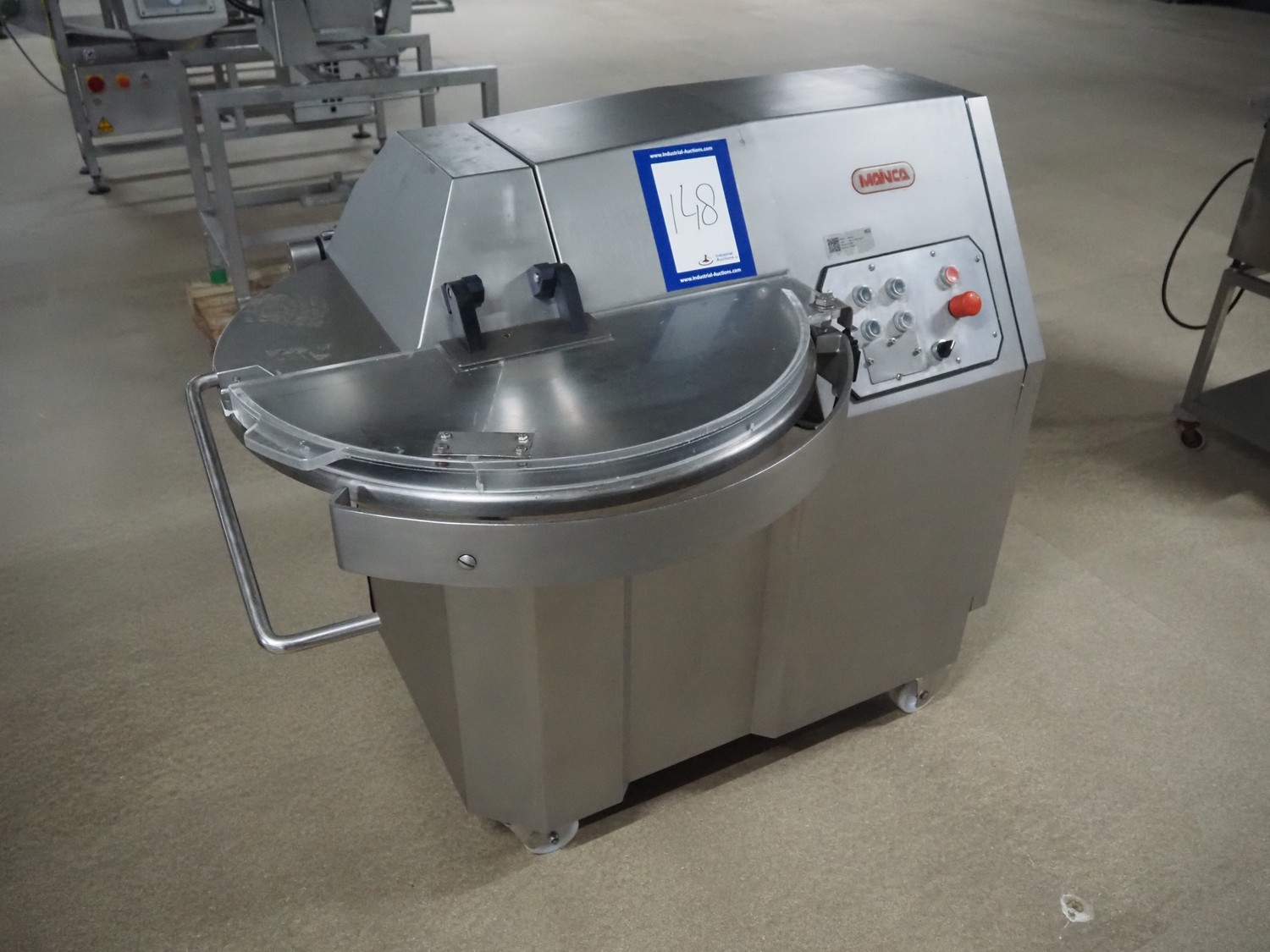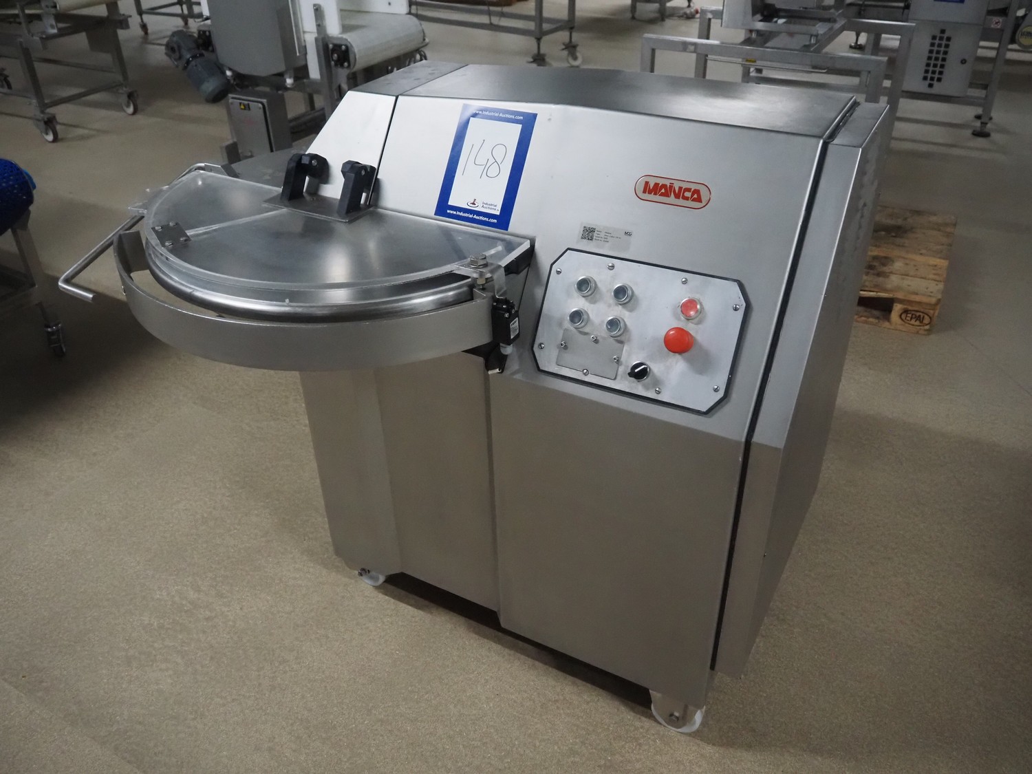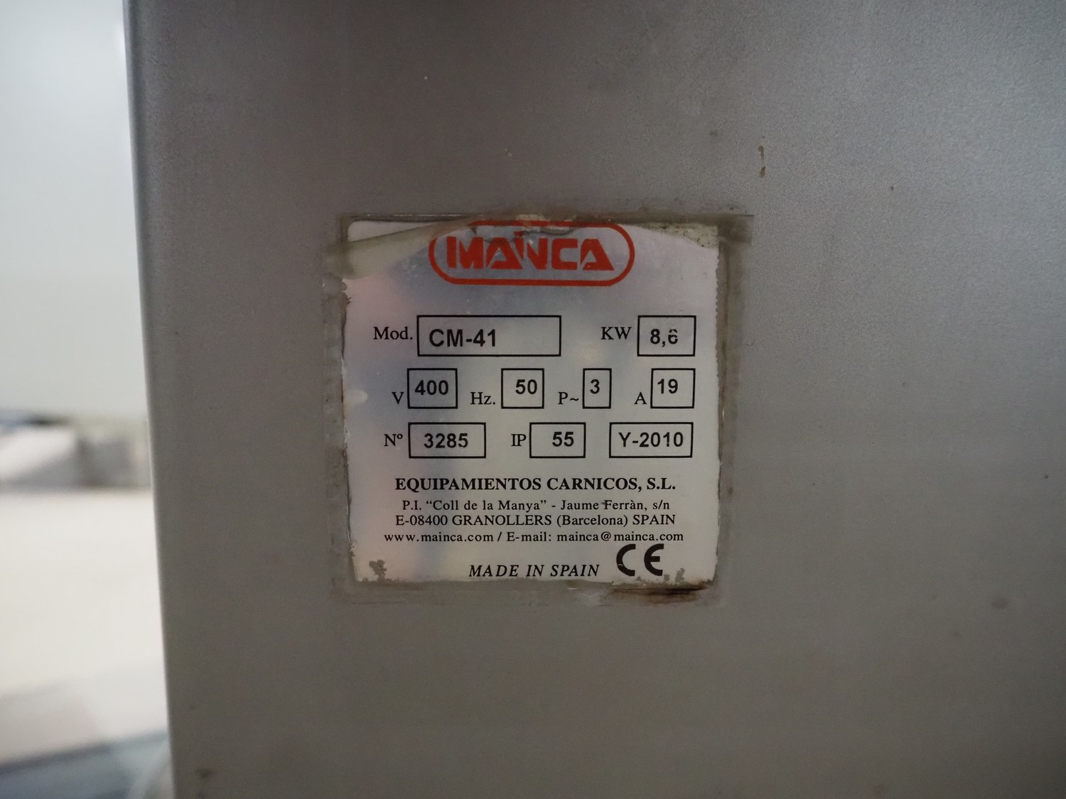Mainca mobile cutter, model: CM-41, number: 3285, year of construction: 2010, 400 V, 3 Ph, 50 Hz, 19 A, 8.6 kW, s/s bowl, volume bowl: 40 liter, s/s knives, 2 speeds, dimensions: 1300 mm x 900 mm x 1100 mm. Including extra knife set.