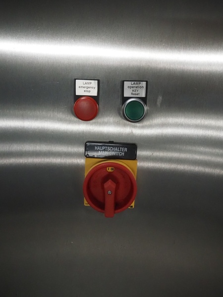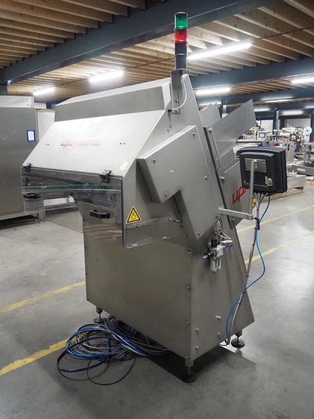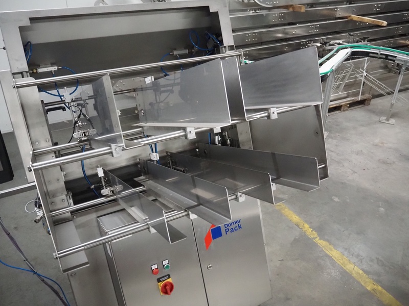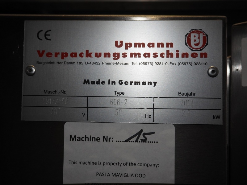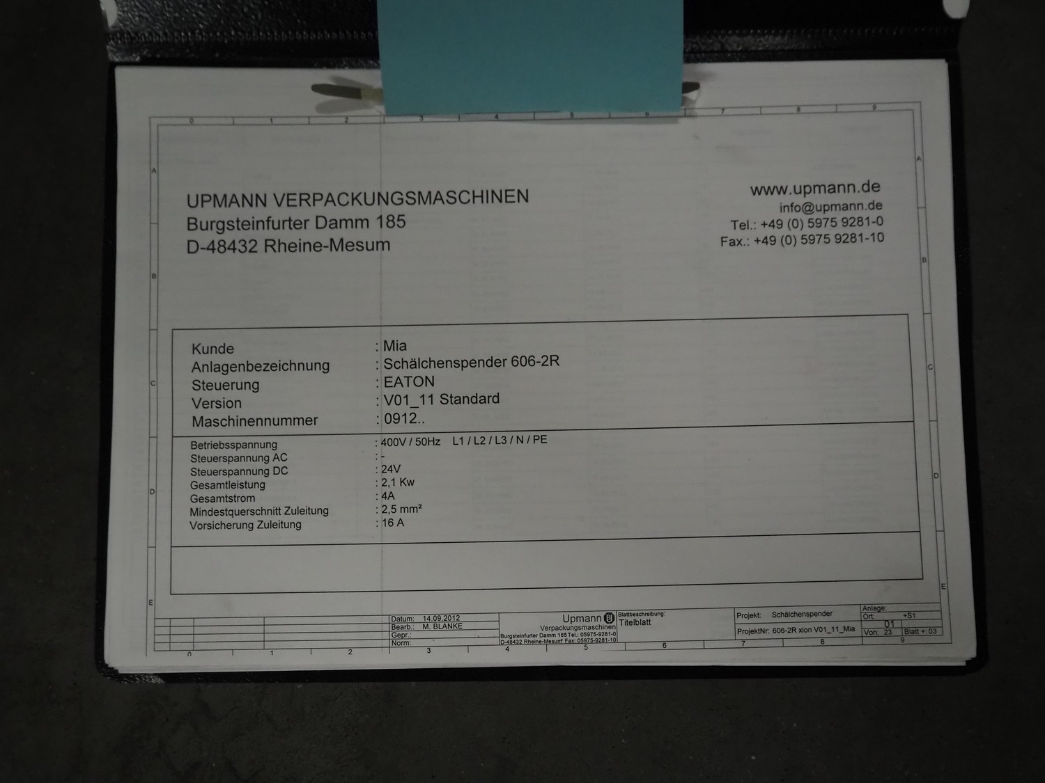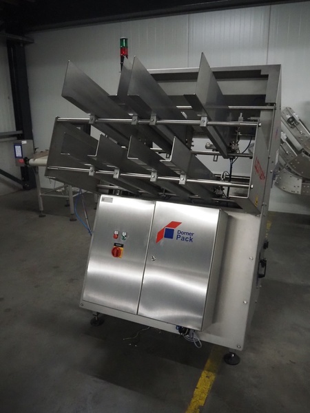 Upmann Verpackungsmaschinen tray denester, type: 606-2, machine number: 09122580, year of construction: 2012, 380 V, 50 Hz, 2.5 kW, 4 nests, clearance: (4x) 210 mm x 240 mm, total dimensions: 1600 mm x 1600 mm x 2100 mm.