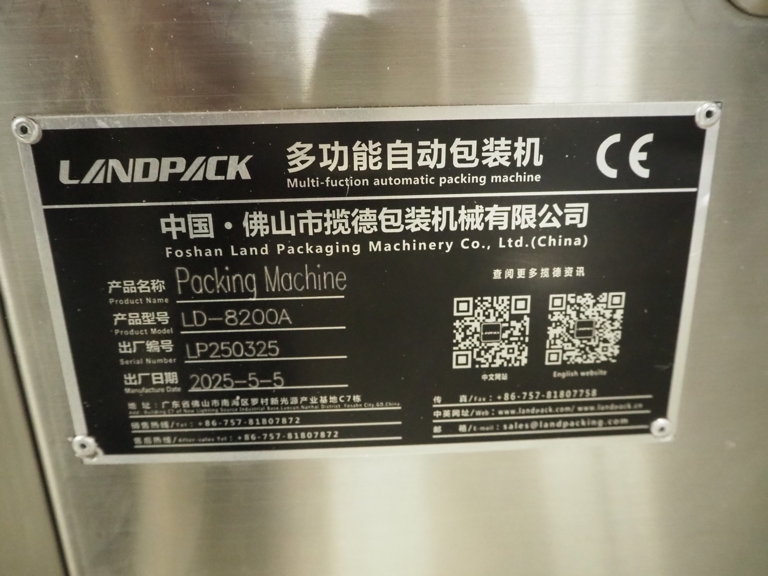 Landpack pouch filling machine, model: :D-8200A, serial number: LP250325, year of construction: 2025-5-5, plastic belt, belt width: 260 mm, dimensions: 2550 mm x 2000 mm x 1500 mm.