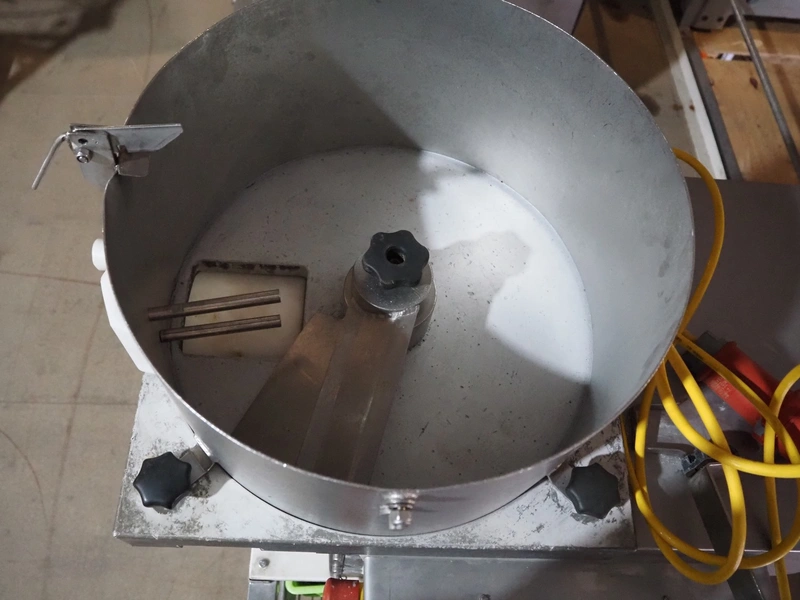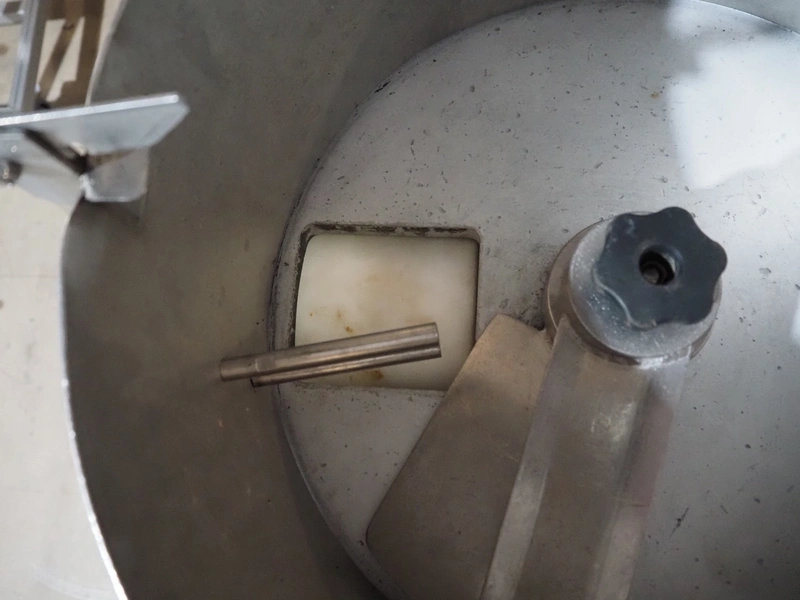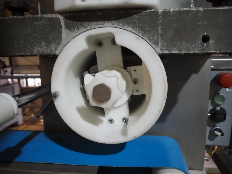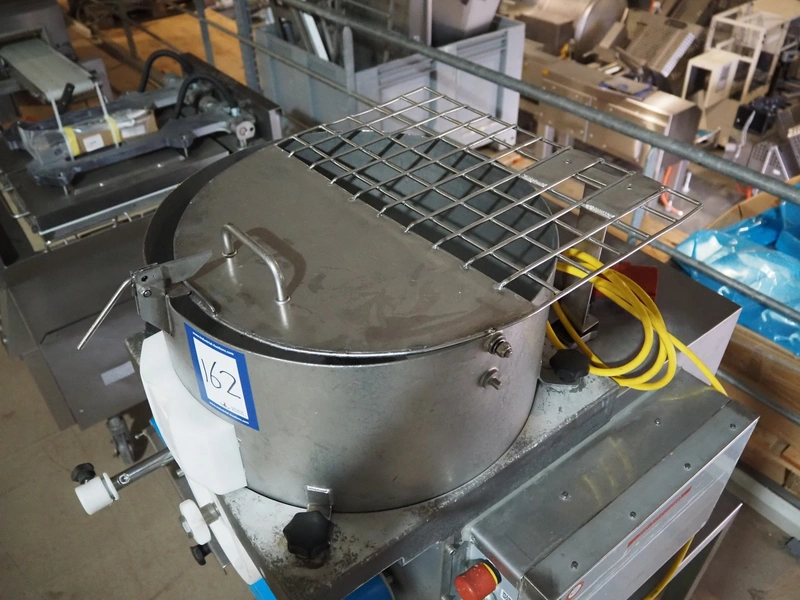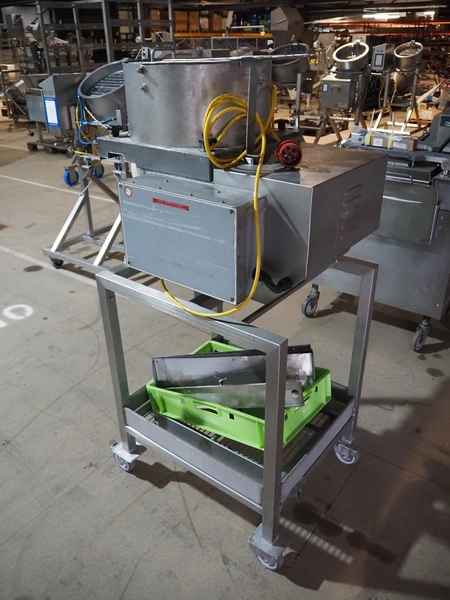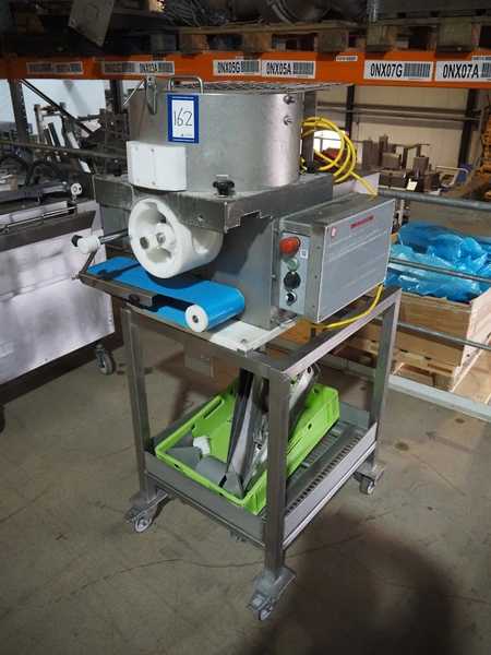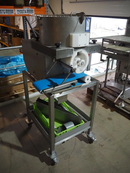 Deighton Manufacturing UK LTD mobile hamburger forming machine with outfeed belt, diameter forms: 85 mm, belt width: 140 mm, total dimensions: 720 mm x 770 mm x 1600 mm.
