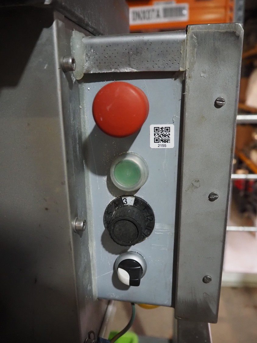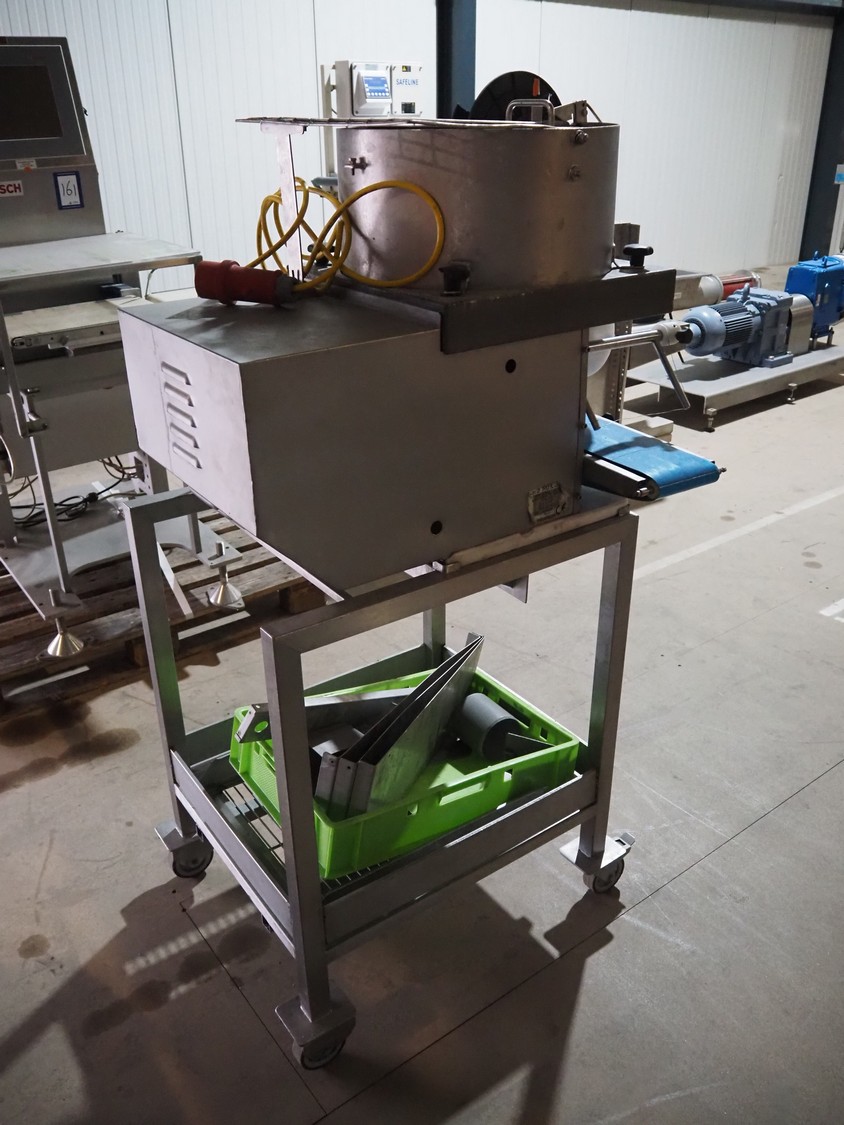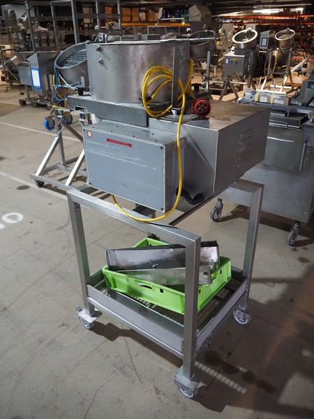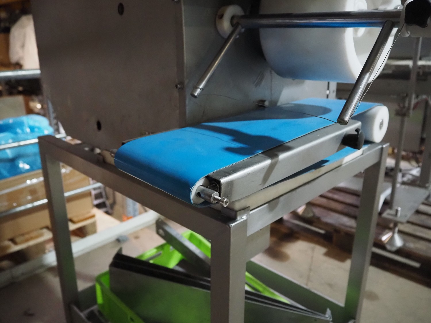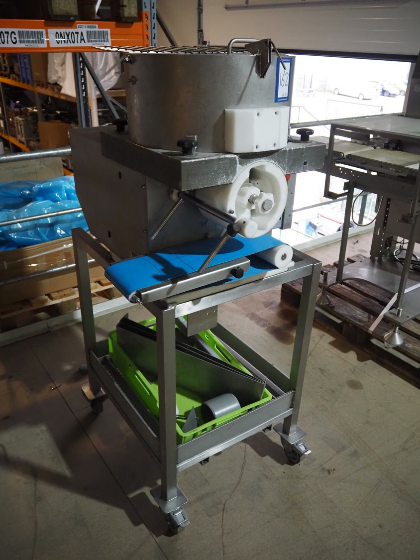 Deighton Manufacturing UK LTD mobile hamburger forming machine with outfeed belt, diameter forms: 85 mm, belt width: 140 mm, total dimensions: 720 mm x 770 mm x 1600 mm.