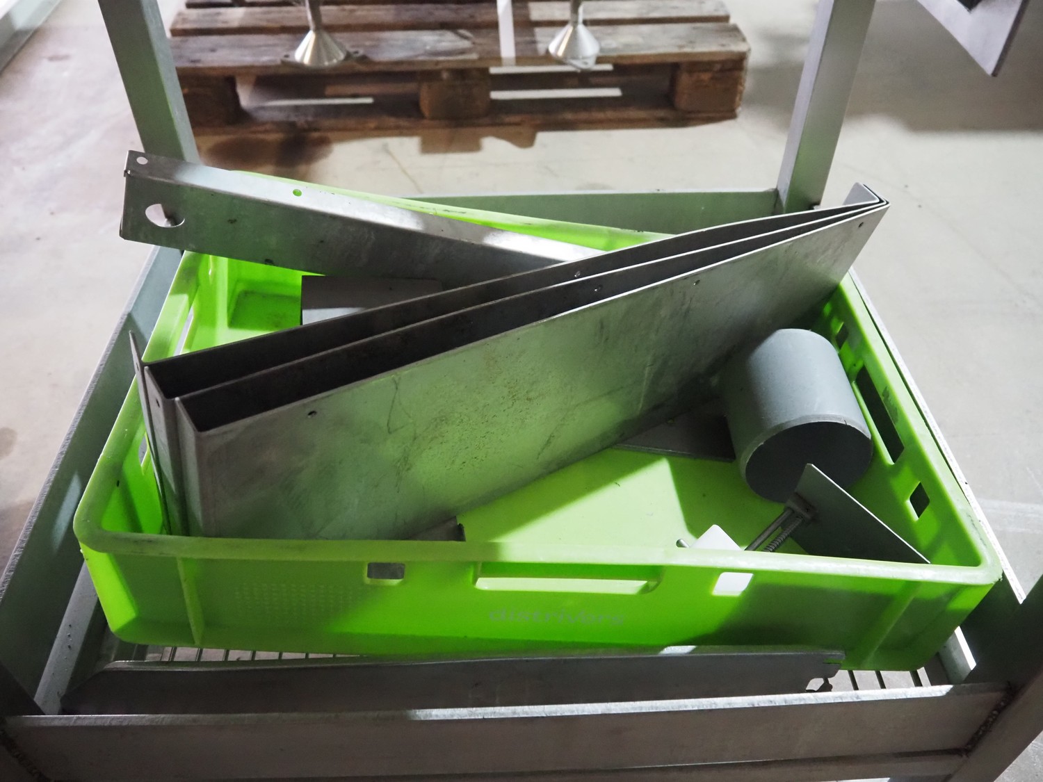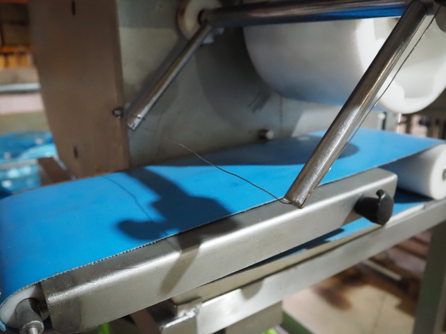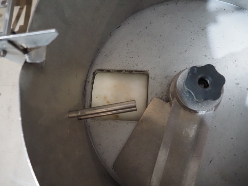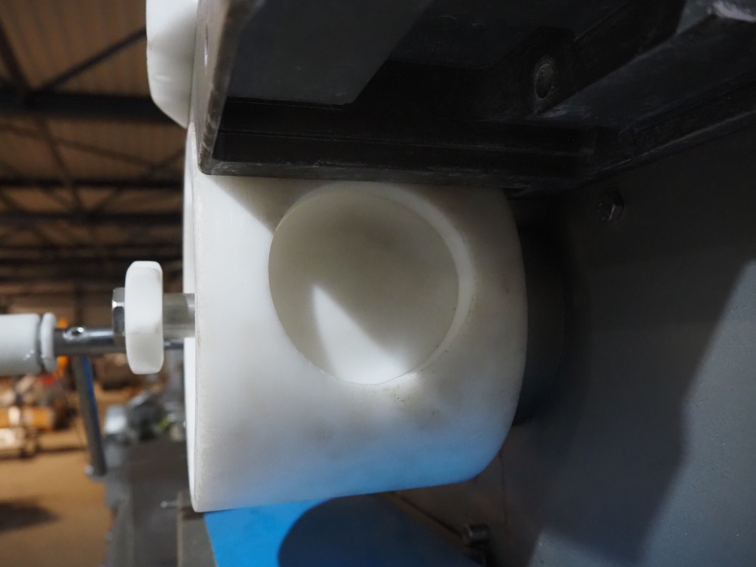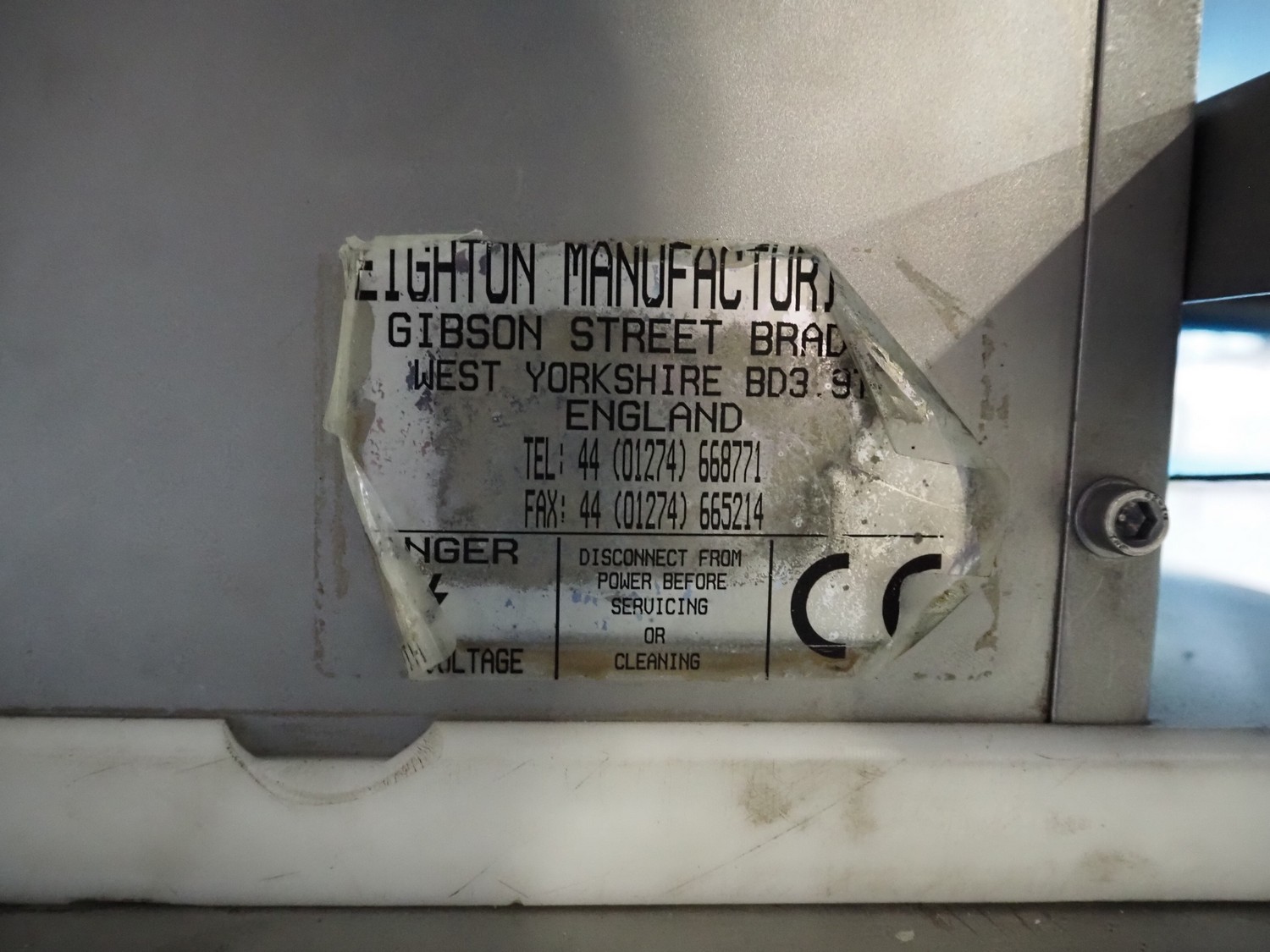 Deighton Manufacturing UK LTD mobile hamburger forming machine with outfeed belt, diameter forms: 85 mm, belt width: 140 mm, total dimensions: 720 mm x 770 mm x 1600 mm.