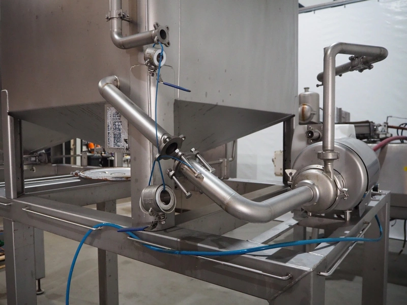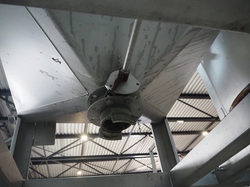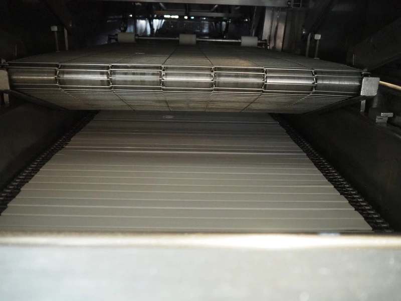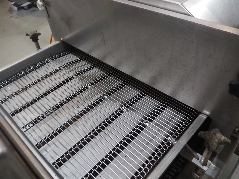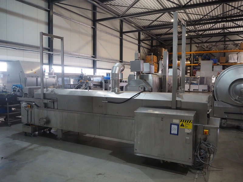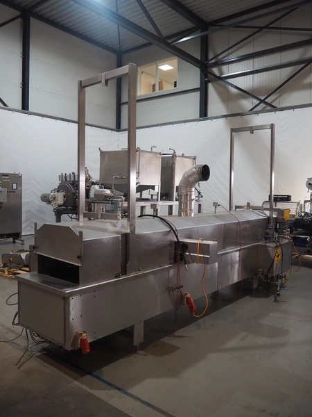 Koppens belt fryer, s/s mesh belt, belt width: 600 mm, total dimensions: 5500 mm x 1400 mm x 2950 mm. With Buls system and s/s frame with 2 silos for oil and pallet with switch cabinet and hoists.