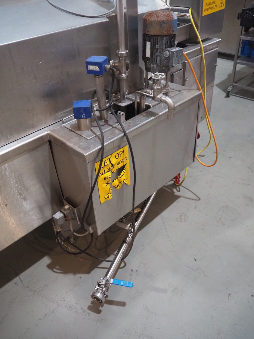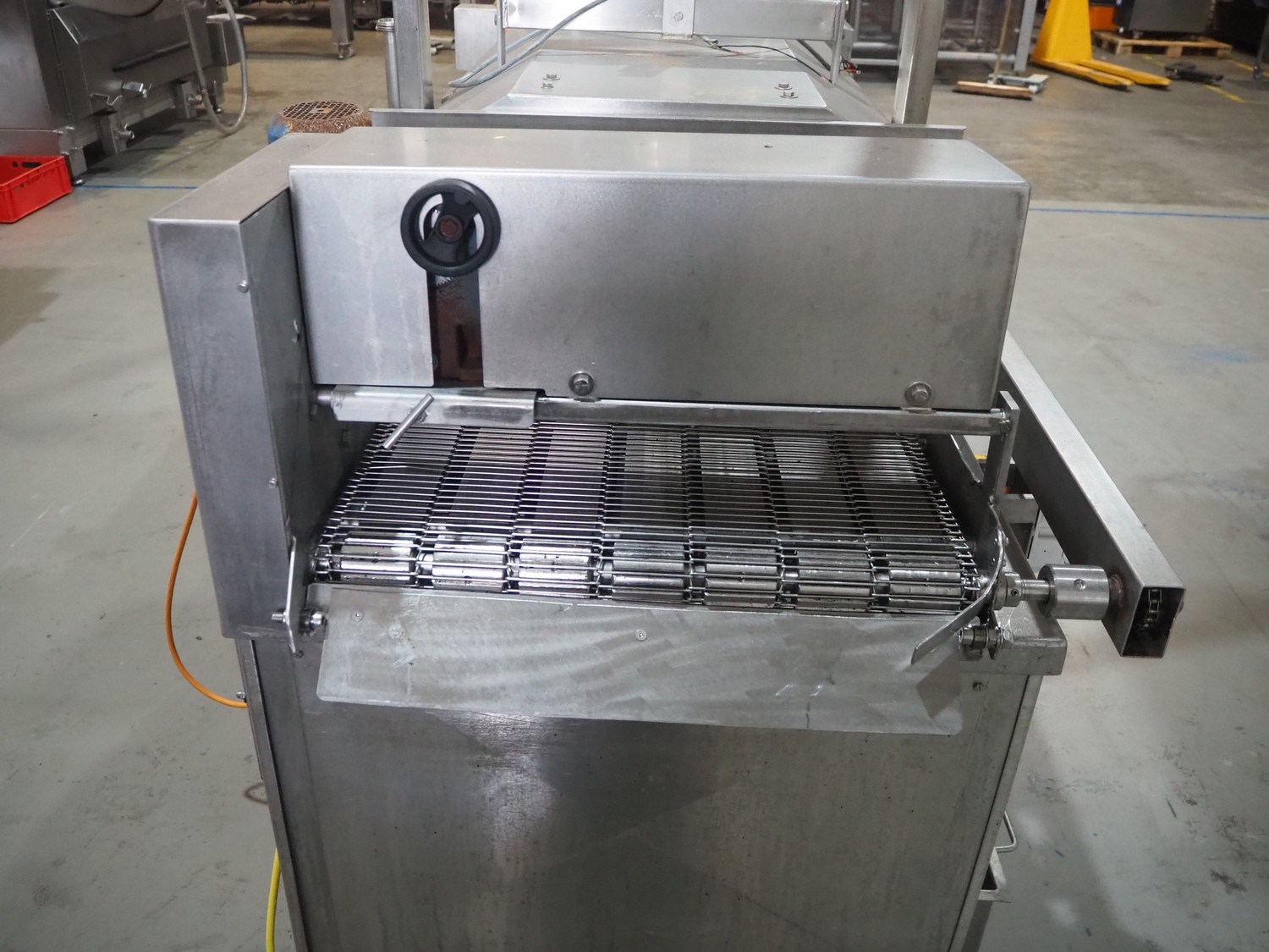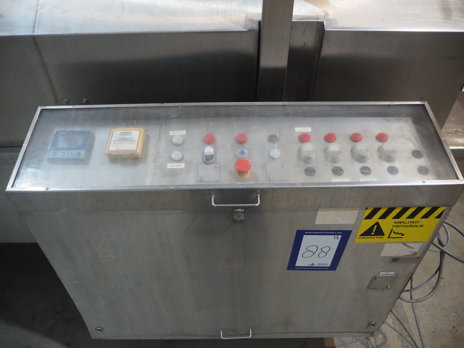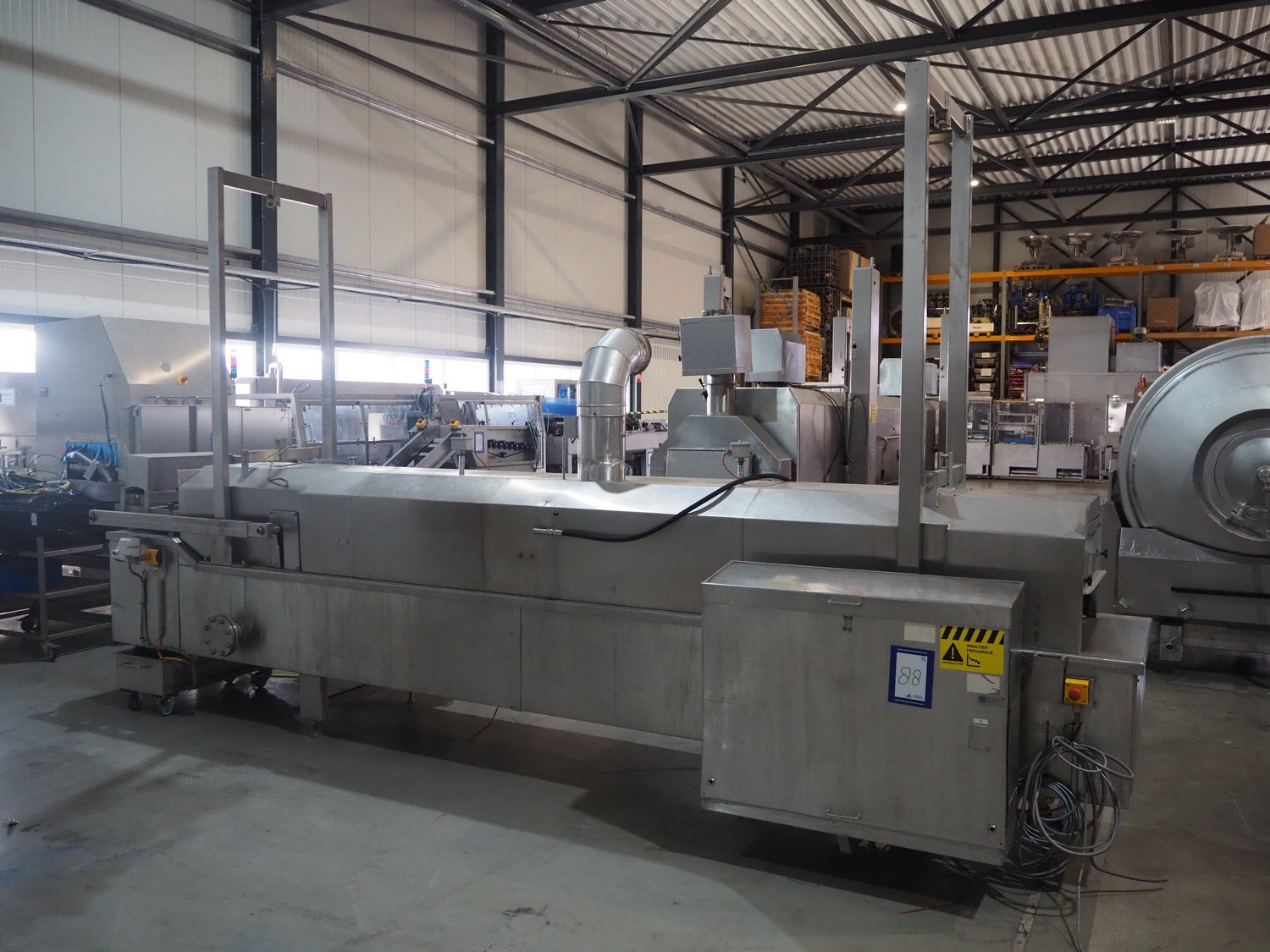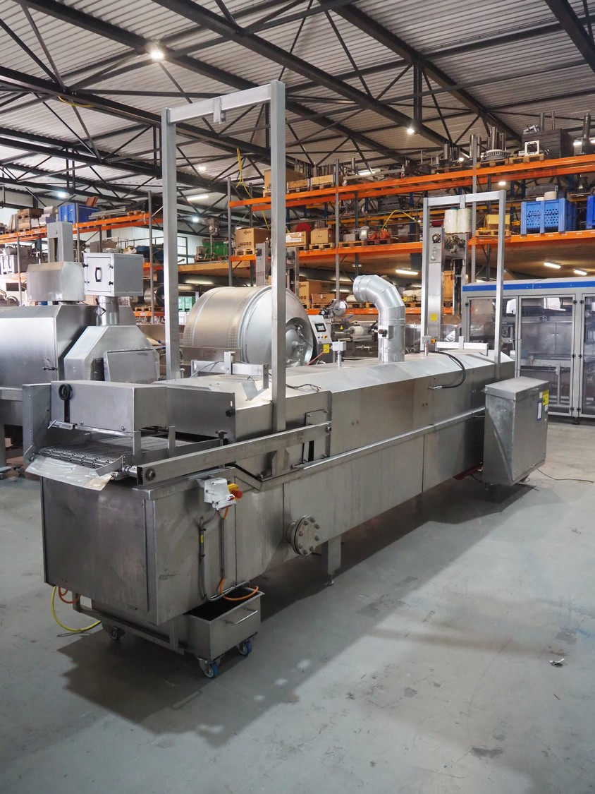 Koppens belt fryer, s/s mesh belt, belt width: 600 mm, total dimensions: 5500 mm x 1400 mm x 2950 mm. With Buls system and s/s frame with 2 silos for oil and pallet with switch cabinet and hoists.