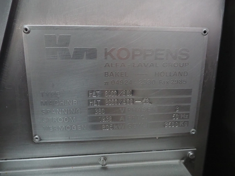 Koppens belt fryer, type: HLT 8000/600, machine number: HLT 8000/600-53, 380 V, 3 Ph, 50 Hz, 19.38 A, 8.05 kW, weight: 3500 kg, s/s belt, belt width: 600 mm, total dimensions: 8100 mm x 2100 mm x 2950 mm.