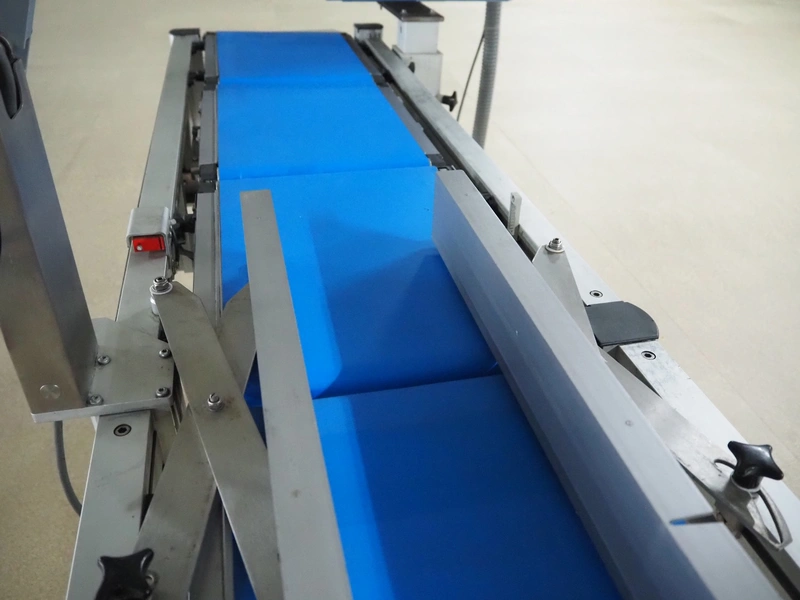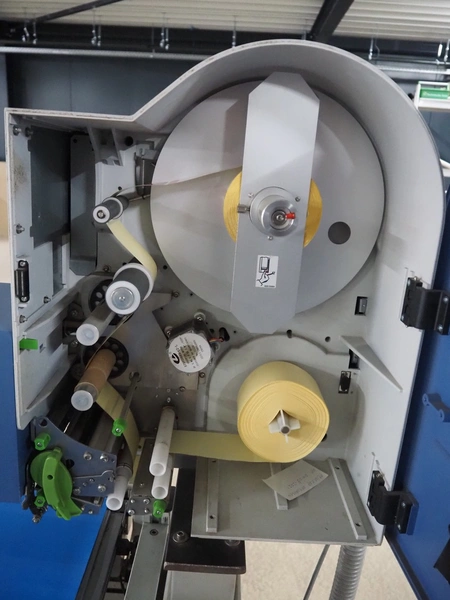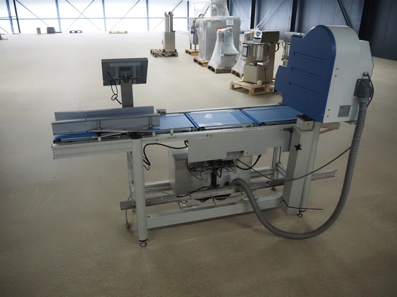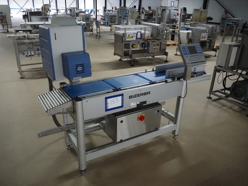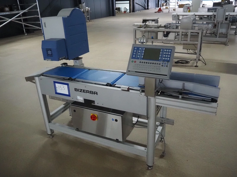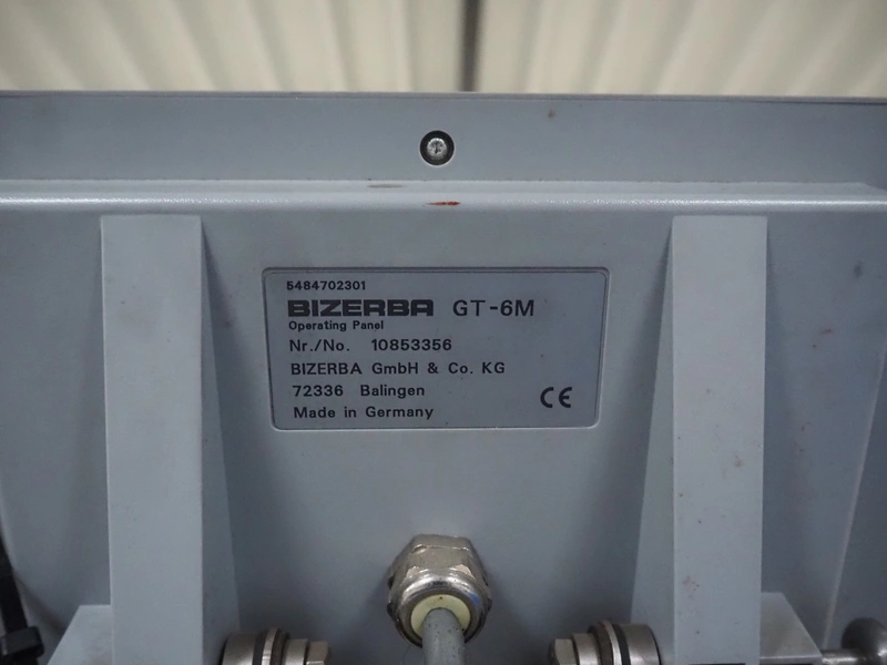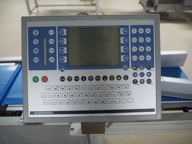 Bizerba weighing and labelling machine, model: GLE and GT-6M, number: 10853612 and 10853356, plastic belt, belt width: 298 mm, total dimensions: 2000 mm x 1000 mm x 1450 mm.
