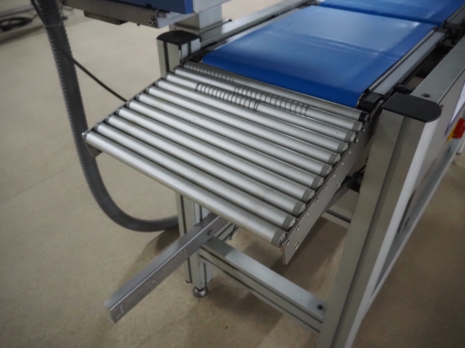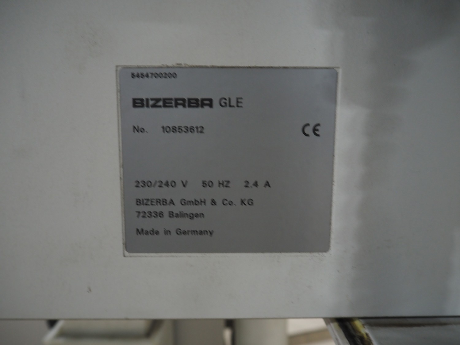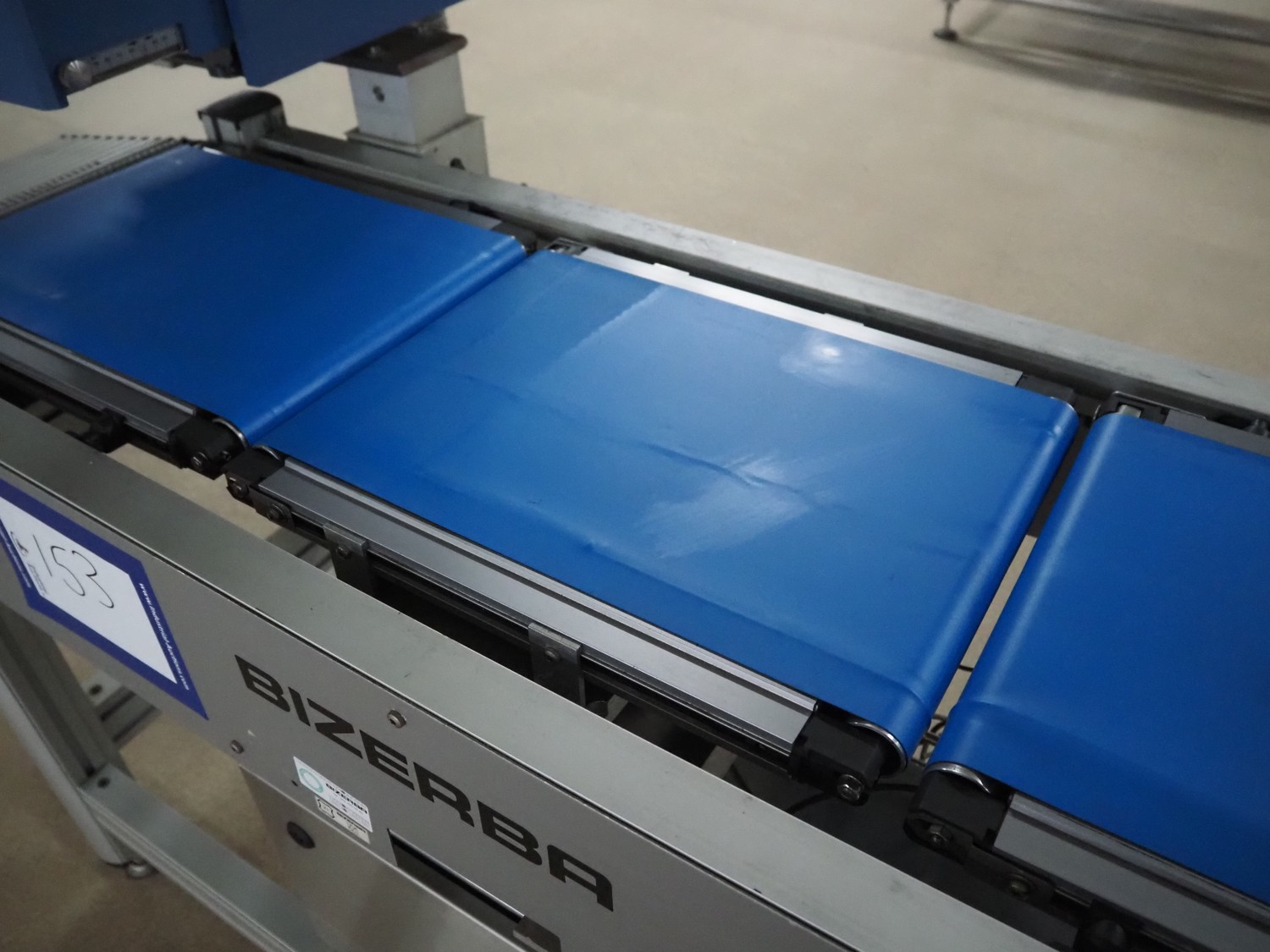 Bizerba weighing and labelling machine, model: GLE and GT-6M, number: 10853612 and 10853356, plastic belt, belt width: 298 mm, total dimensions: 2000 mm x 1000 mm x 1450 mm.