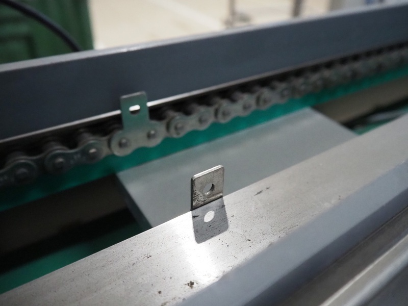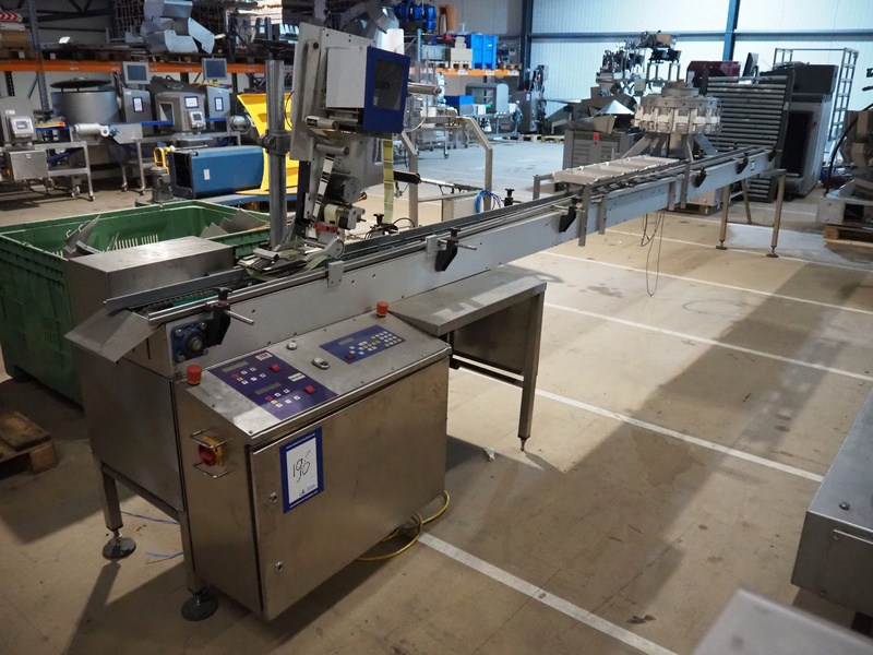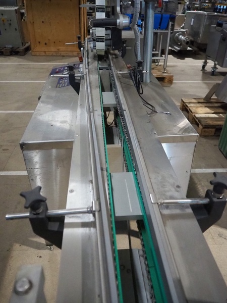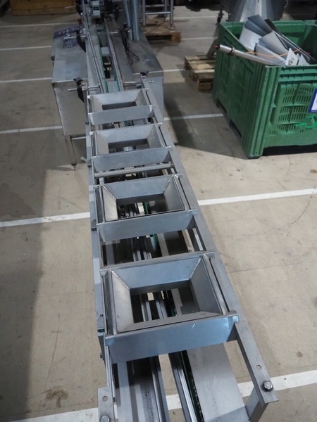 Staan transport belt with Alipack top and bottom labeller, type transport belt: STA B1-00, serial number top labeller: 2893, year of construction: 2007, serial number bottom labeller: 3784, year of construction: 2009, chain belt with dividers, divider height: 15 mm, distance between dividers: 300 mm, total dimensions: 6200 mm x 800 mm x 1650 mm.