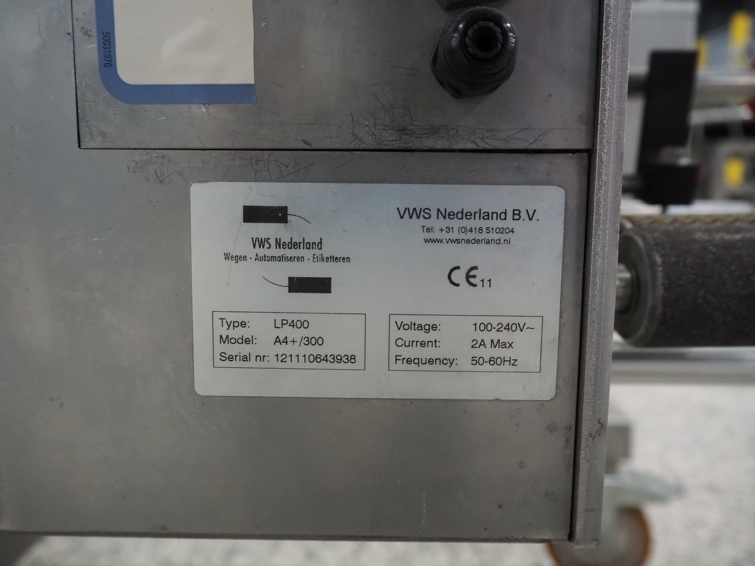 VWS Nederland B.V. mobile labeller, type: LP400, model: A4+/300, serial number: 121110643938, 100-240 V, 50-60 Hz, 2 A, dimensions: 1200 mm x 1000 mm x 1800 mm.