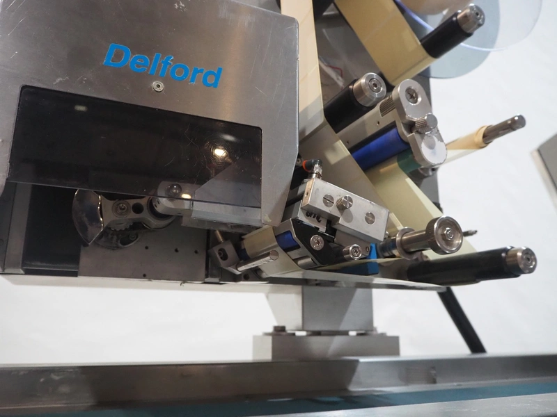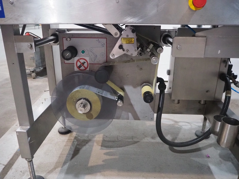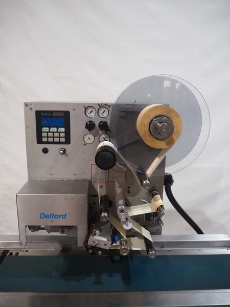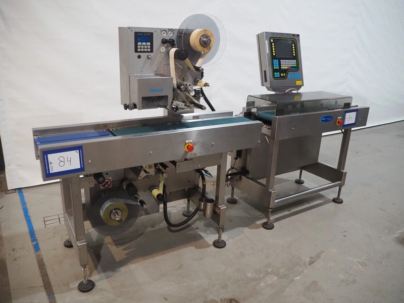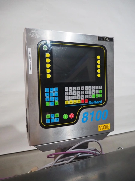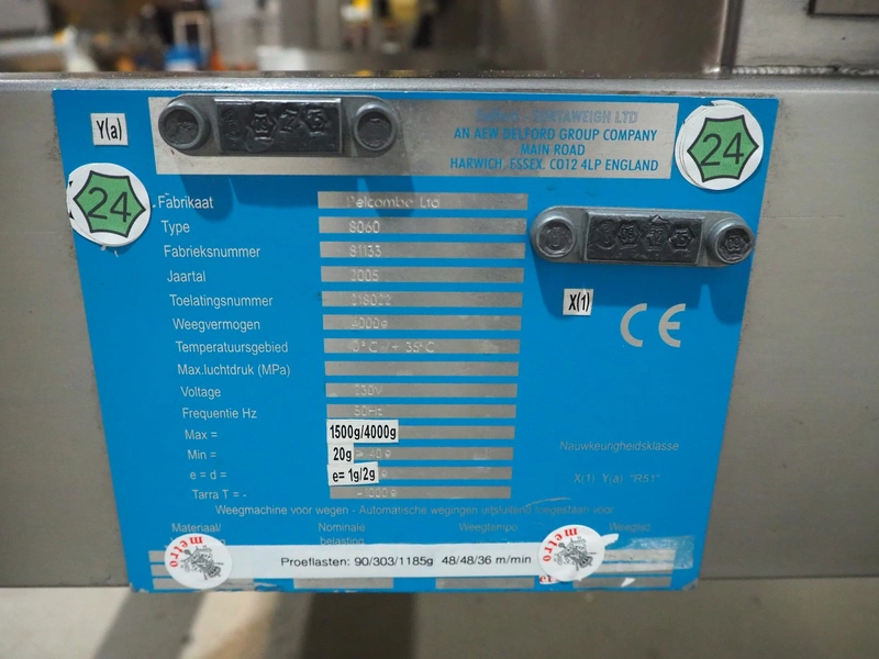 AEW Delford checkweigher with labelling machine, type checkweigher: 8060, fabrication number: 81133, year of construction: 2005, 230 V, 50 Hz, maximum weight: 1500-4000 gram, minimum weight: 20-40 gram, e =1-2 gram, T = -1000 gram, type labeller: 8000, plastic belt, belt width: (2x) 90 mm and 195 mm, dimensions checkweigher: 1500 mm x 700 mm x 1630 mm and dimensions labelling machine: 1200 mm x 700 mm x 1530 mm.