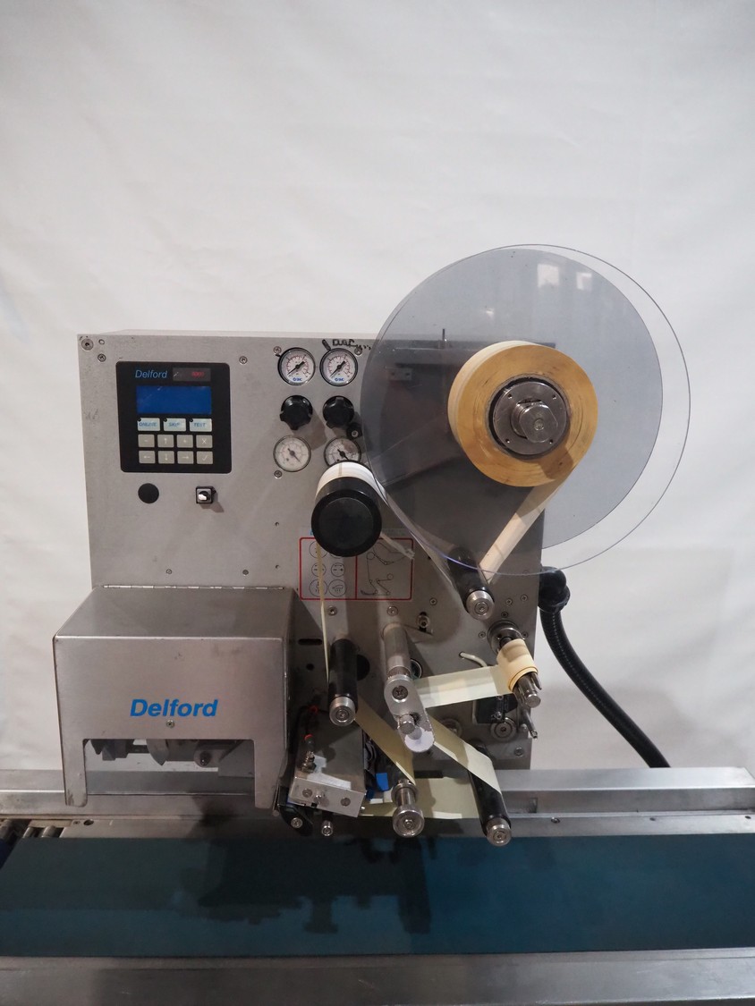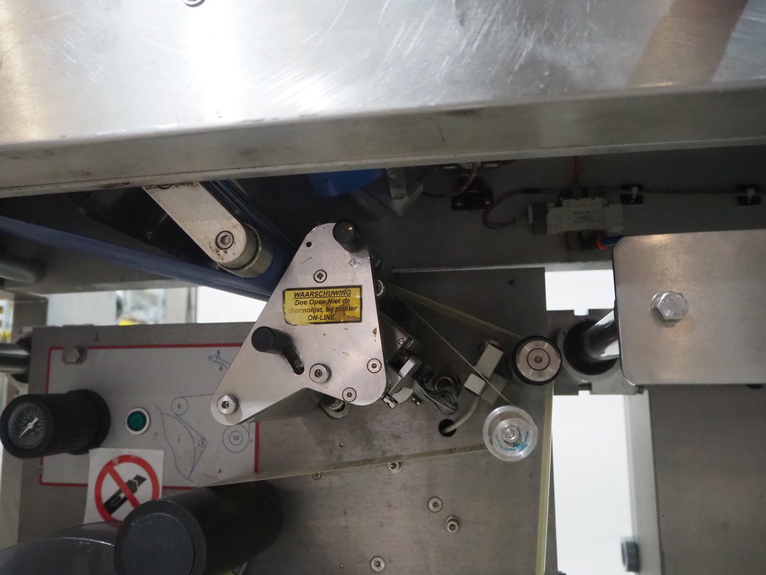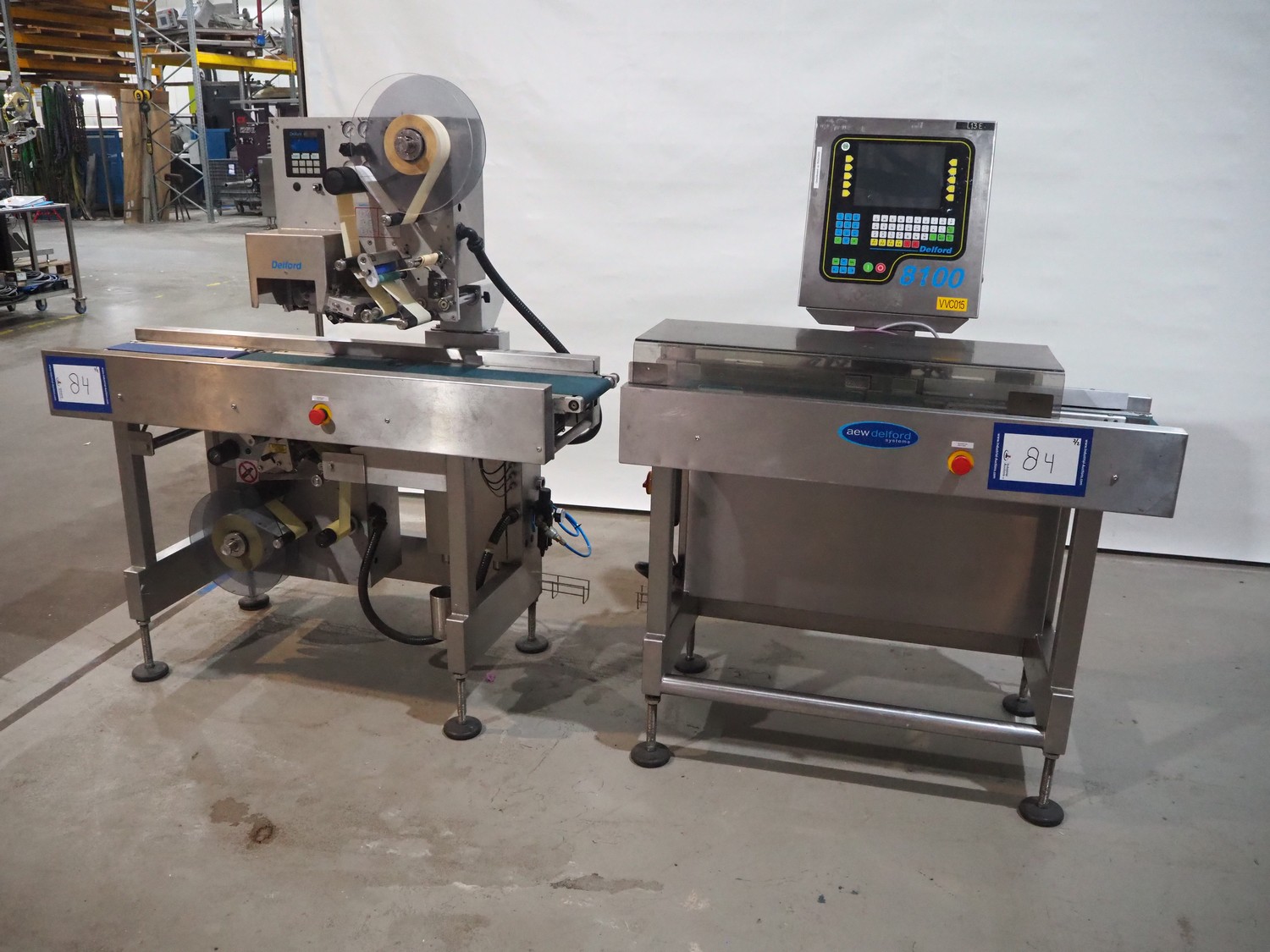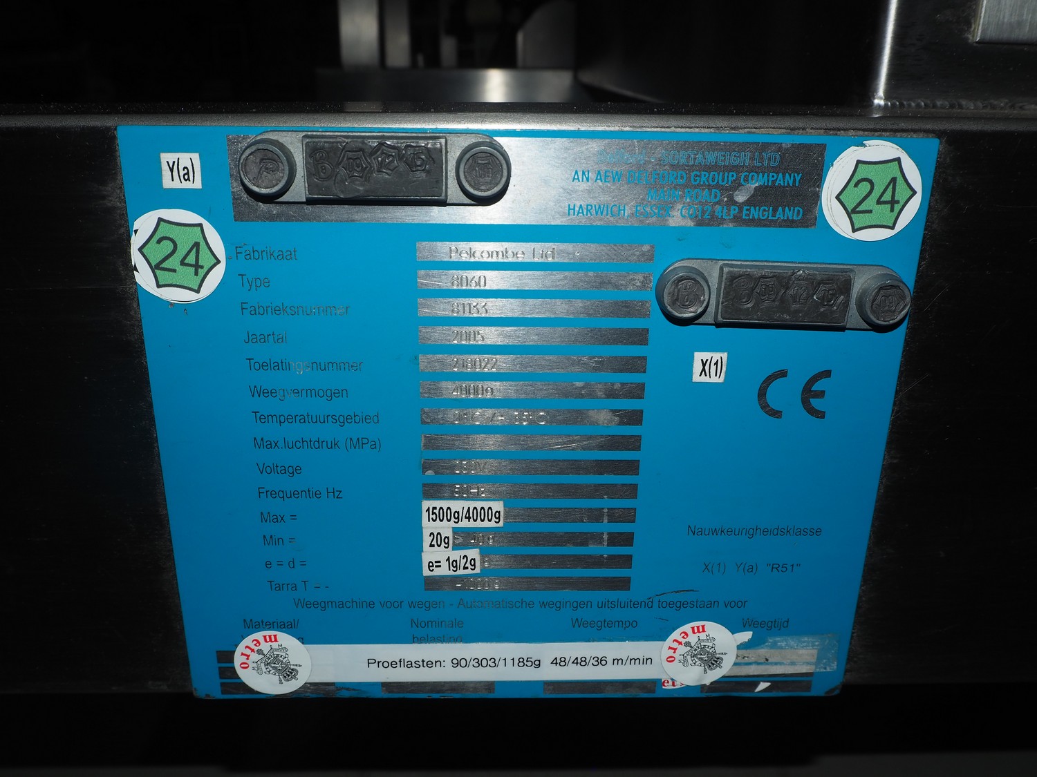 AEW Delford checkweigher with labelling machine, type checkweigher: 8060, fabrication number: 81133, year of construction: 2005, 230 V, 50 Hz, maximum weight: 1500-4000 gram, minimum weight: 20-40 gram, e =1-2 gram, T = -1000 gram, type labeller: 8000, plastic belt, belt width: (2x) 90 mm and 195 mm, dimensions checkweigher: 1500 mm x 700 mm x 1630 mm and dimensions labelling machine: 1200 mm x 700 mm x 1530 mm.