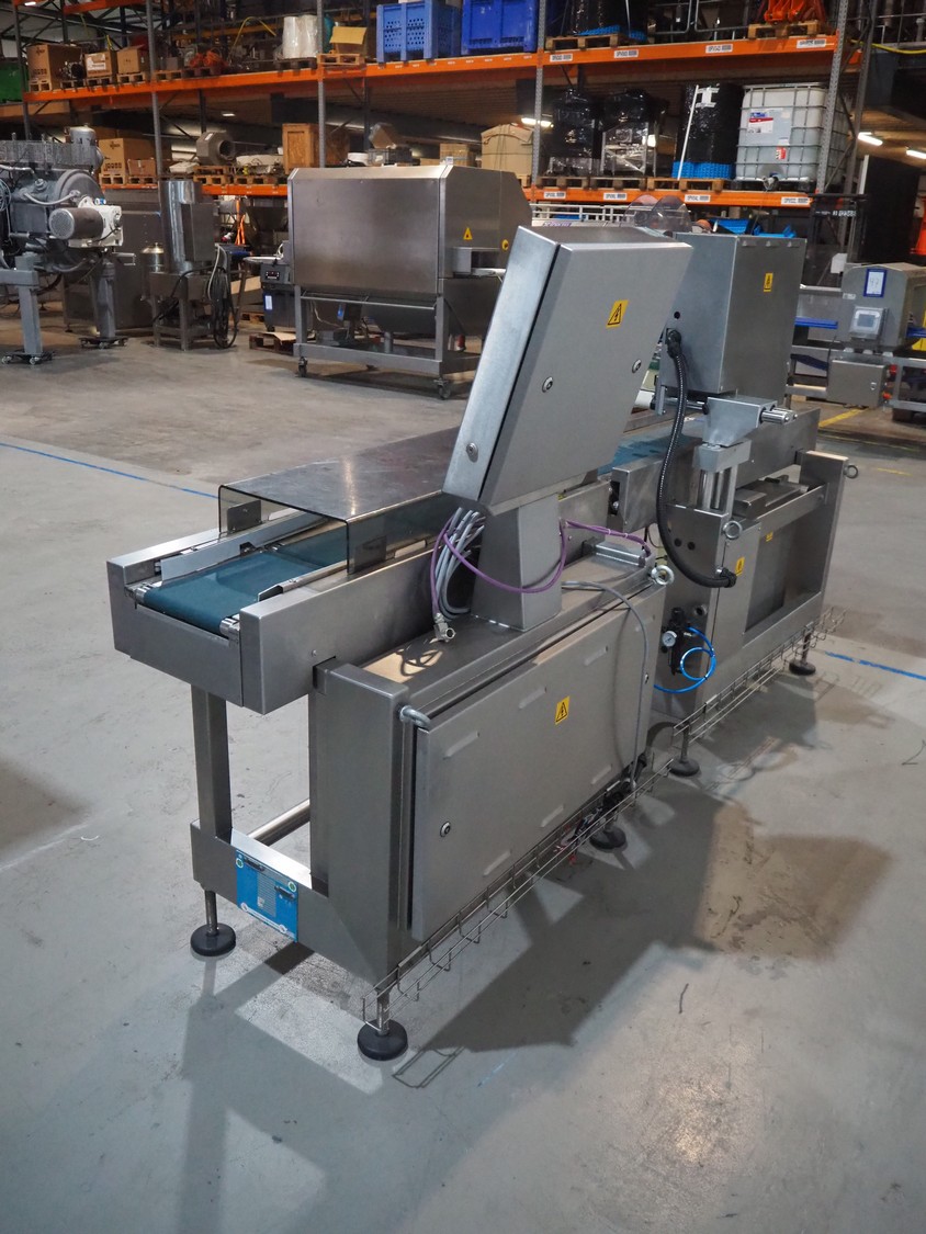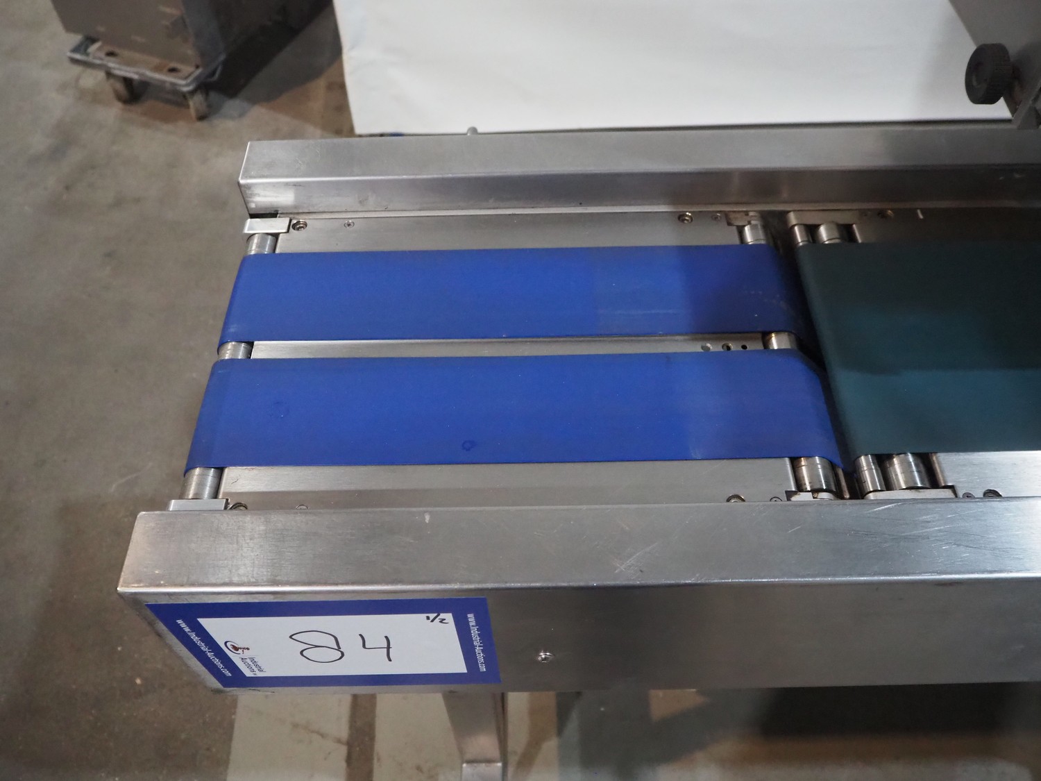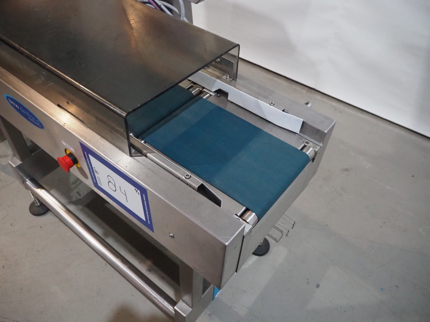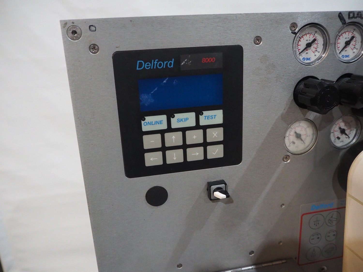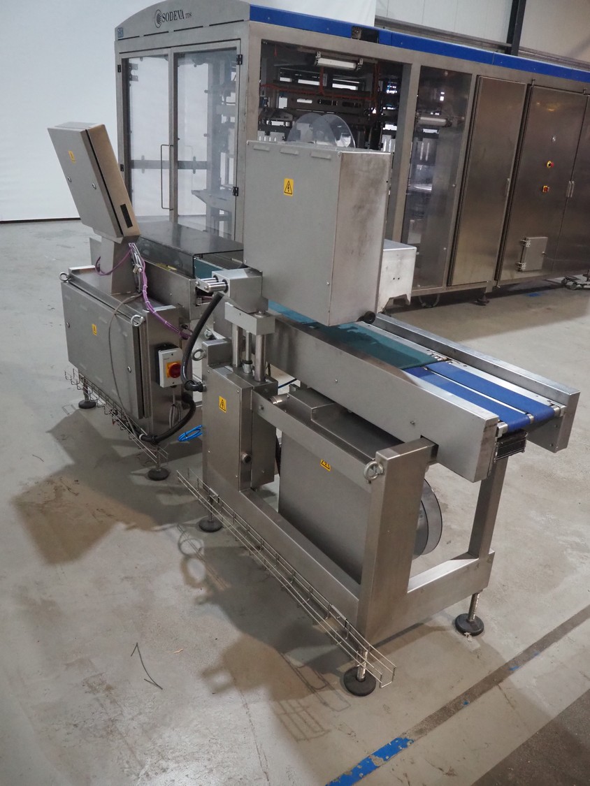 AEW Delford checkweigher with labelling machine, type checkweigher: 8060, fabrication number: 81133, year of construction: 2005, 230 V, 50 Hz, maximum weight: 1500-4000 gram, minimum weight: 20-40 gram, e =1-2 gram, T = -1000 gram, type labeller: 8000, plastic belt, belt width: (2x) 90 mm and 195 mm, dimensions checkweigher: 1500 mm x 700 mm x 1630 mm and dimensions labelling machine: 1200 mm x 700 mm x 1530 mm.