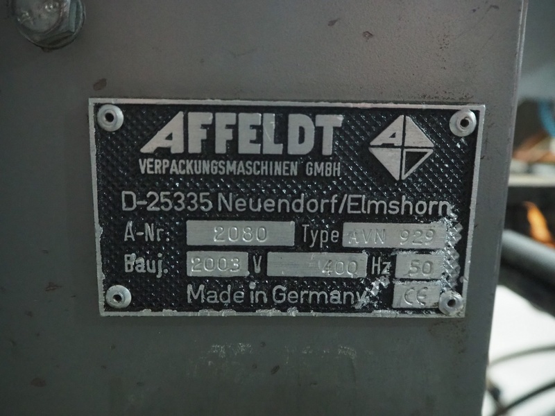 Affeldt netting machine, type: AVN 929, number: 2080, year of construction: 2003, 400 V, 50 Hz, diameter clearance: 185 mm, total dimensions: 1850 mm x 1200 mm x 1800 mm.