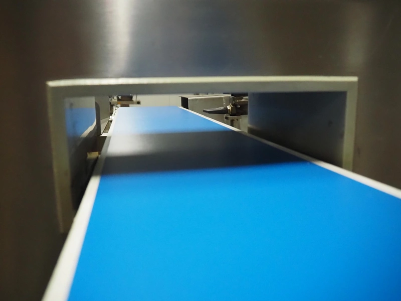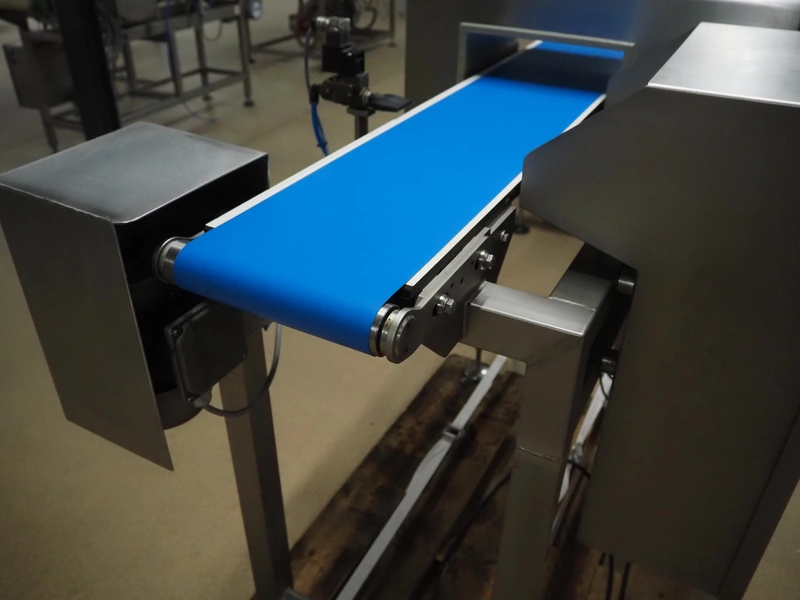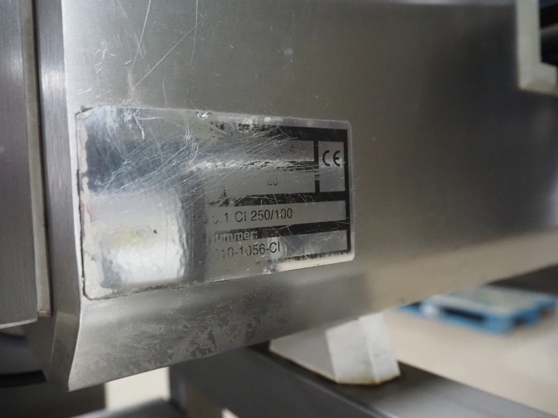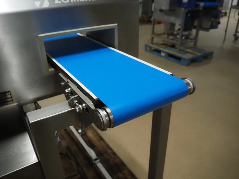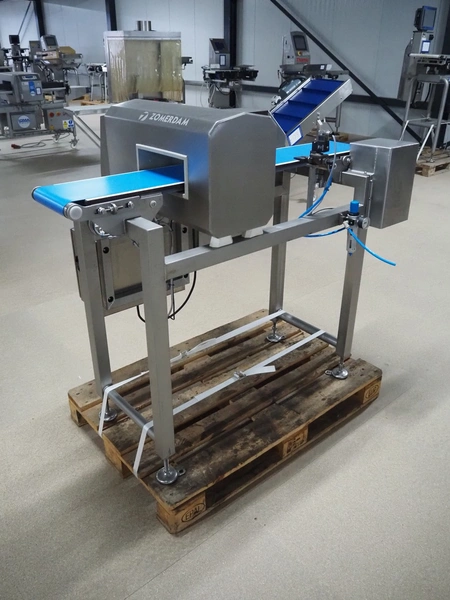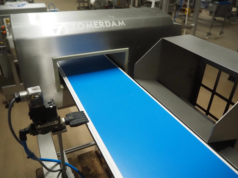Zomerdam metaldetector with rejector, number: 010-1056-CI, plastic belt, belt width: 200 mm, clearance: 250 mm x 70 mm, total dimensions: 1350 mm x 800 mm x 1200 mm.