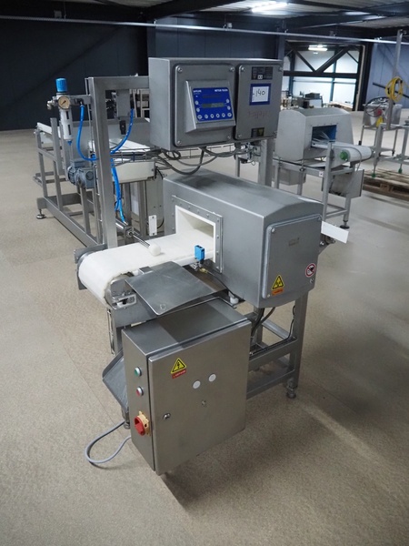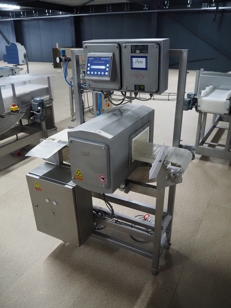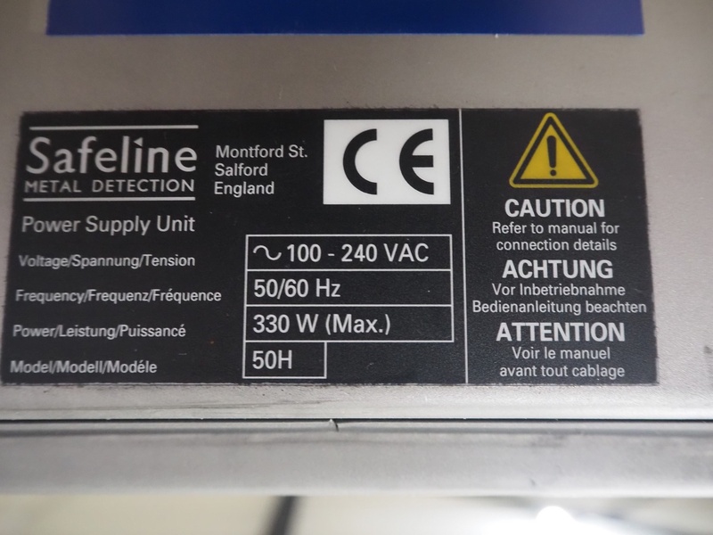 Safeline / Mettler Toledo metal detector with rejector, 100-240 V, 50/60 Hz, 330 W, plastic belt, belt width: 210 mm, clearance: 250 mm x 90 mm, total dimensions: 1100 mm x 800 mm x 1530 mm.