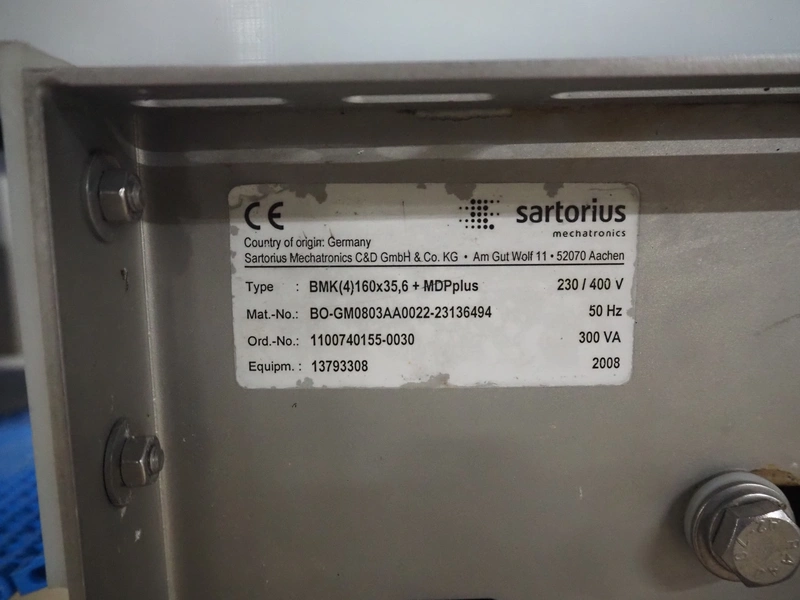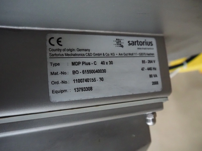 Sartorius mobile metal detector, type: MDP Plus-C 40x30, number: BO-61550040030, year of construction: 2008, 85-264 V, 47-440 Hz, 80 VA, plastic mesh belt, belt width: 355 mm, clearance: 350 mm x 125 mm, total dimensions: 1600 mm x 1000 mm x 1430 mm.