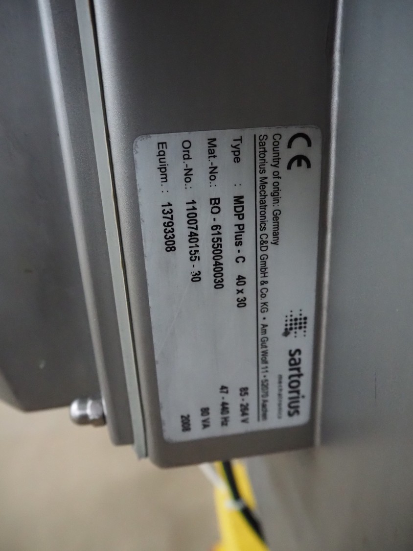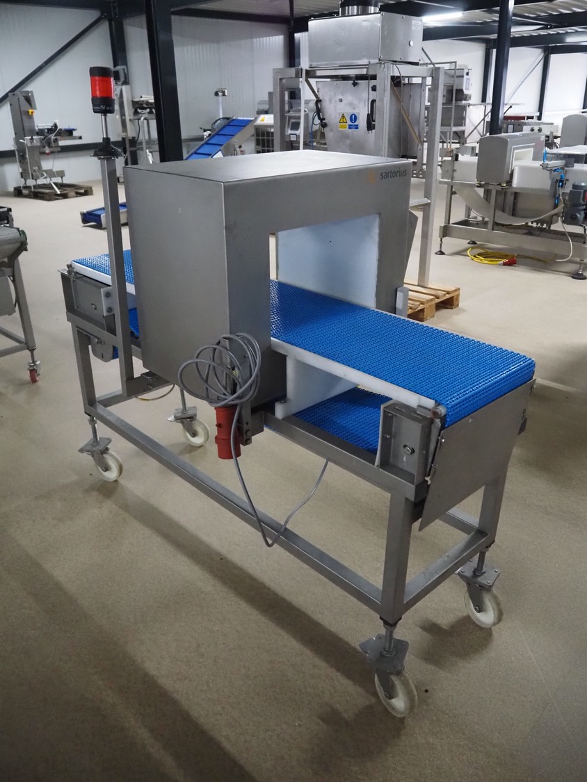 Sartorius mobile metal detector, type: MDP Plus-C 40x30, number: BO-61550040030, year of construction: 2008, 85-264 V, 47-440 Hz, 80 VA, plastic mesh belt, belt width: 355 mm, clearance: 350 mm x 125 mm, total dimensions: 1600 mm x 1000 mm x 1430 mm.