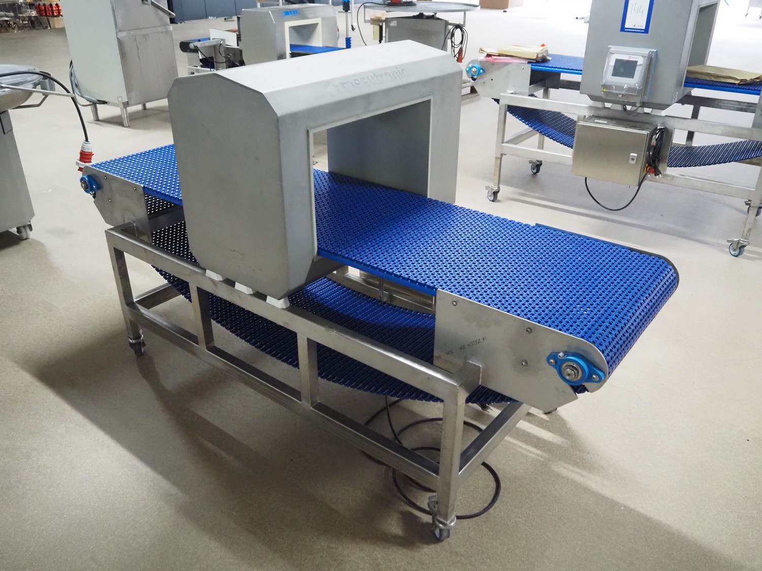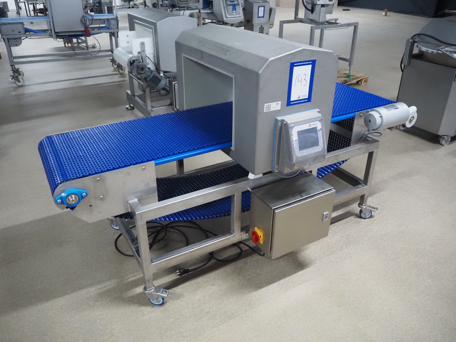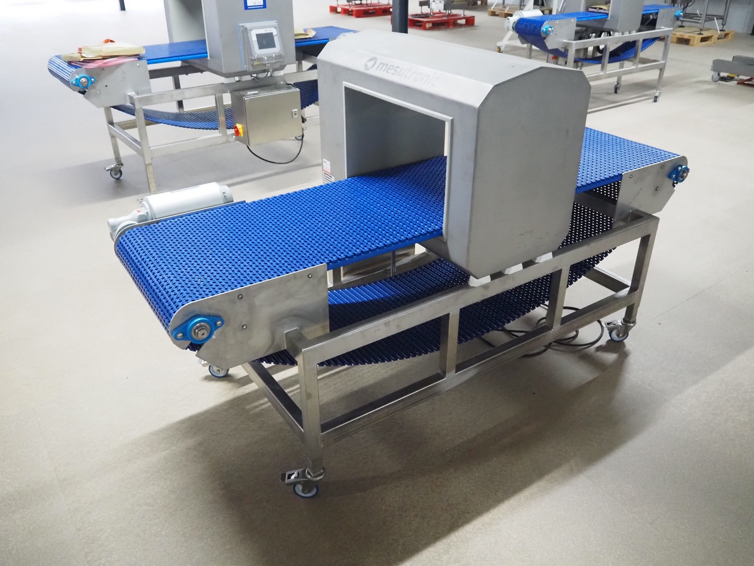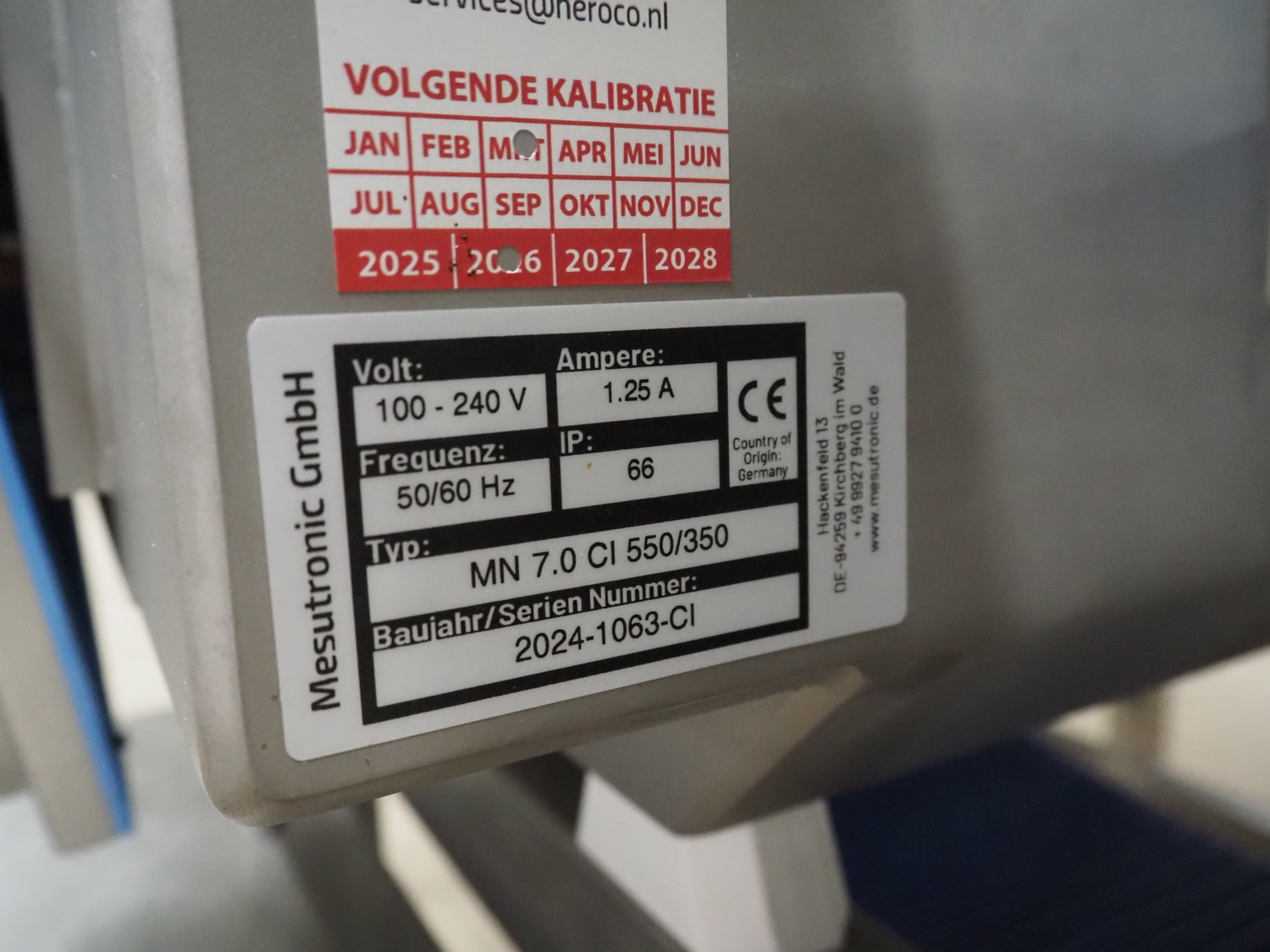 Mesutronic GmbH mobile metal detector, type: MN 7.0 CI 550/350, serial number: 1063-CI, year of construction: 2024, 100-240 V, 50/60 Hz, 1.25 A, calibrated until March 2026, plastic mesh belt, belt width: 520 mm, clearance: 550 mm x 320 mm, total dimensions: 2150 mm x 1050 mm x 1450 mm.