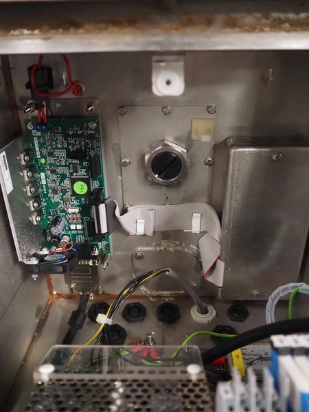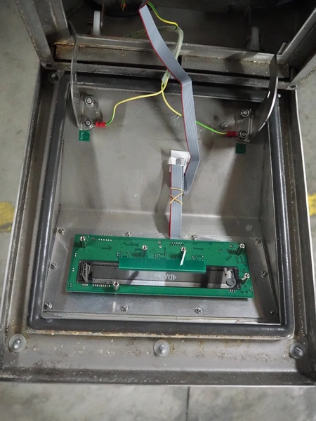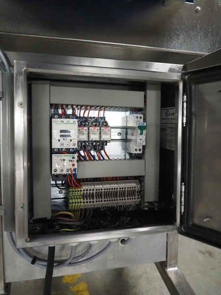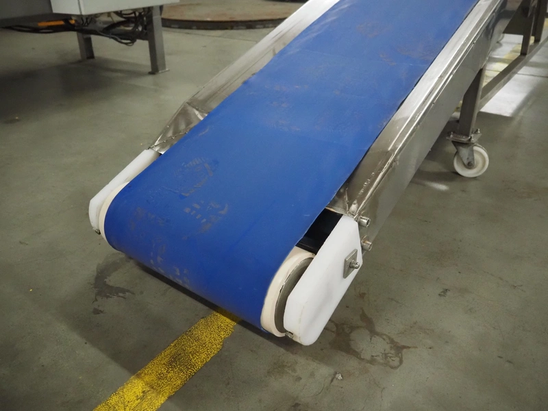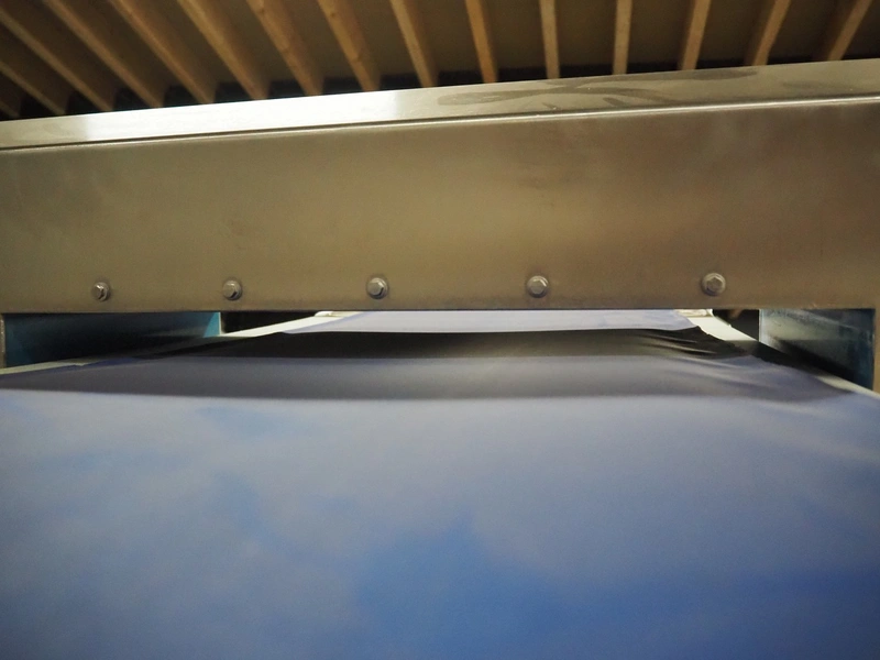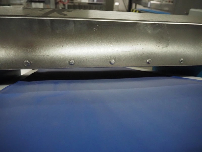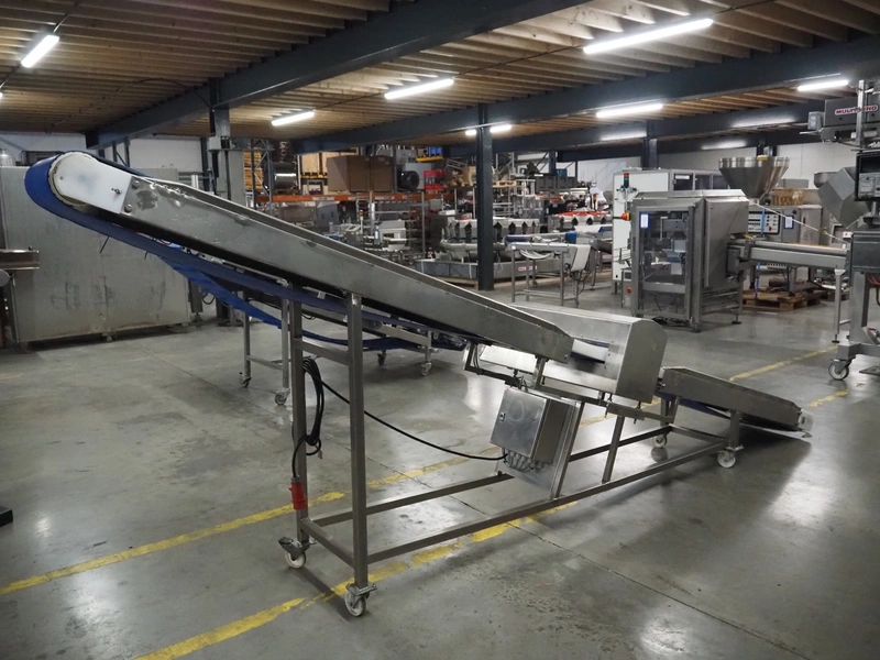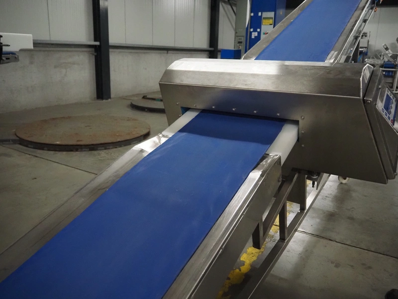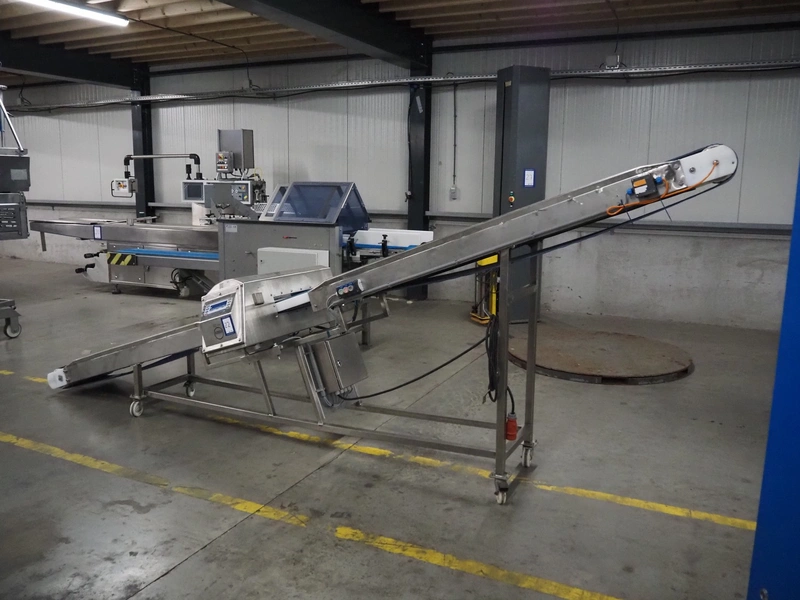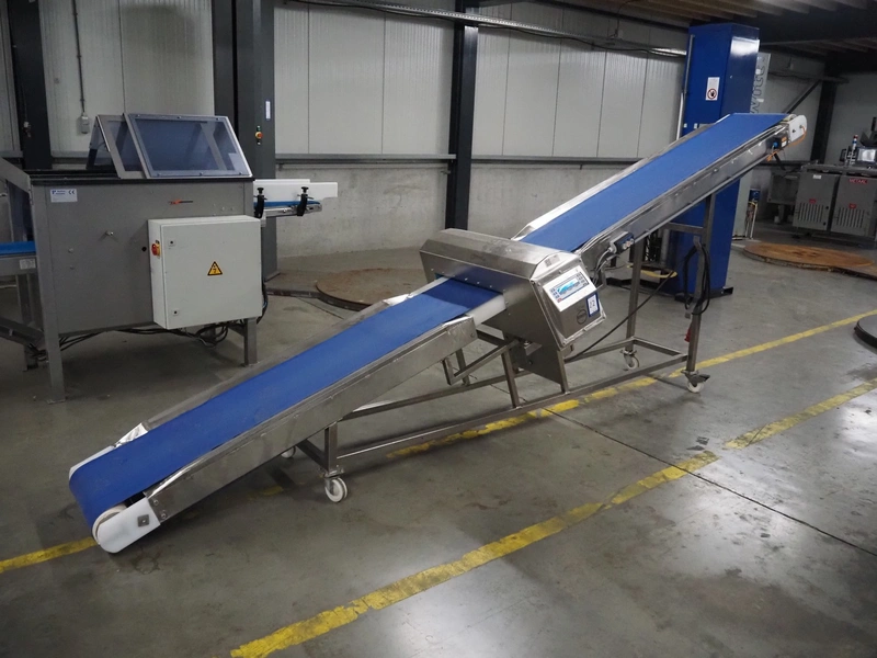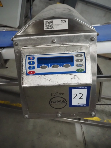 Loma Systems metal detector on mobile elevating belt, type: Blue IQ3 ST, serial number: Q3B55-10-28060D, year of construction: 17.3.2015, 110-240 V, 1 Ph, 50/60 Hz, 0.3-0.6 A, plastic belt, belt width: 410, clearance: 550 mm x 30 mm, elevating height: 1750 mm, total dimensions: 4600 mm x 1030 mm x 1760 mm.