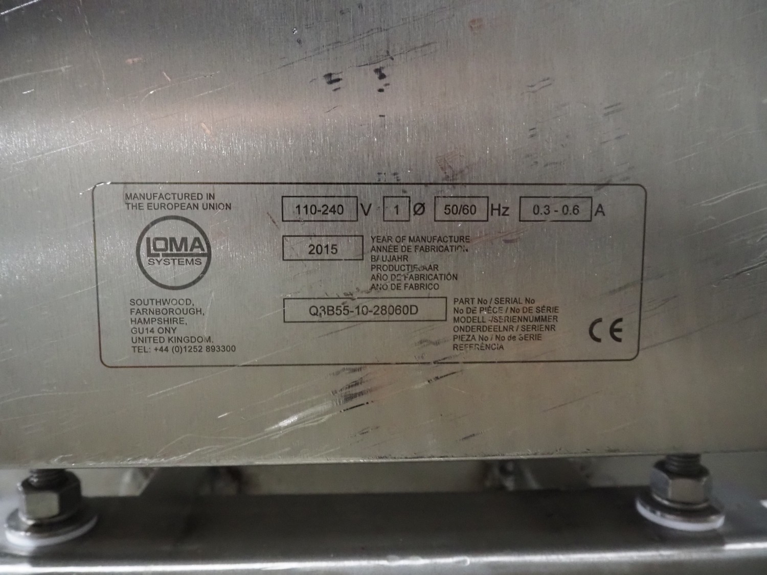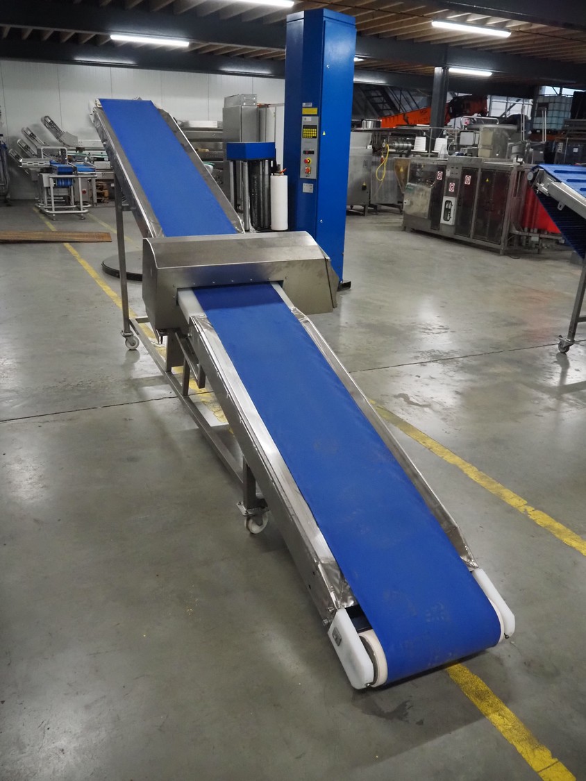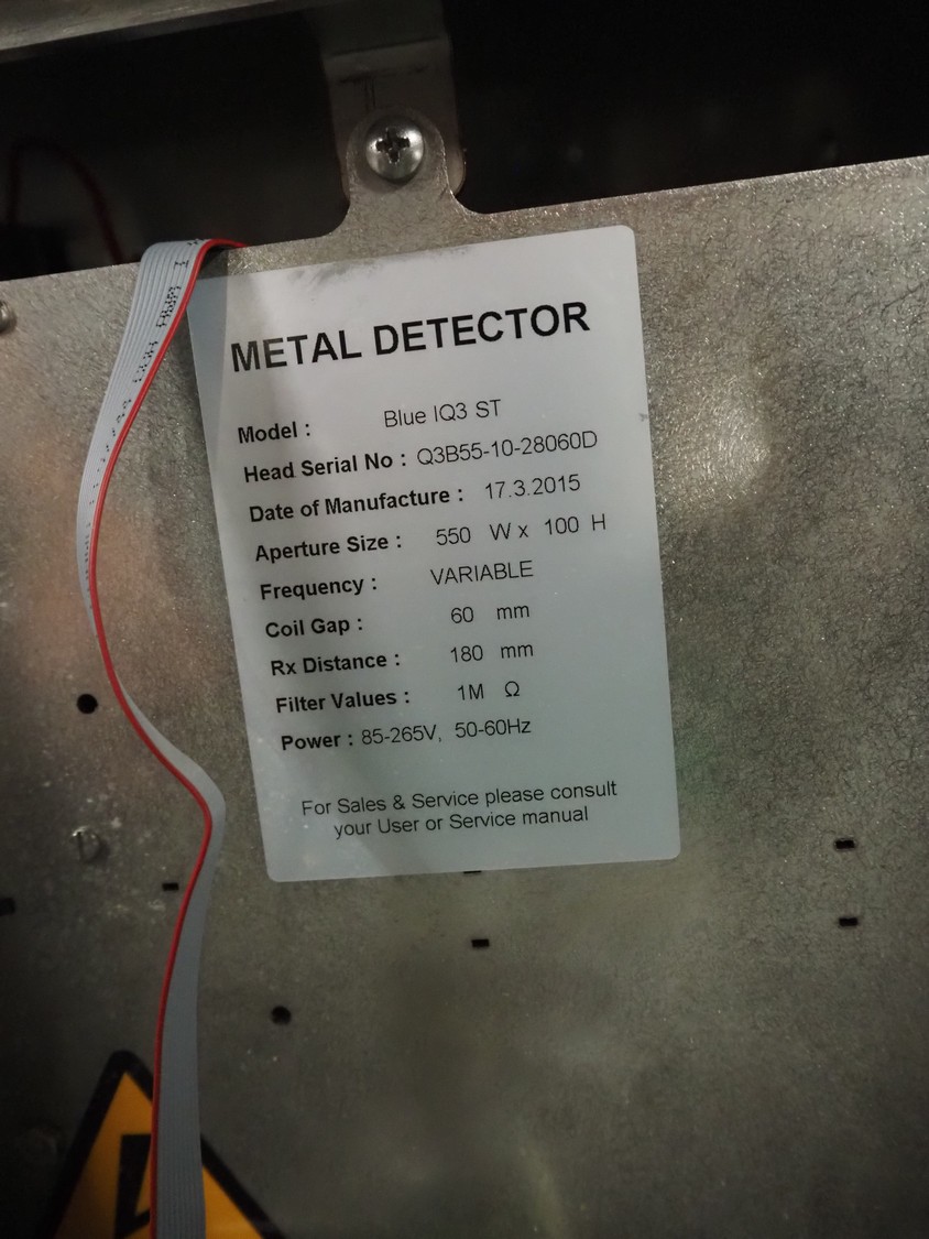 Loma Systems metal detector on mobile elevating belt, type: Blue IQ3 ST, serial number: Q3B55-10-28060D, year of construction: 17.3.2015, 110-240 V, 1 Ph, 50/60 Hz, 0.3-0.6 A, plastic belt, belt width: 410, clearance: 550 mm x 30 mm, elevating height: 1750 mm, total dimensions: 4600 mm x 1030 mm x 1760 mm.