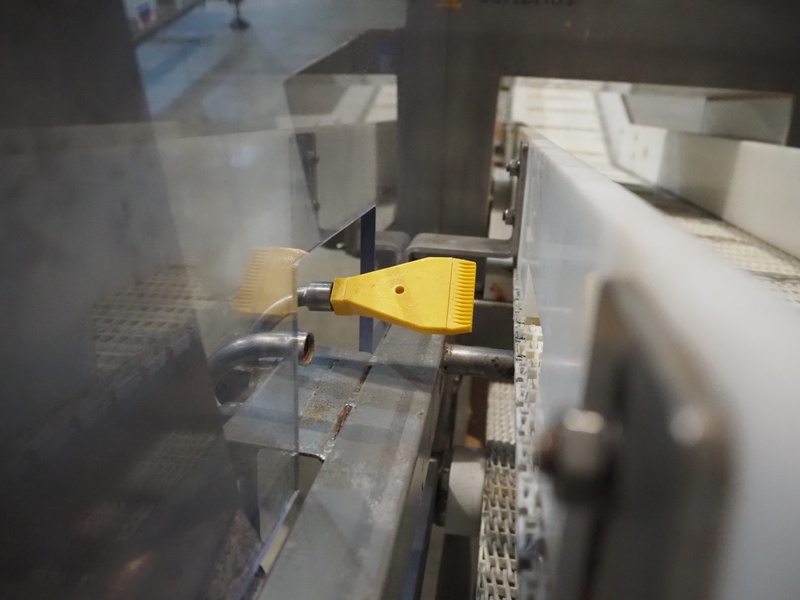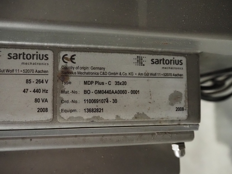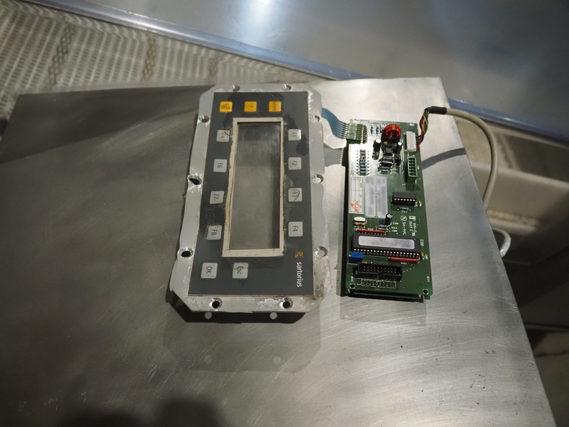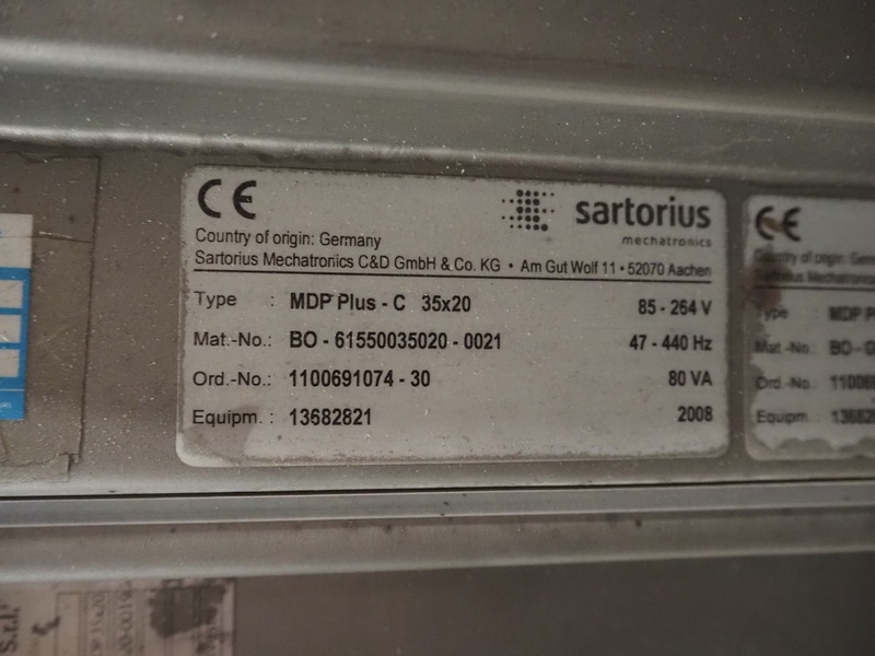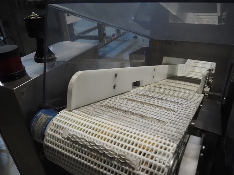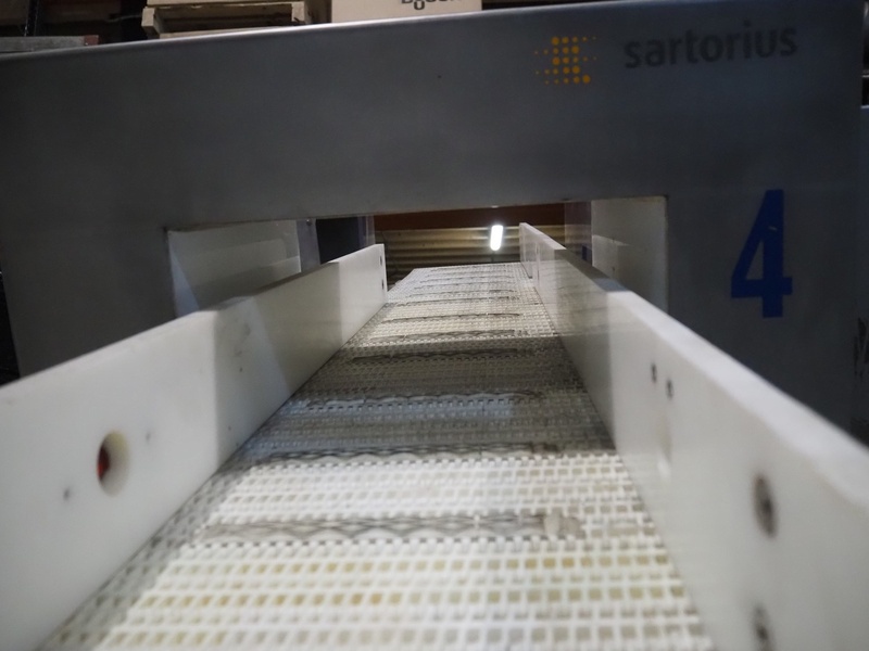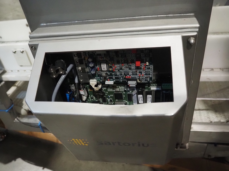 Sartorius metaldetector on elevating belt, plastic mesh belt, belt width: 304 mm, clearance: 350 mm x 160 mm, elevating height: 950 mm, total dimensions: 2900 mm x 1150 mm x 2220 mm. Incomplete.