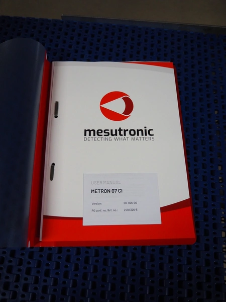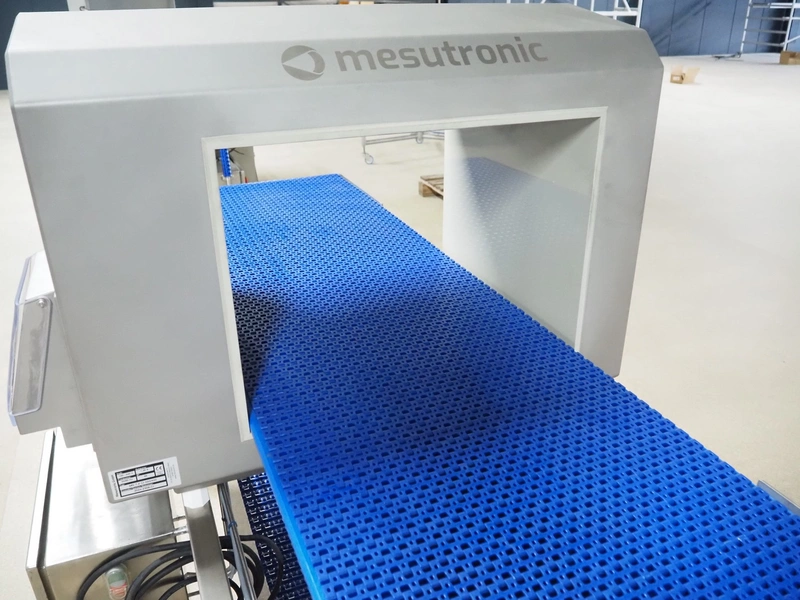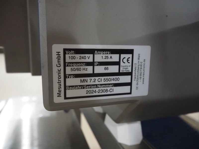 Mesutronic GmbH mobile metal detector with rejector, type: MN 7.2 CI 550/400, serial number: 2308-CI, year of construction: 2024, 100-240 V, 50/60 Hz, 1.25 A, plastic mesh belt, belt width: 520 mm, clearance: 550 mm x 370 mm, total dimensions: 2250 mm x 1000 mm x 1400 mm.